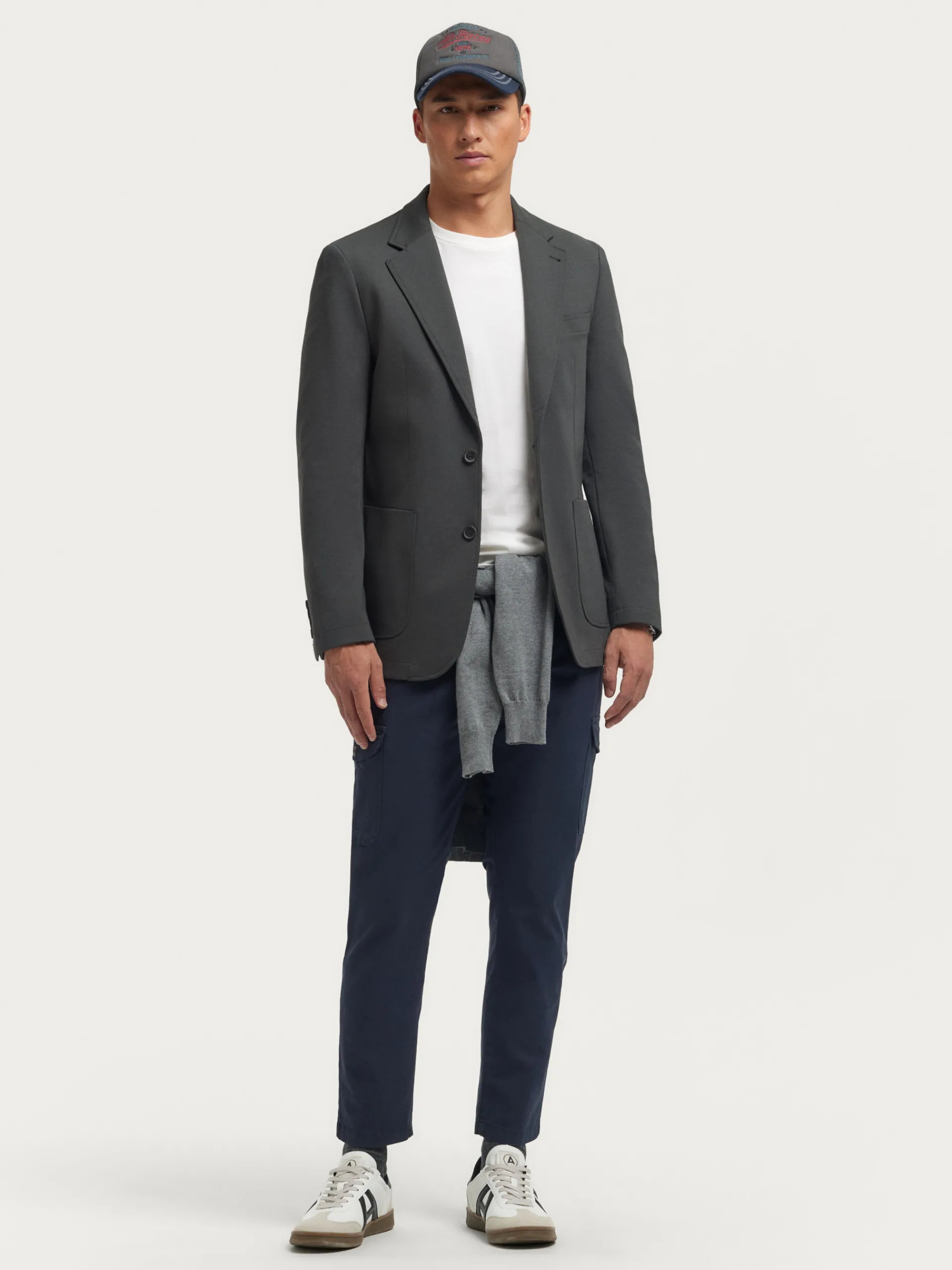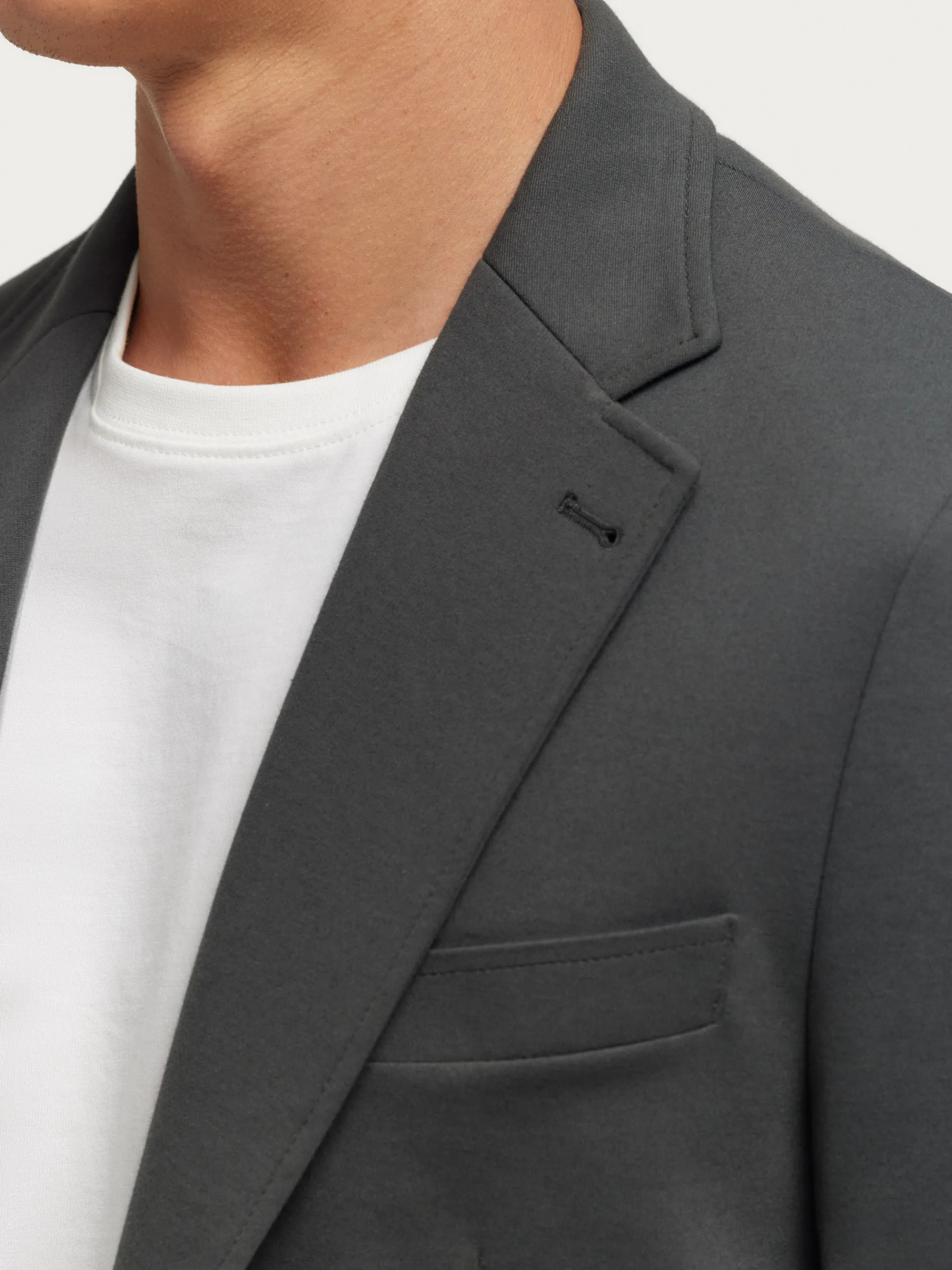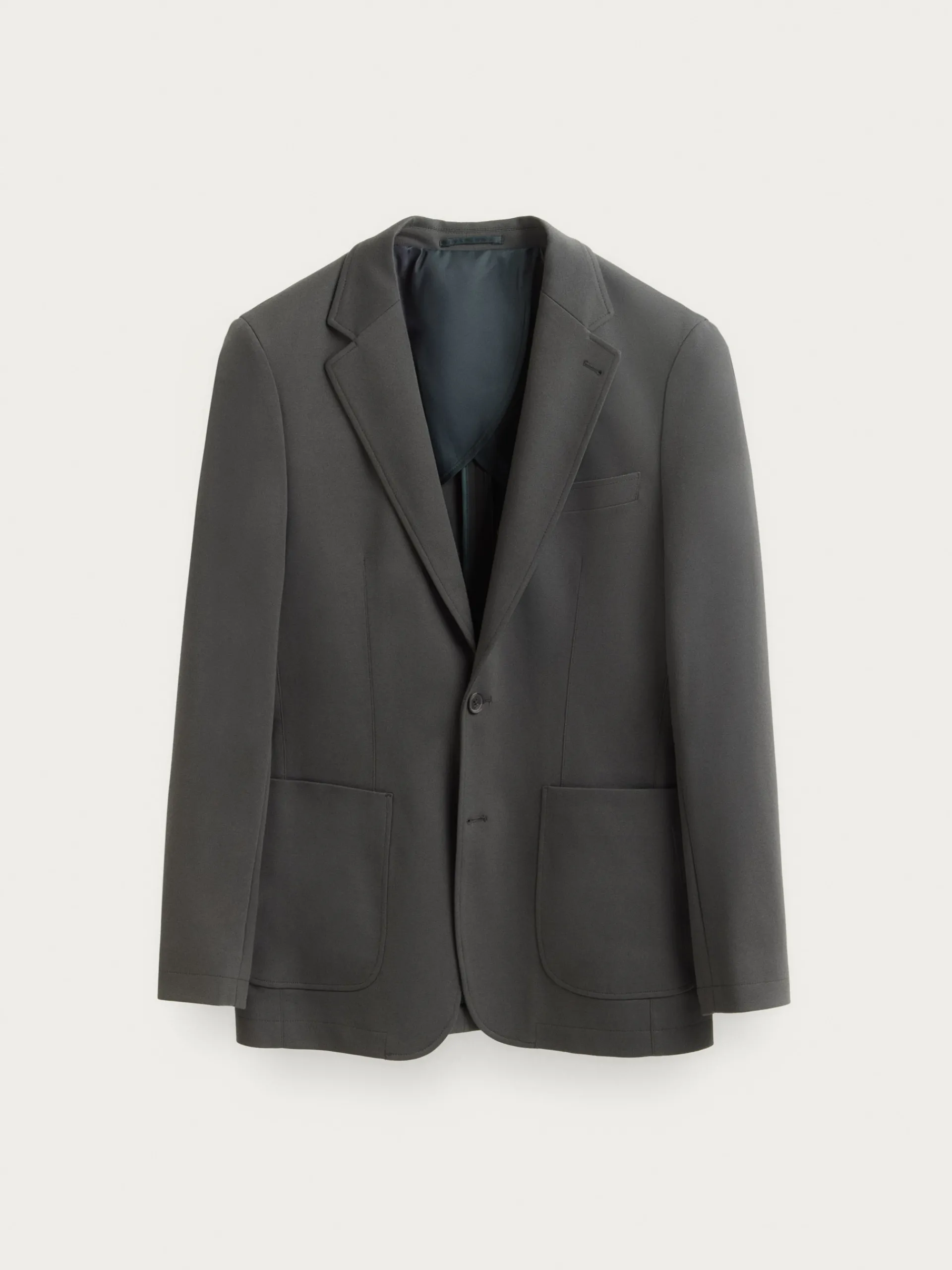 Americana confeccionada en tejido de punto de corte slim fit. Cuenta con cuello y solapa, cierre central simple mediante dos botones y puños con botones decorativos. Pinzas en el frontal, dos bolsillos de parche en la cintura y un bolsillo a la altura del pecho. Dos bolsillos en su interior.