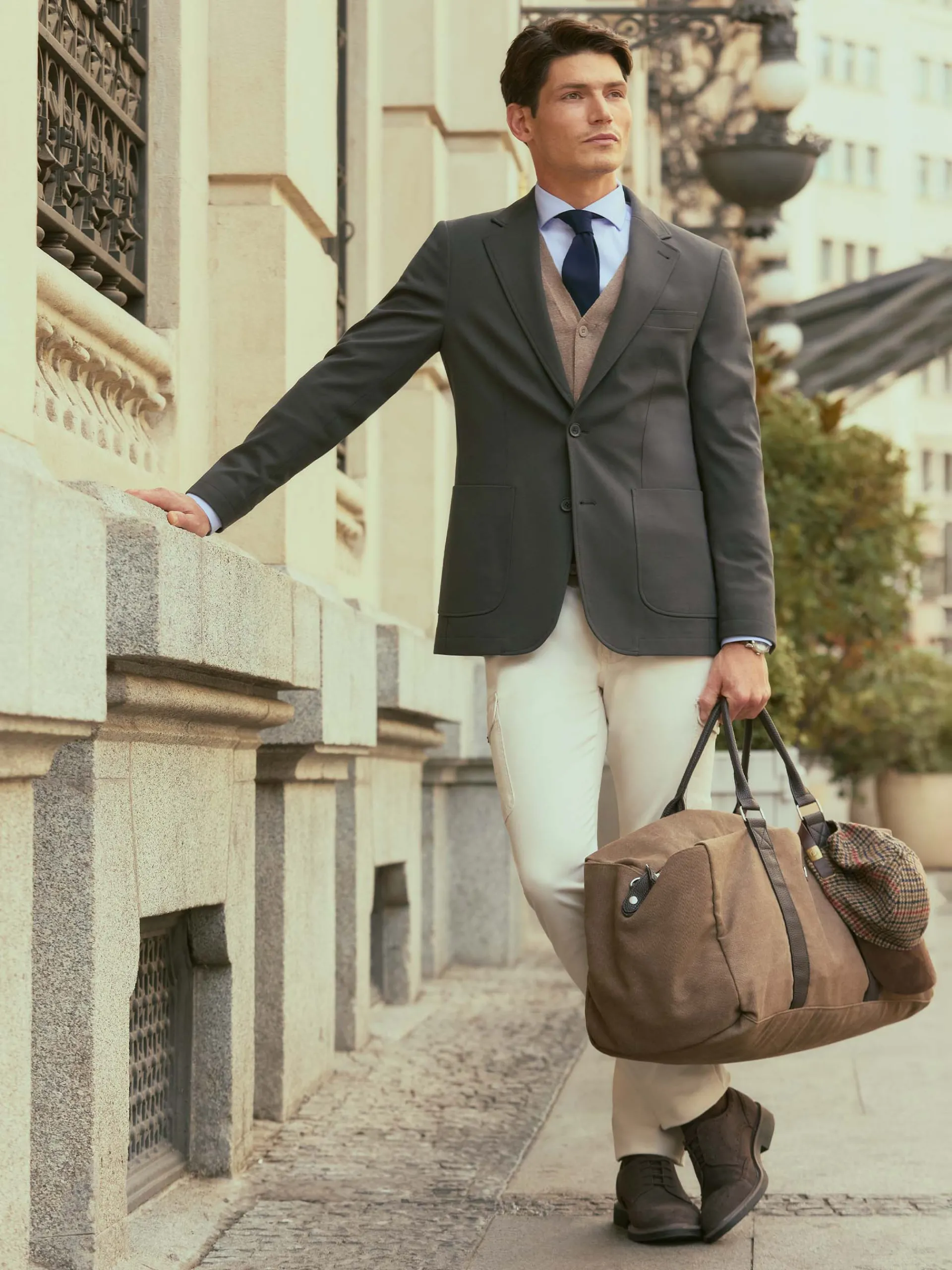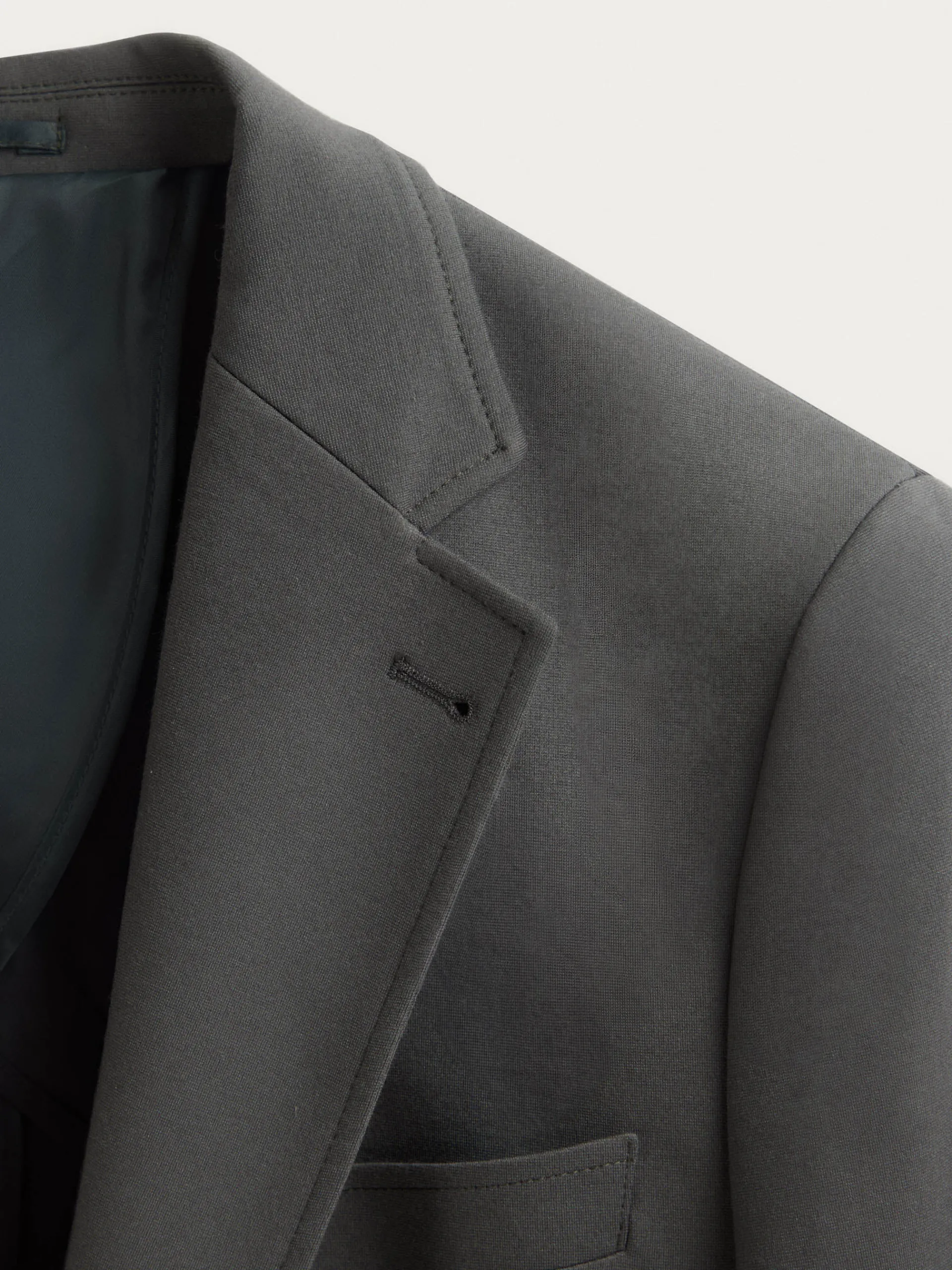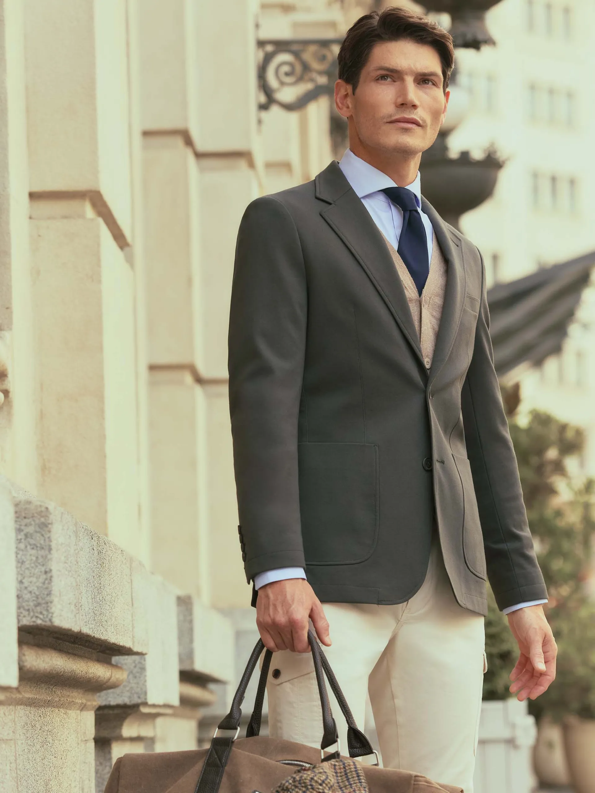 Americana confeccionada en tejido de punto de corte slim fit. Cuenta con cuello y solapa, cierre central simple mediante dos botones y puños con botones decorativos. Pinzas en el frontal, dos bolsillos de parche en la cintura y un bolsillo a la altura del pecho. Dos bolsillos en su interior.