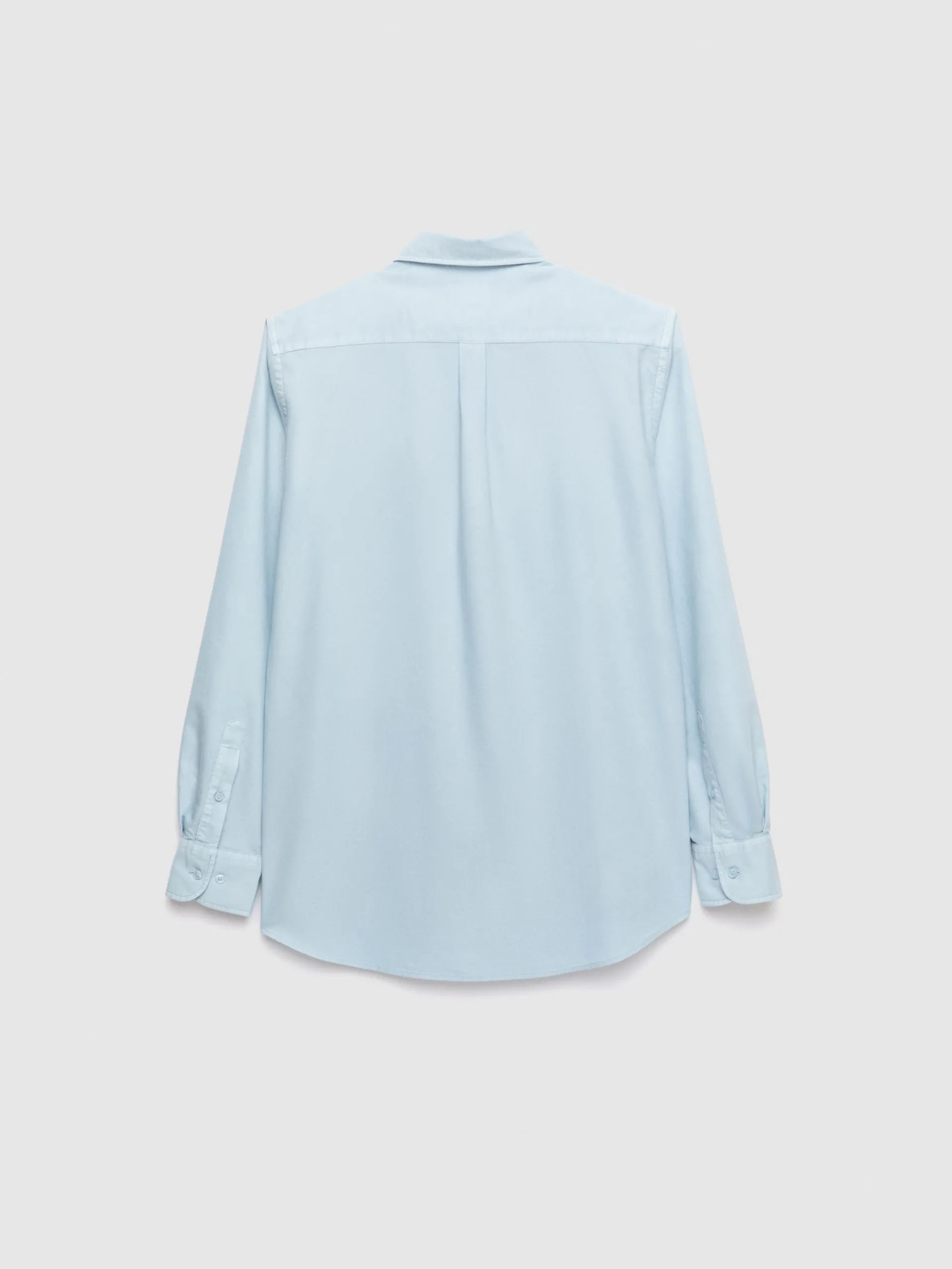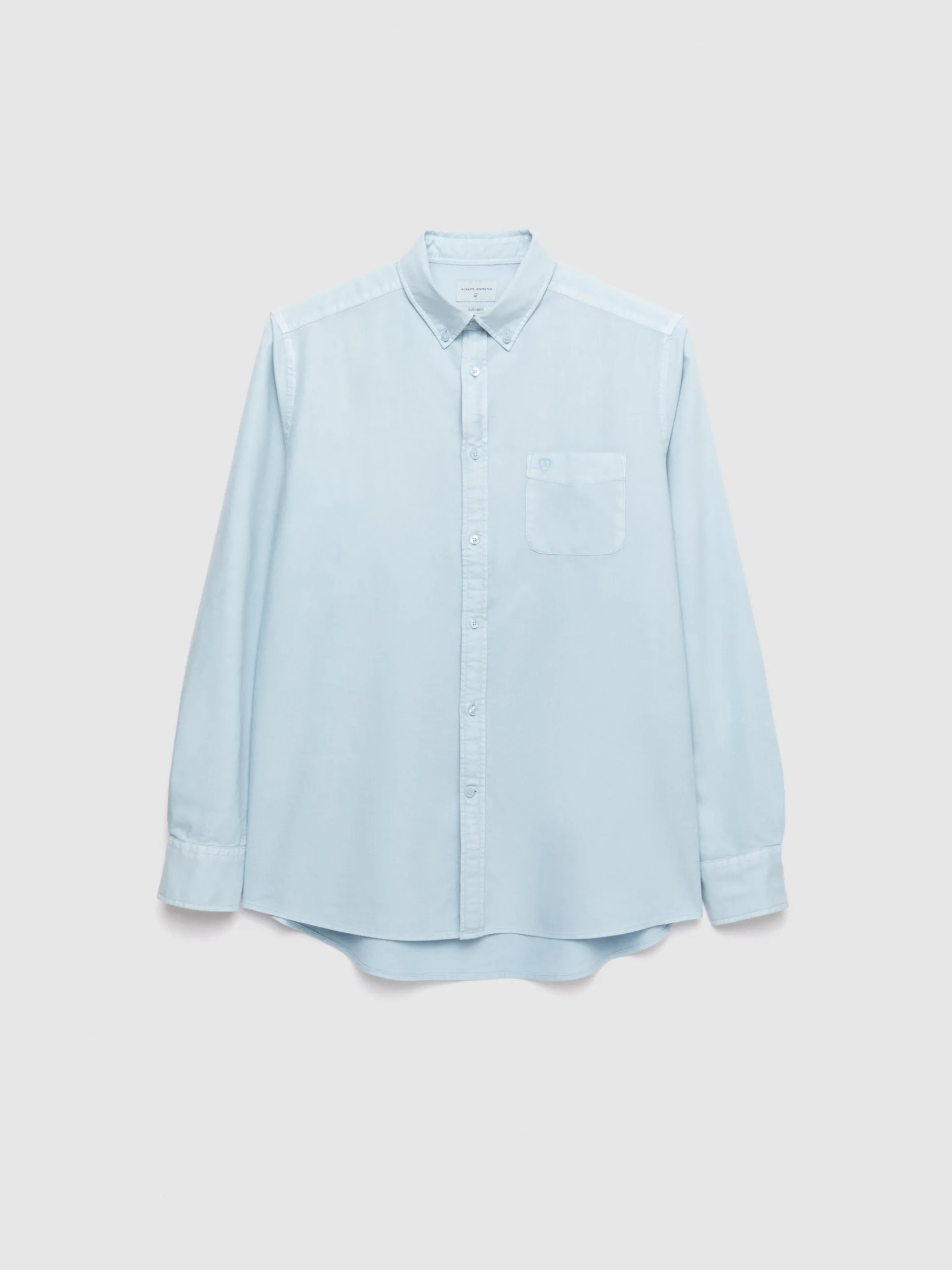 Camisa confeccionada en algodón con cuello clásico de botón, bolsillo en el frontal y manga larga de puños simples. Corte regular fit.
