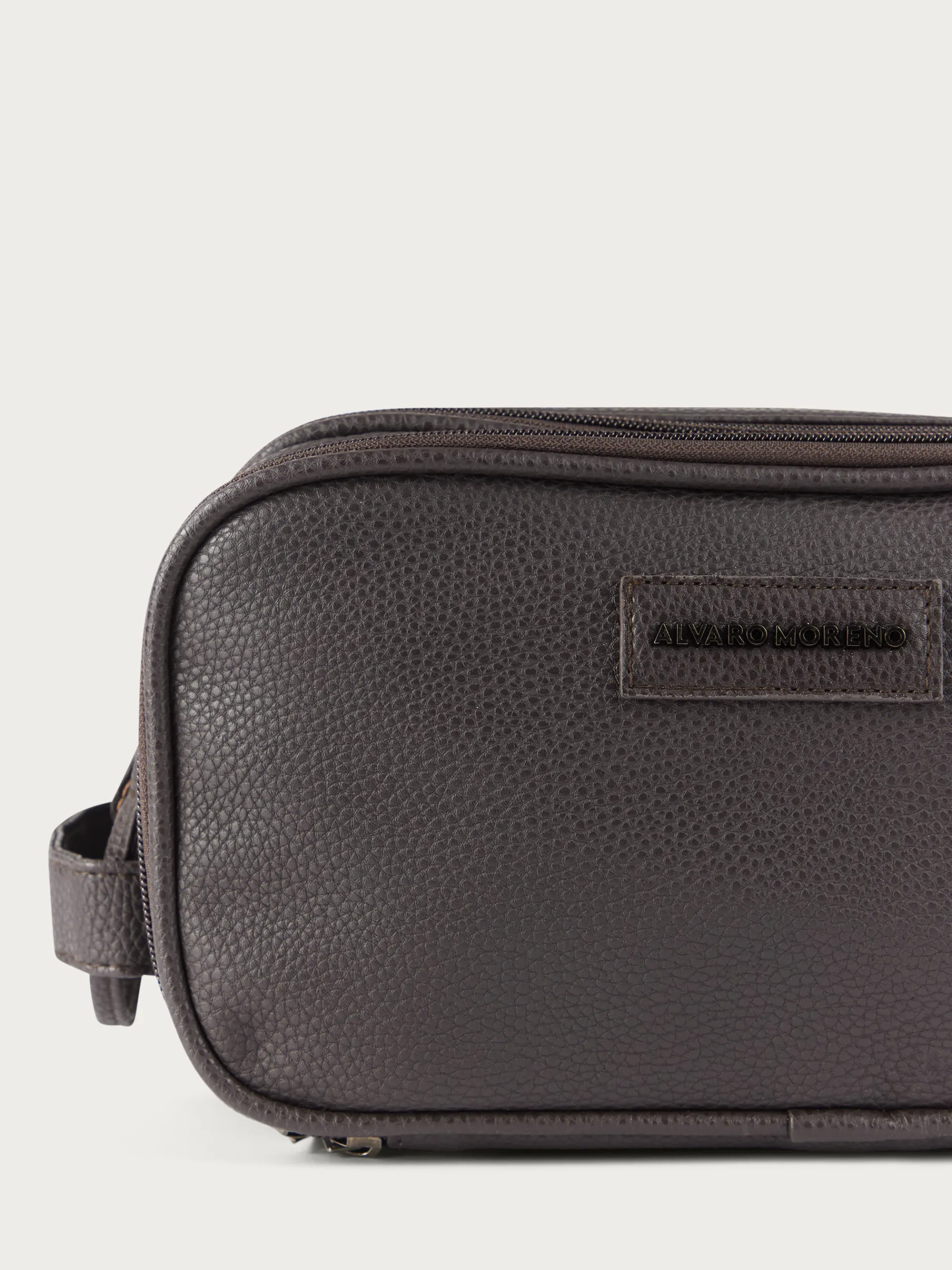 Neceser con asa de transporte lateral y detalle personalizado grabado en el frontal. Compartimento principal con cierre de doble cremallera y botón a presión. Compartimento en ambos laterales con cierre de cremallera. Forrado en su interior.