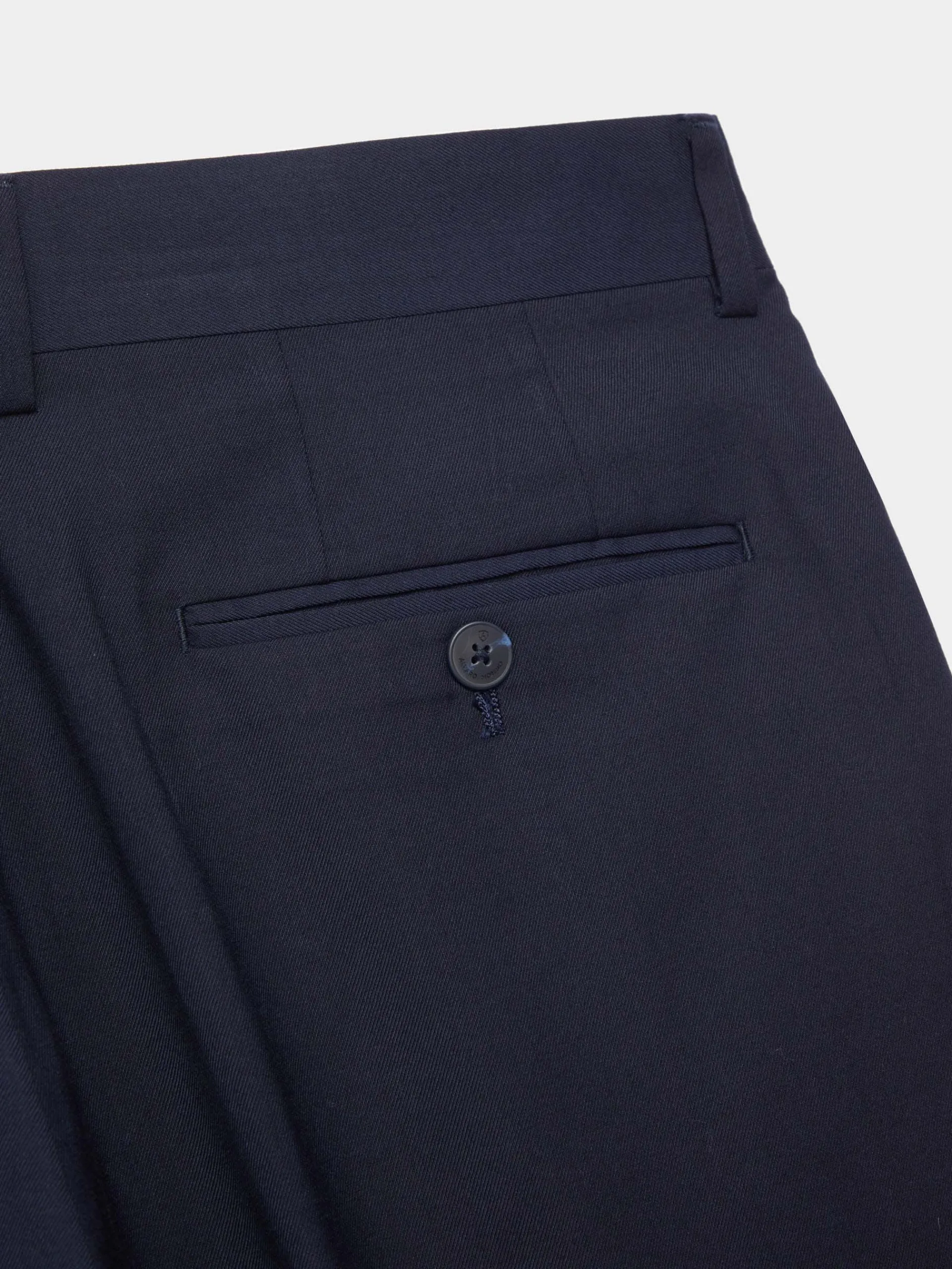 Pantalón de traje que cuenta con cierre frontal de cremallera y botones, dos bolsillos abiertos en la parte delantera y dos bolsillos traseros con cierre mediante botón. Forrado en su interior.