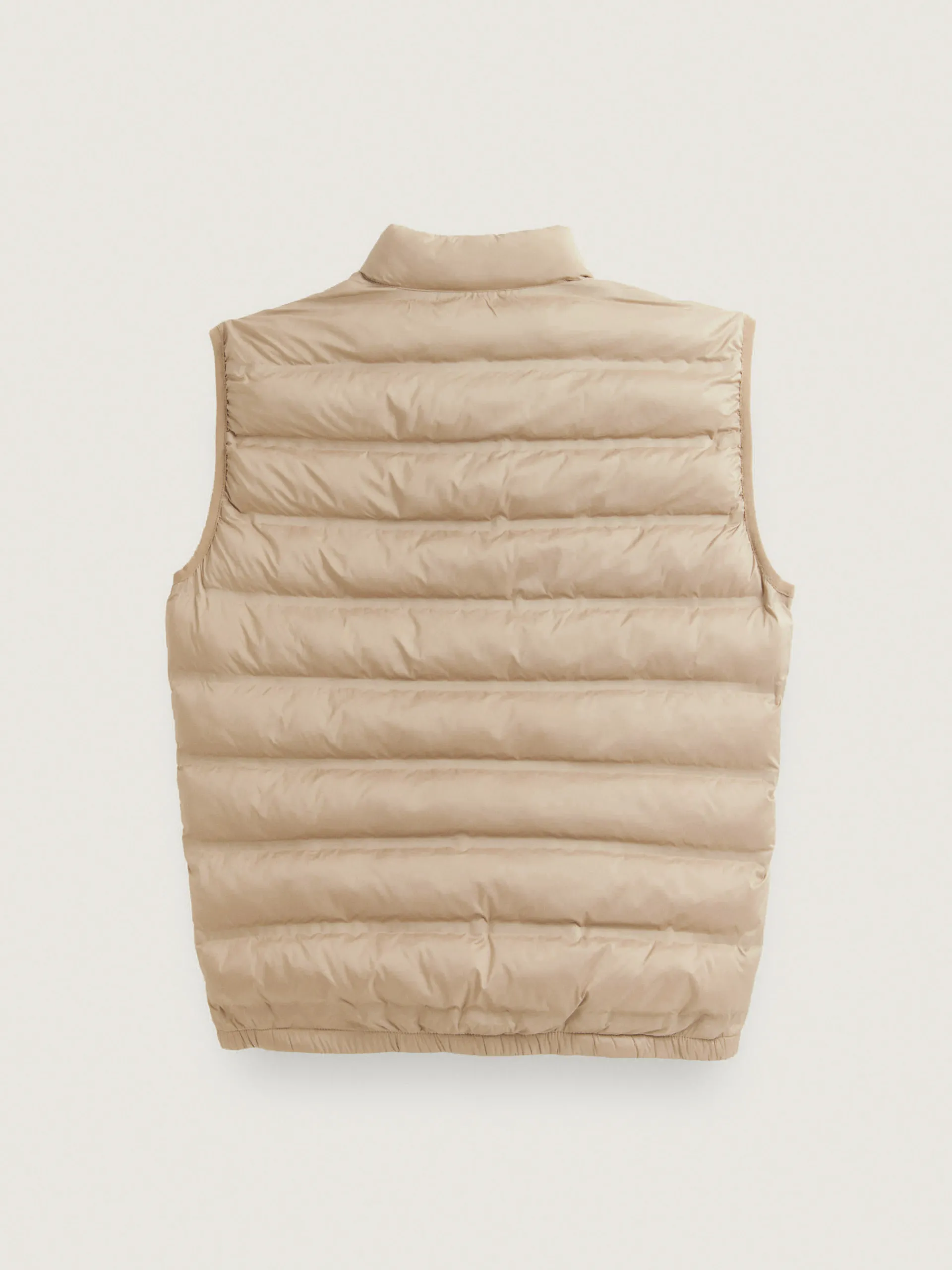 Chaleco acolchado con cuello subido y cierre central mediante cremallera, dos bolsillos a la altura de la cintura y logo de la marca grabado en el pecho al tono. Elástico en la sisa y cintura. Forro interior a contraste con bolsillos.