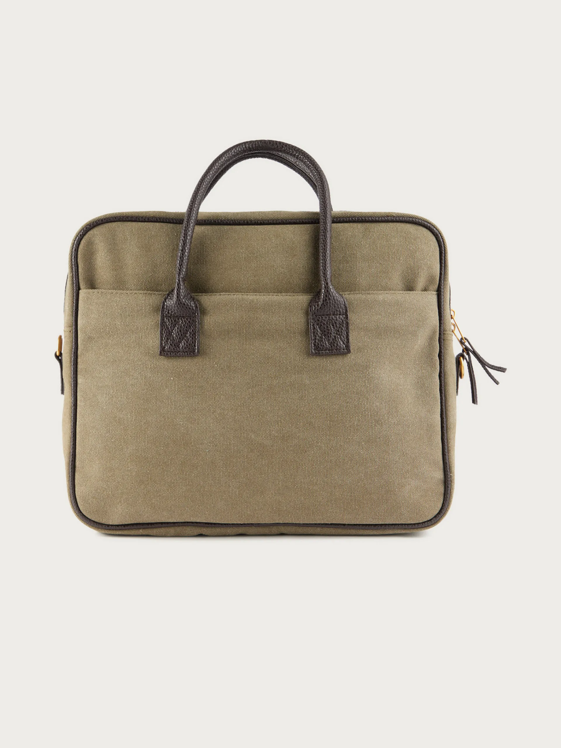 Maletín con asas superiores y correa desmontable por mosquetones. Cuenta con un amplio compartimento principal de cierre mediante cremallera, bolsillo interior y dos bolsillos exteriores. Detalles personalizados en efecto piel. Forrado en su interior.