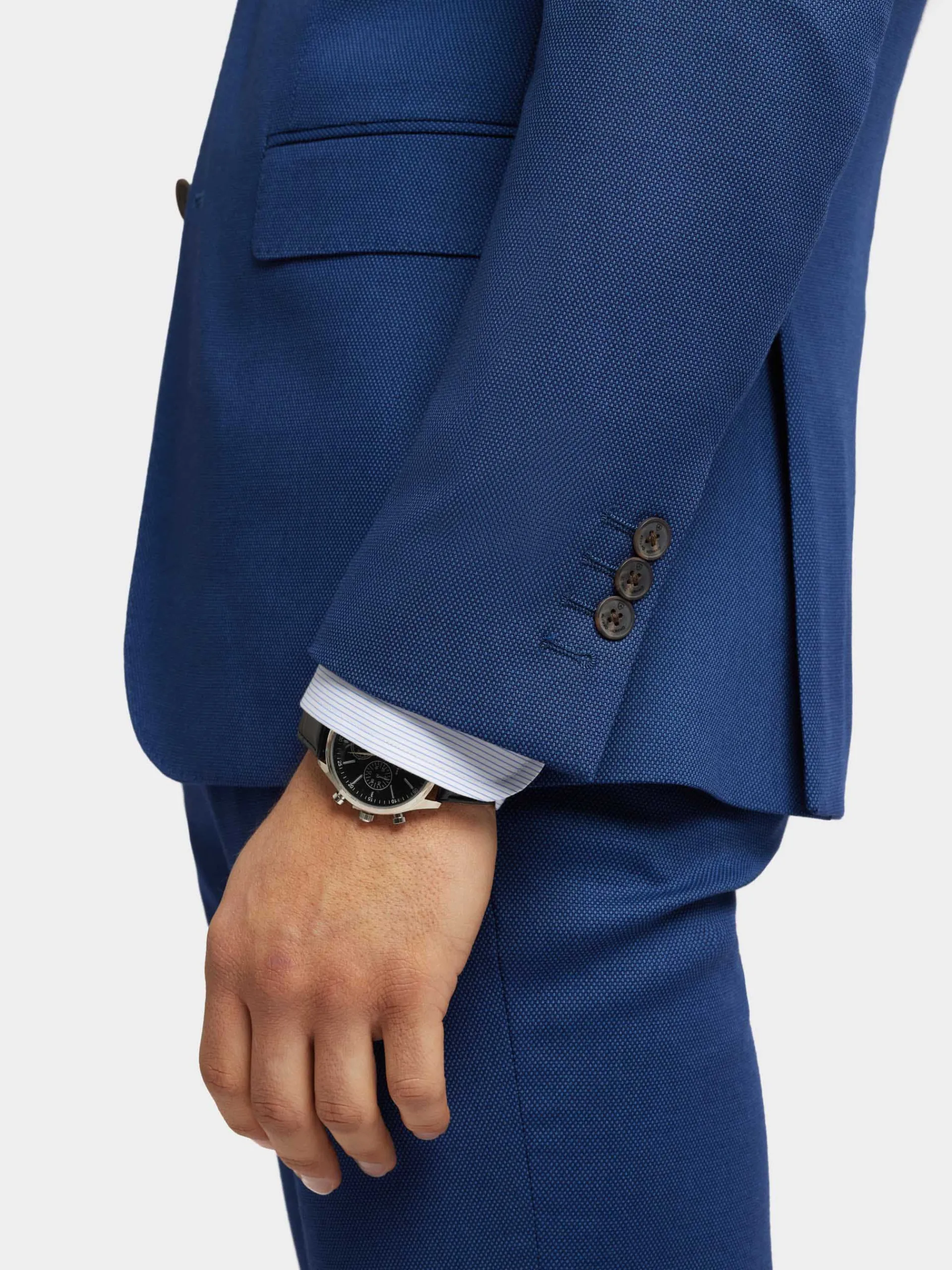 Americana con cuello y solapa en tejido de ojo de perdiz. Cierre central mediante botones, bolsillo de ojal en el pecho, tres bolsillos de solapa en la cintura y puños con botones decorativos. Interior forrado y con bolsillos.