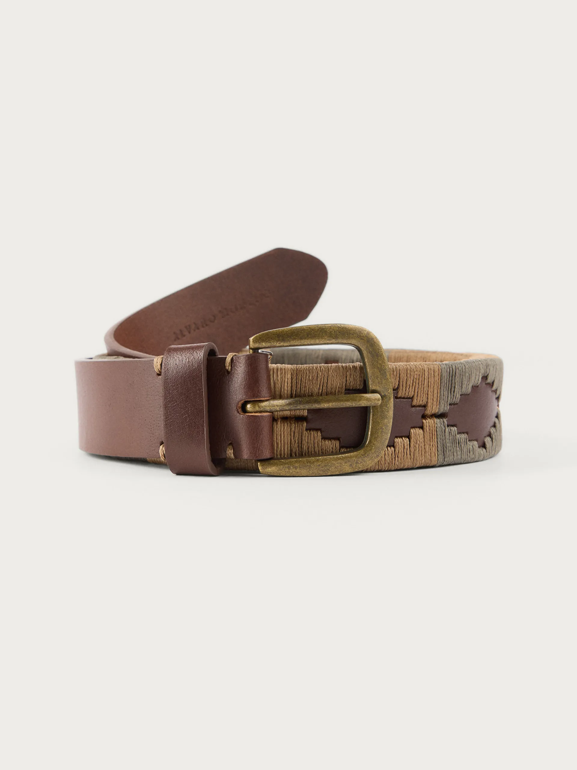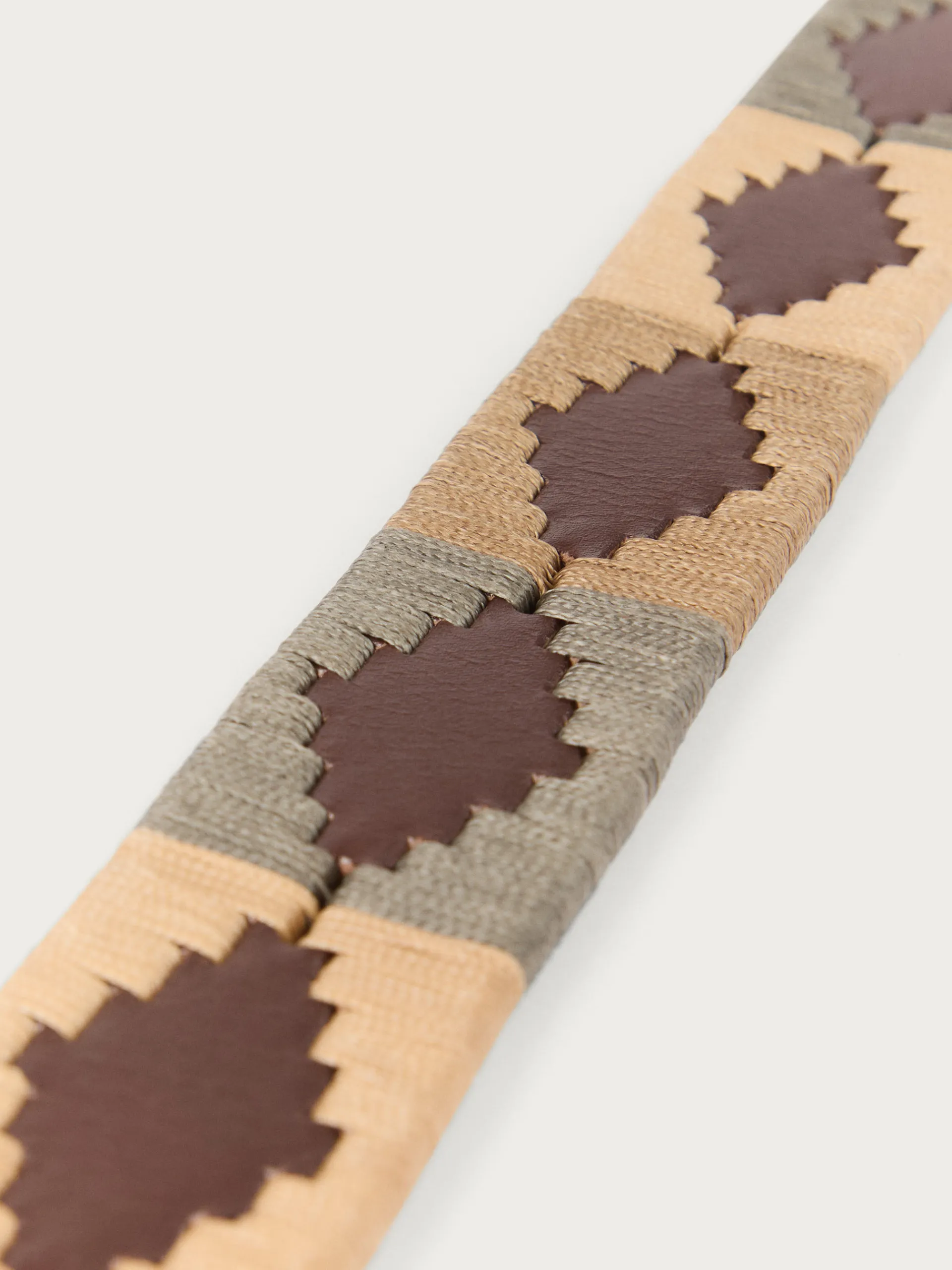Cinturón con detalles personalizados a contraste y cierre central mediante hebilla metálica y pasador.