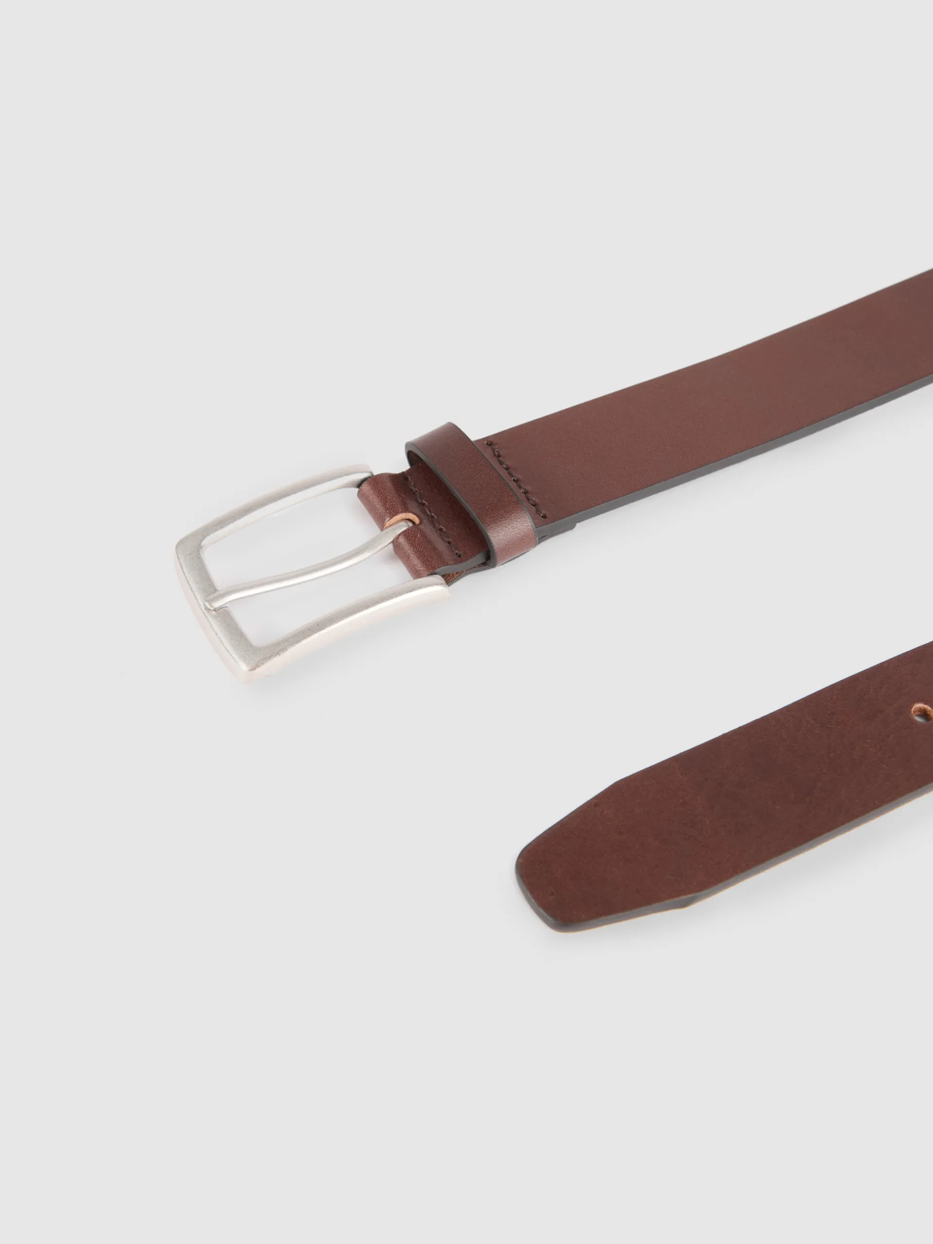 Cinturón listo estilo casual confeccionado en cuero con cierre mediante hebilla metálica a contraste y pasador al tono. Detalles y pespuntes al tono.