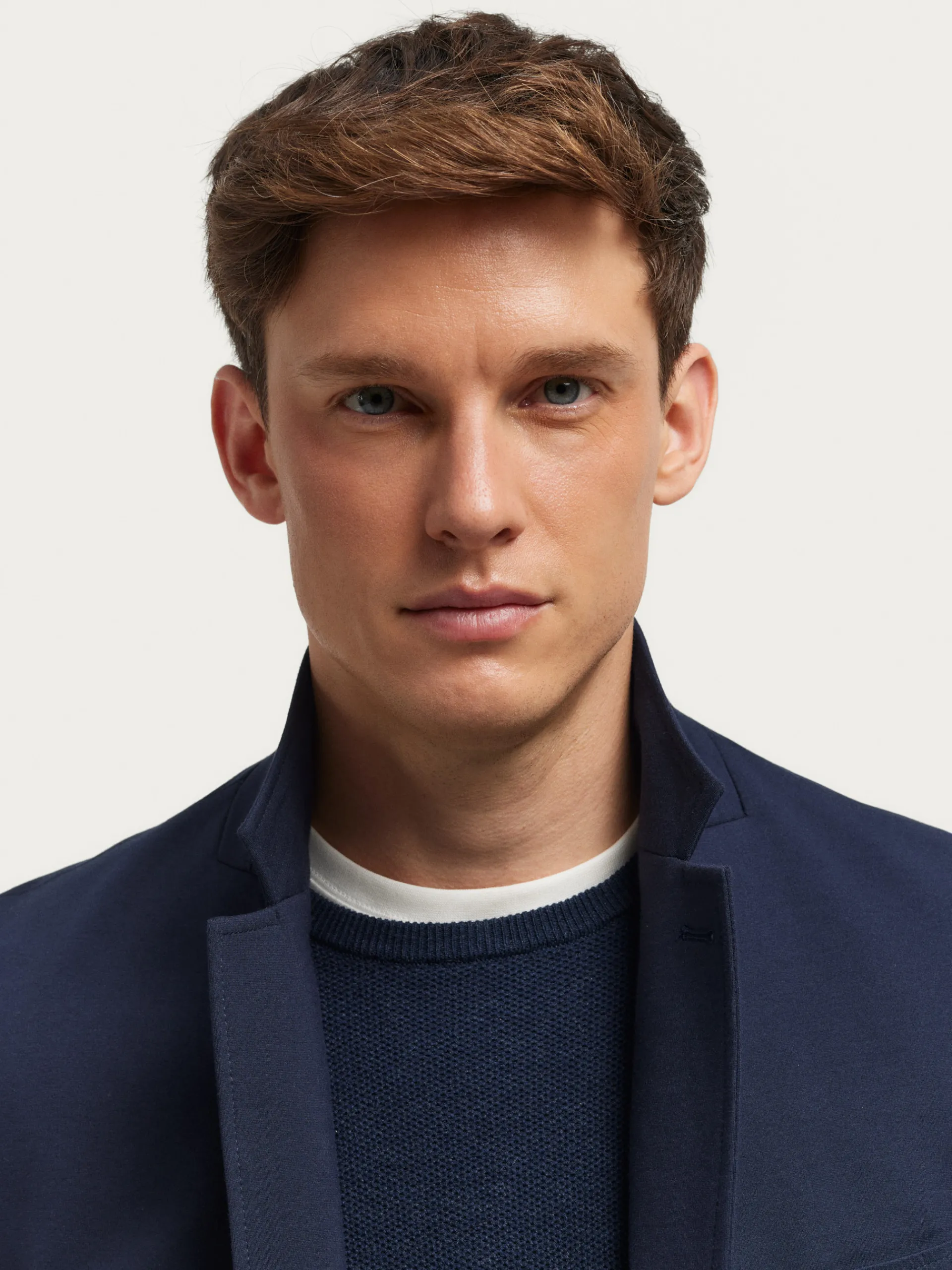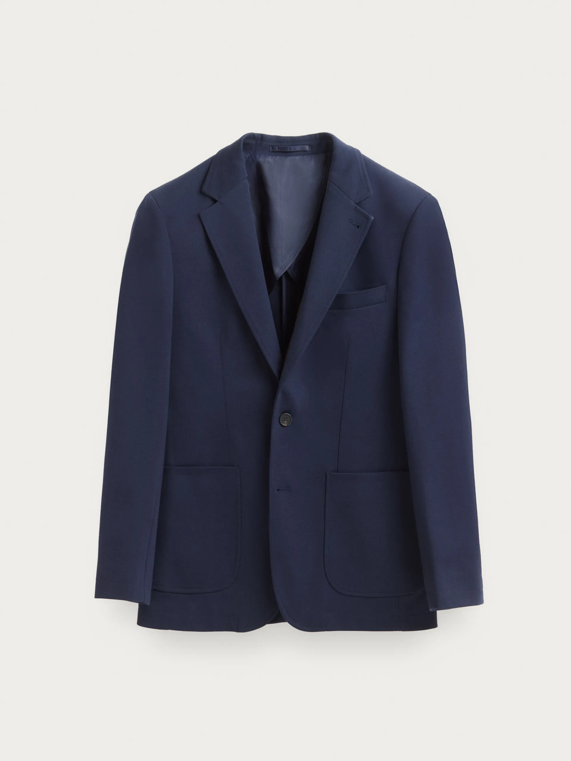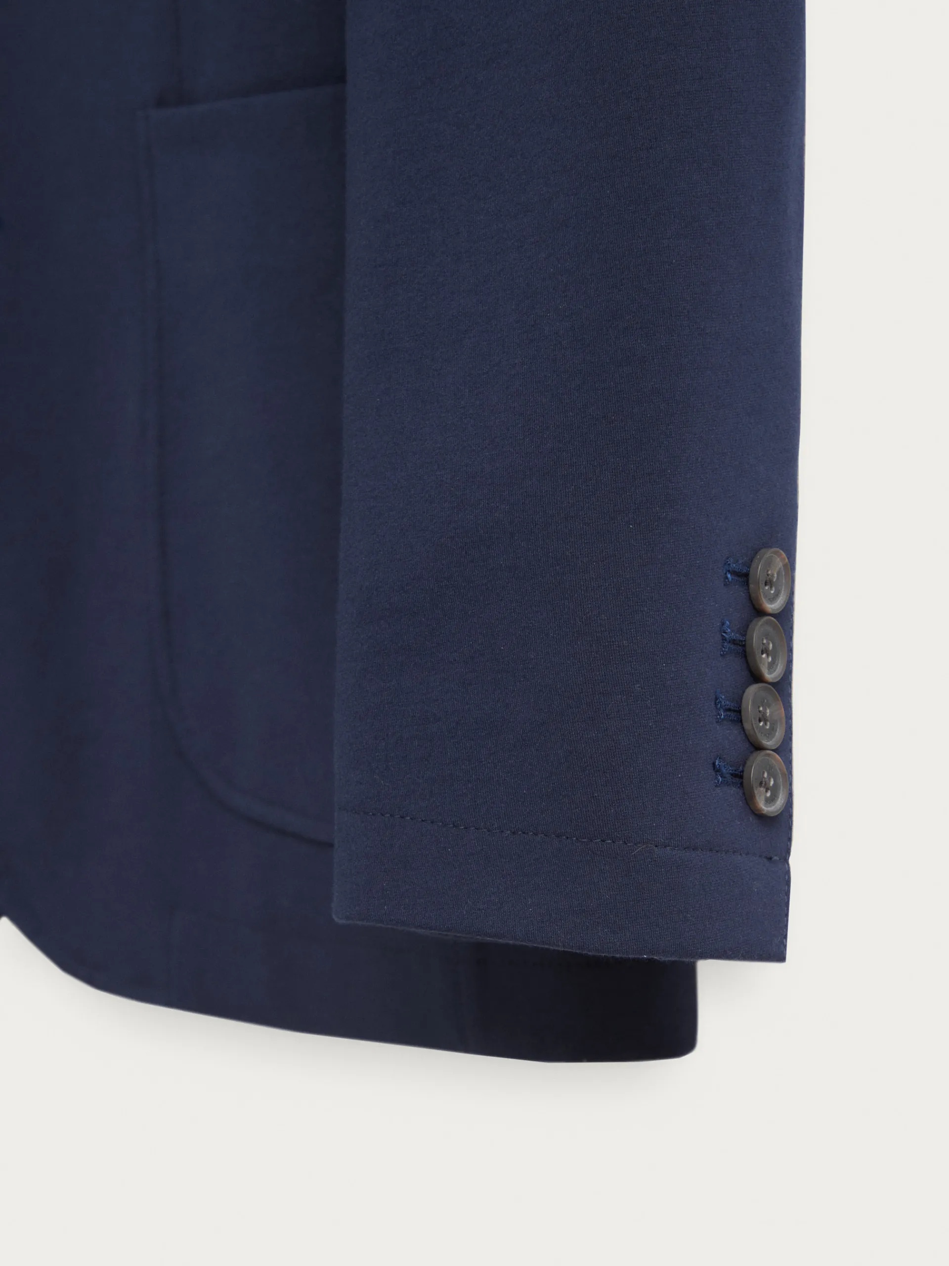 Americana confeccionada en tejido de punto de corte slim fit. Cuenta con cuello y solapa, cierre central simple mediante dos botones y puños con botones decorativos. Pinzas en el frontal, dos bolsillos de parche en la cintura y un bolsillo a la altura del pecho. Dos bolsillos en su interior.