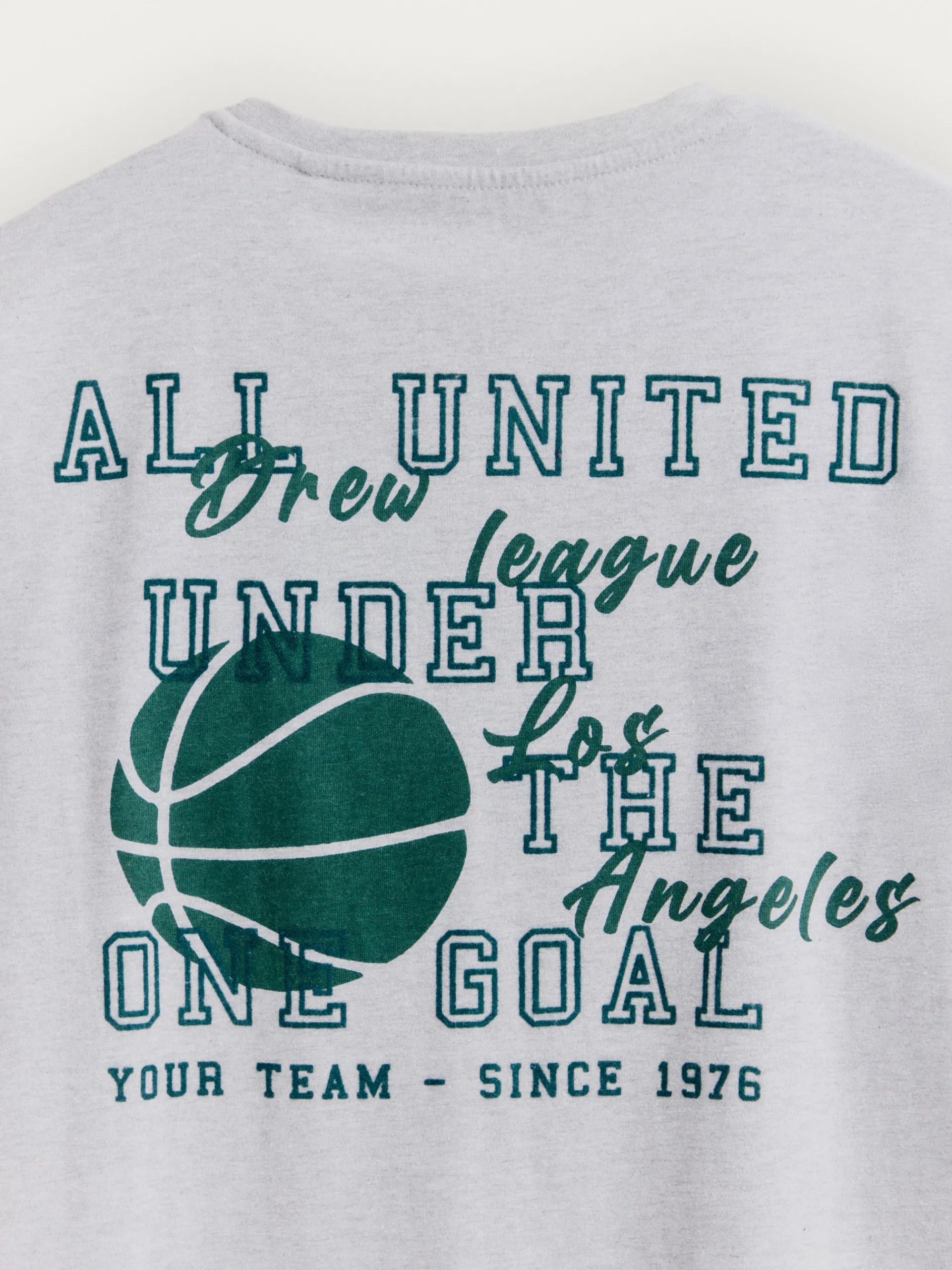 Camiseta de corte relaxed fit aportando un corte más relajado. Cuenta con estampado personalizado en el frontal y en la parte trasera, cuello redondo y manga corta ligeramente más anchas y largas.