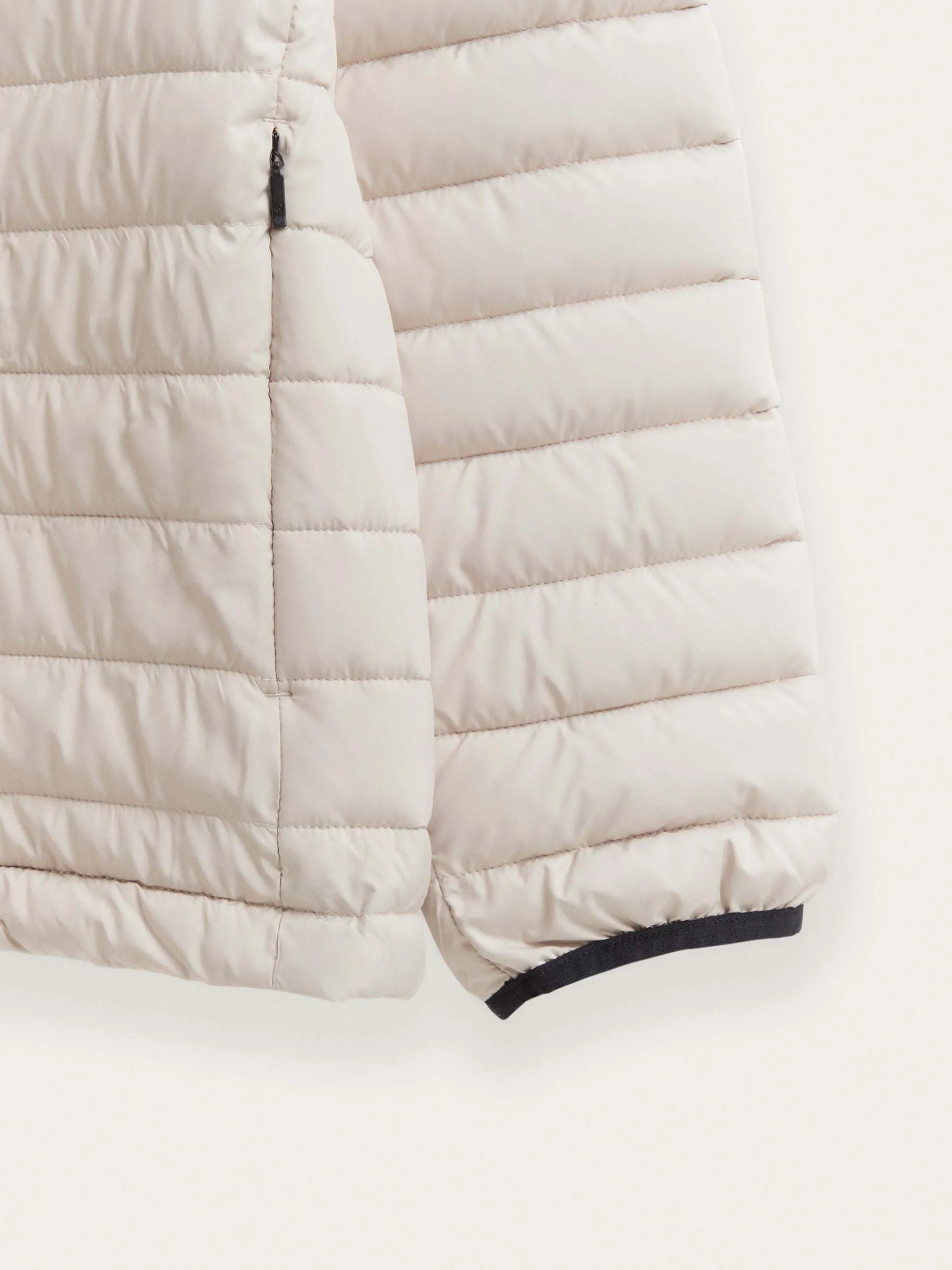 Cazadora acolchada con cuello subido, cierre central mediante doble cremallera, manga larga con puños elásticos y dos bolsillos en la cintura con cierre mediante cremallera. Detalle personalizado en una de sus mangas.