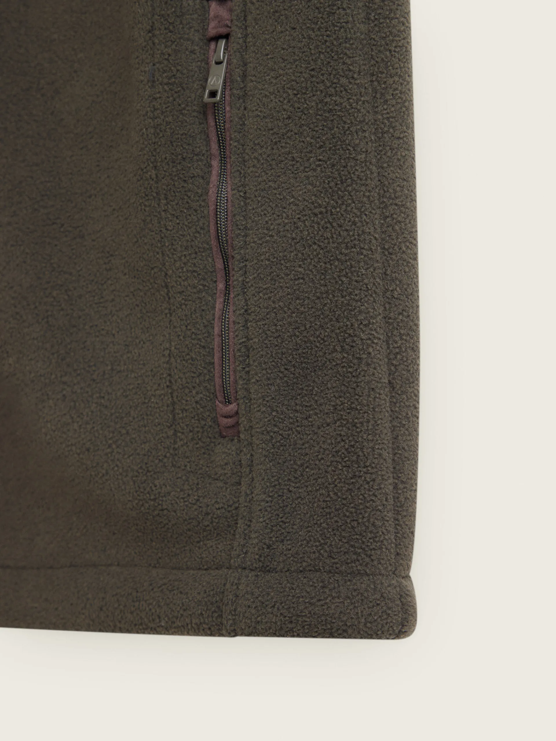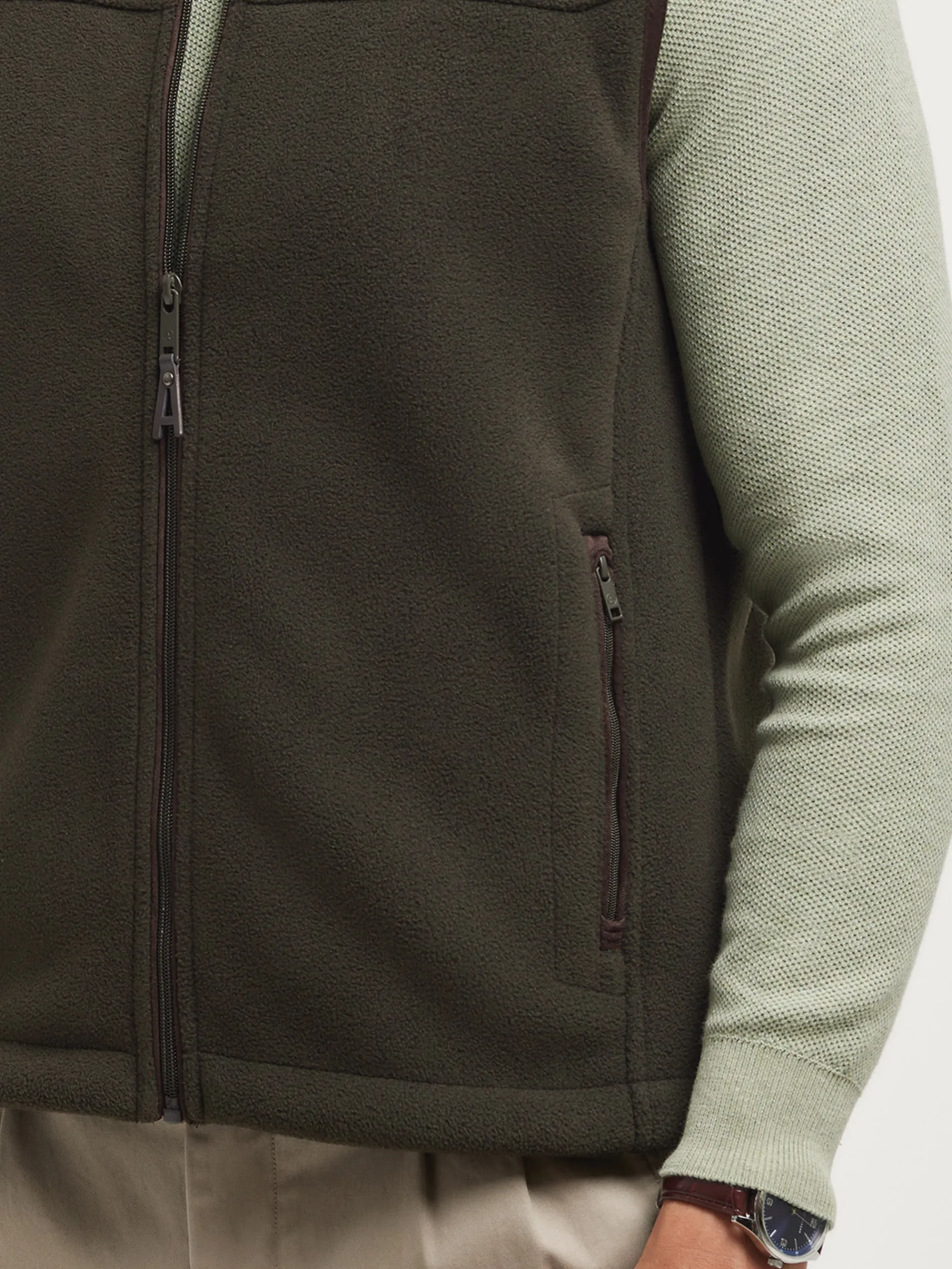 Chaleco confeccionado en tejido avivado en antelina en su exterior y forrado en su interior en borreguillo. Cuenta con cierre central mediante cremallera personalizada, dos bolsillos en su exterior y logo grabado en su frontal. Corte regular fit.
