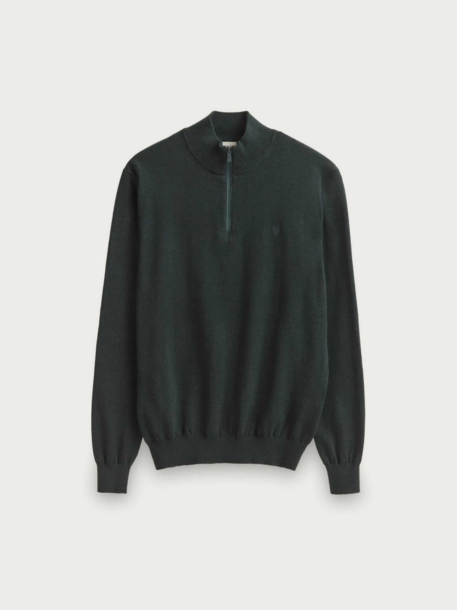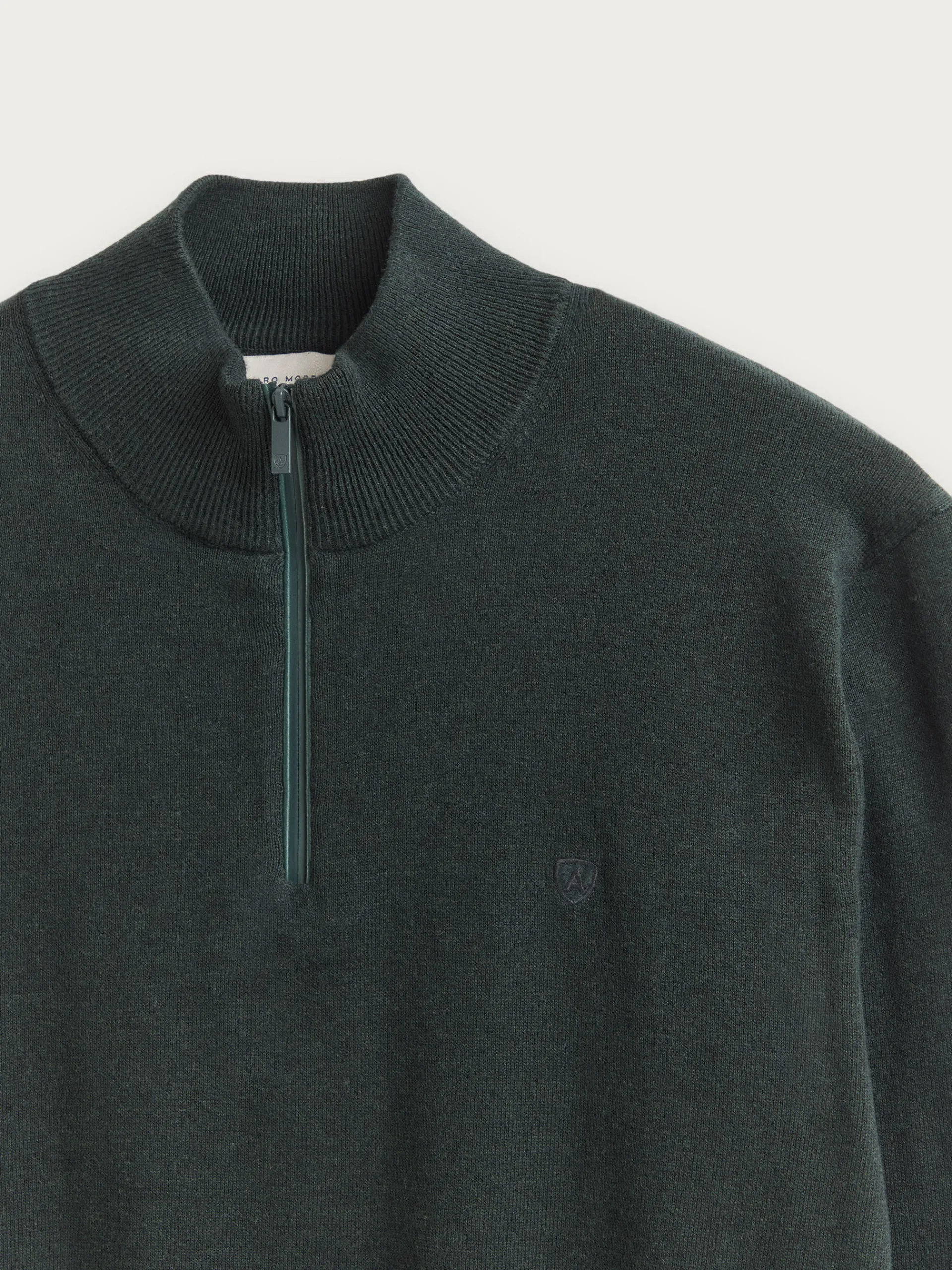 Jersey de corte regular confeccionado en algodón. Cuello alto con medio cierre de cremallera. Logo bordado en el frontal al tono. Cuello, puños y bajo en acabado elástico.