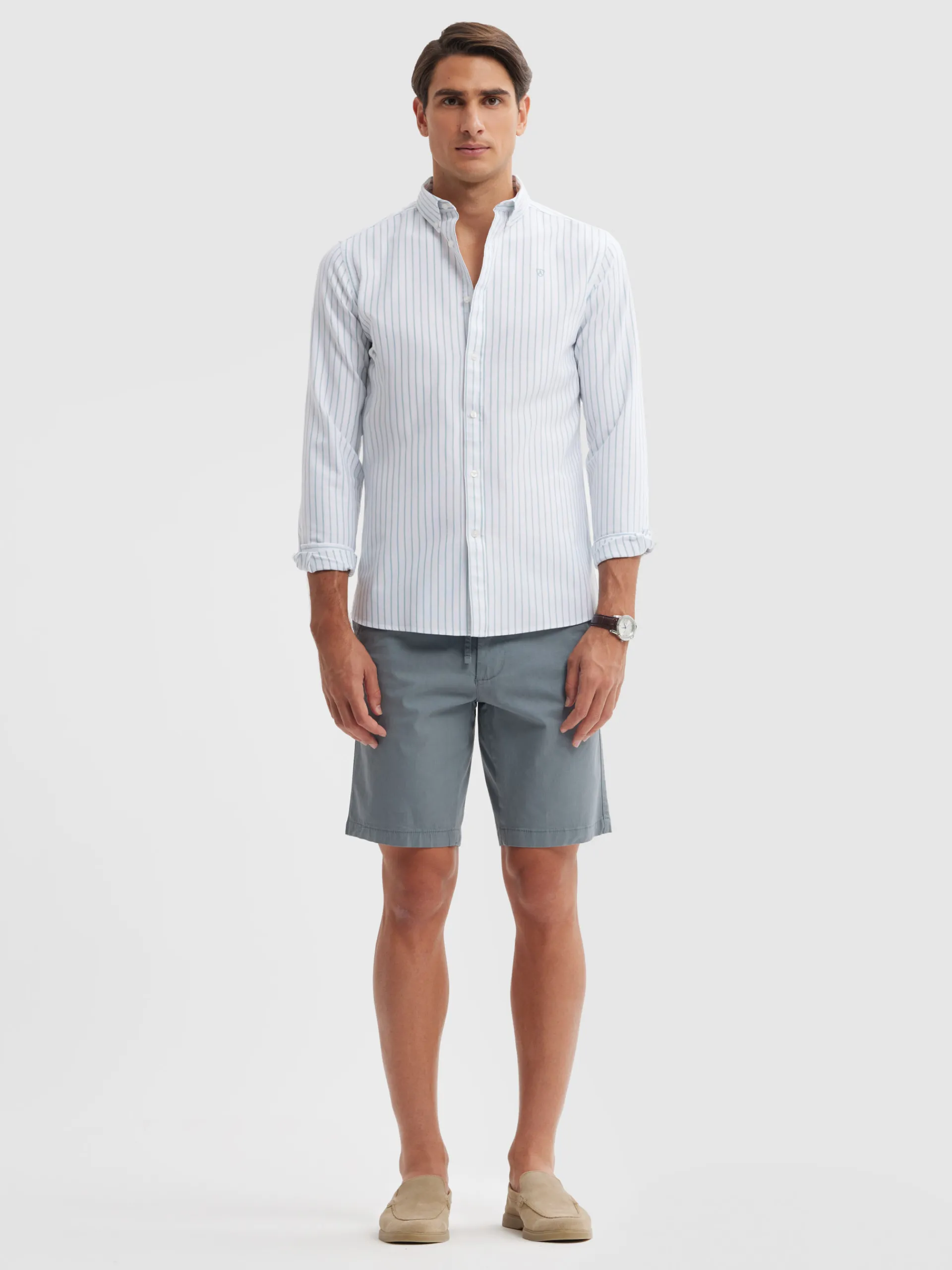 Camisa estilo a rayas confeccionada en algodón. Cuenta con cuello botón, manga larga de puños simples y logo grabado al tono en el frontal. Corte regular fit.