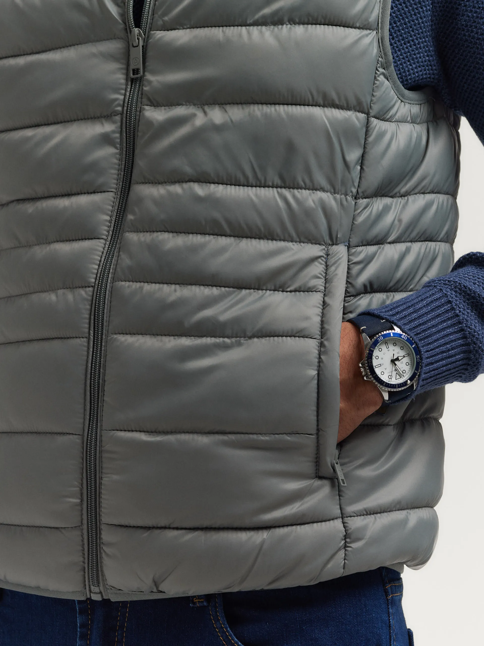 Chaleco acolchado con cuello subido. Dos bolsillo a la altura de la cintura, logo grabado en el frontal y sisa y cintura en punto elástico. Forro interior a contraste con bolsillos.