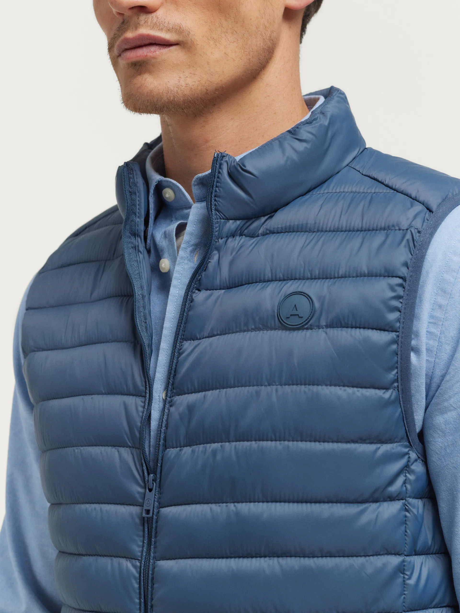 Chaleco acolchado con cuello subido y cierre central mediante cremallera, dos bolsillos a la altura de la cintura y logo de la marca grabado en el pecho. Elástico en la sisa y cintura. Forro interior a contraste con bolsillos.