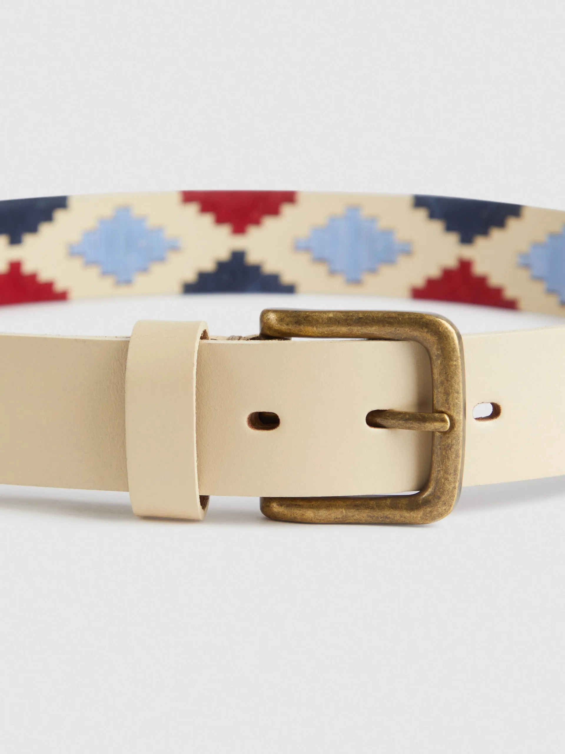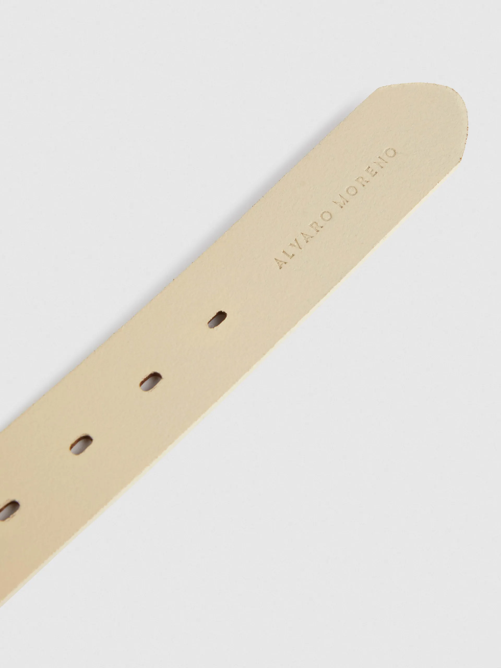 Cinturón con detalles personalizados y cierre central mediante hebilla metálica y pasador.