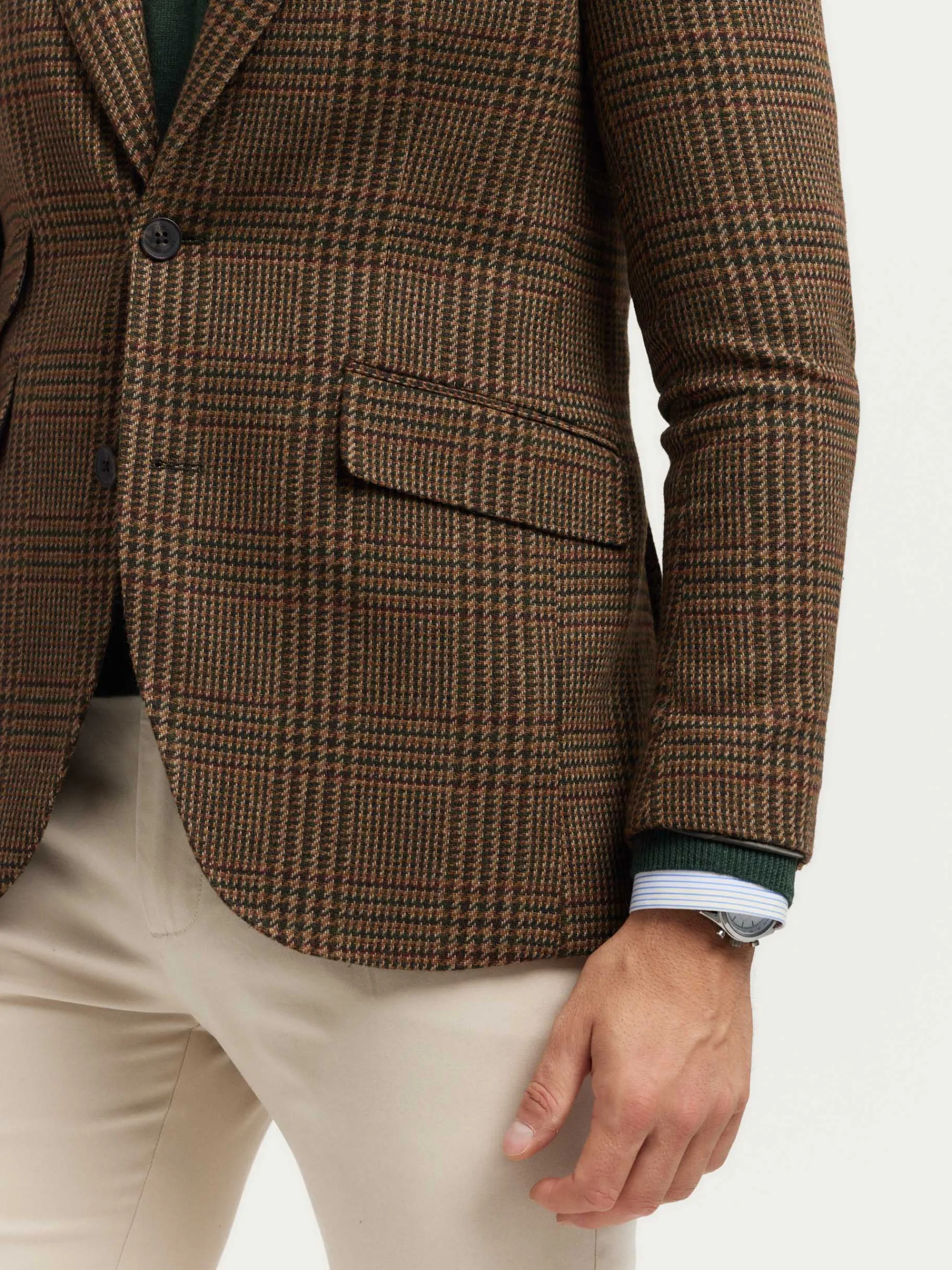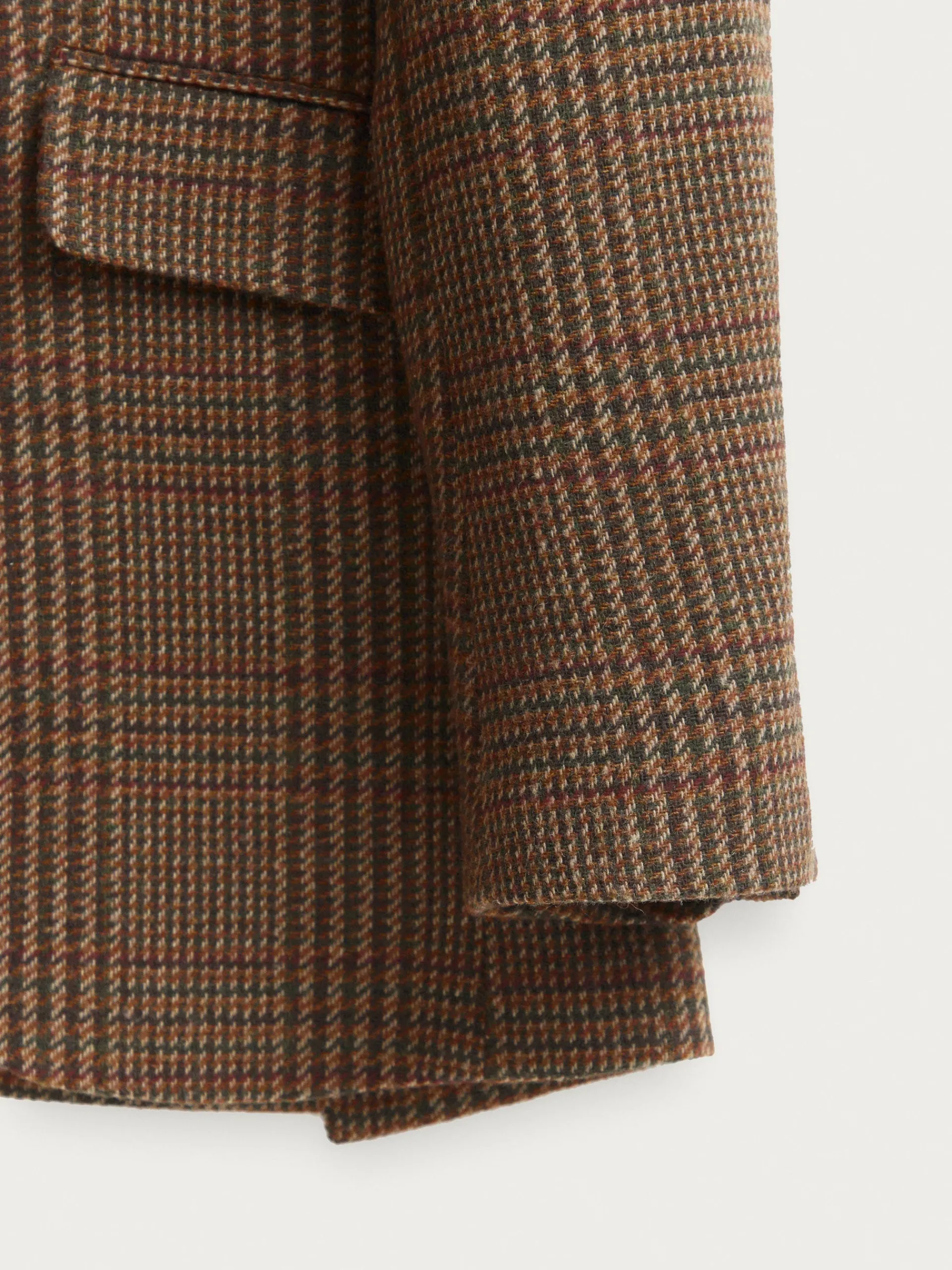 Americana confeccionada en tejido a cuadros de corte slim fit. Cuenta con cuello y solapa, cierre central simple mediante dos botones y puños con botones decorativos. Pinzas en el frontal, tres bolsillos de solapa en la cintura y un bolsillo a la altura del pecho. Interior forrado con dos bolsillos.