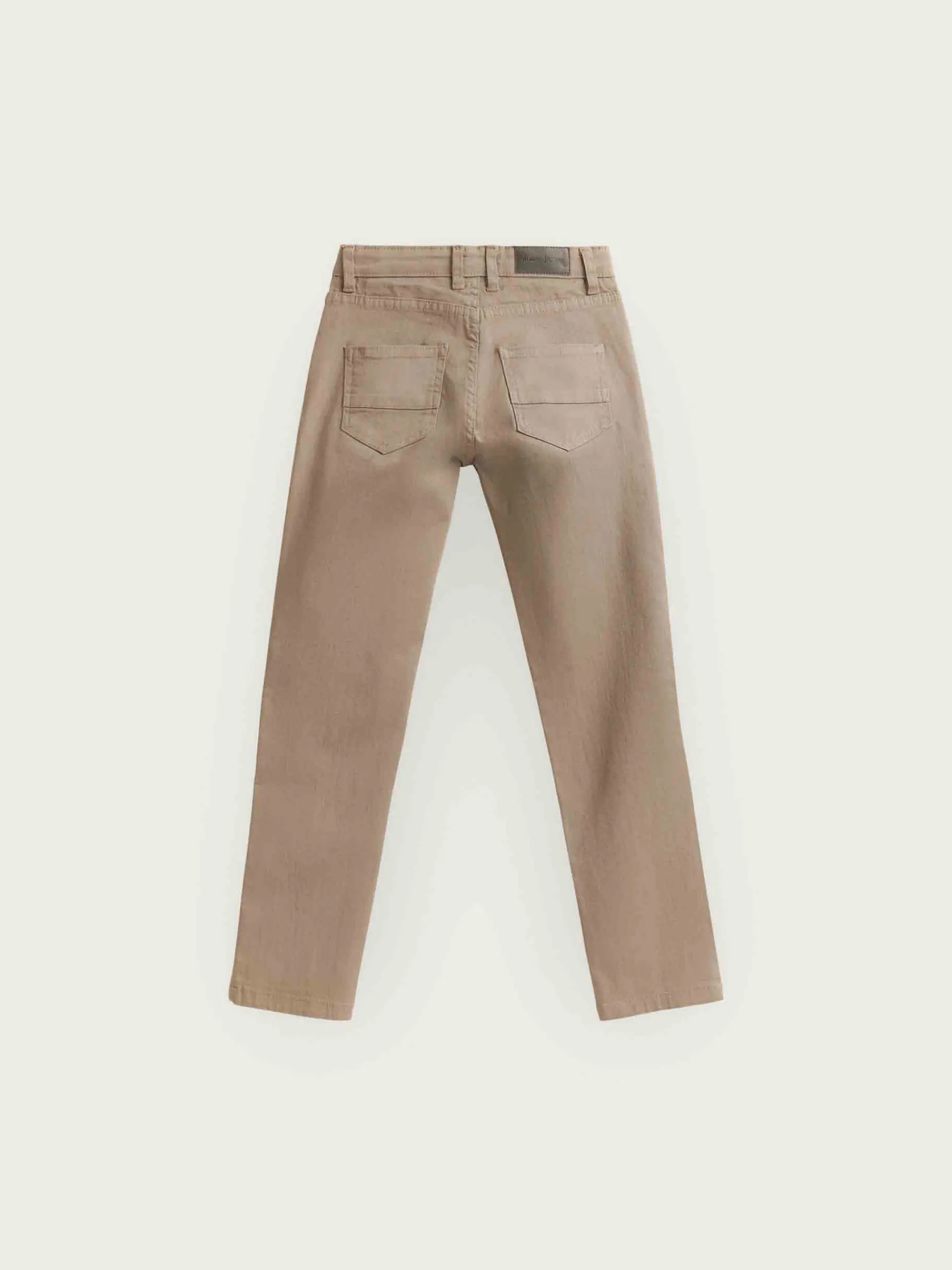 Pantalón de corte slim fit con 5 bolsillos. Cierre delantero mediante cremallera y botón, dos bolsillos tipo parche en la parte trasera con etiqueta en efecto piel sobre uno de ellos y fornituras personalizadas.