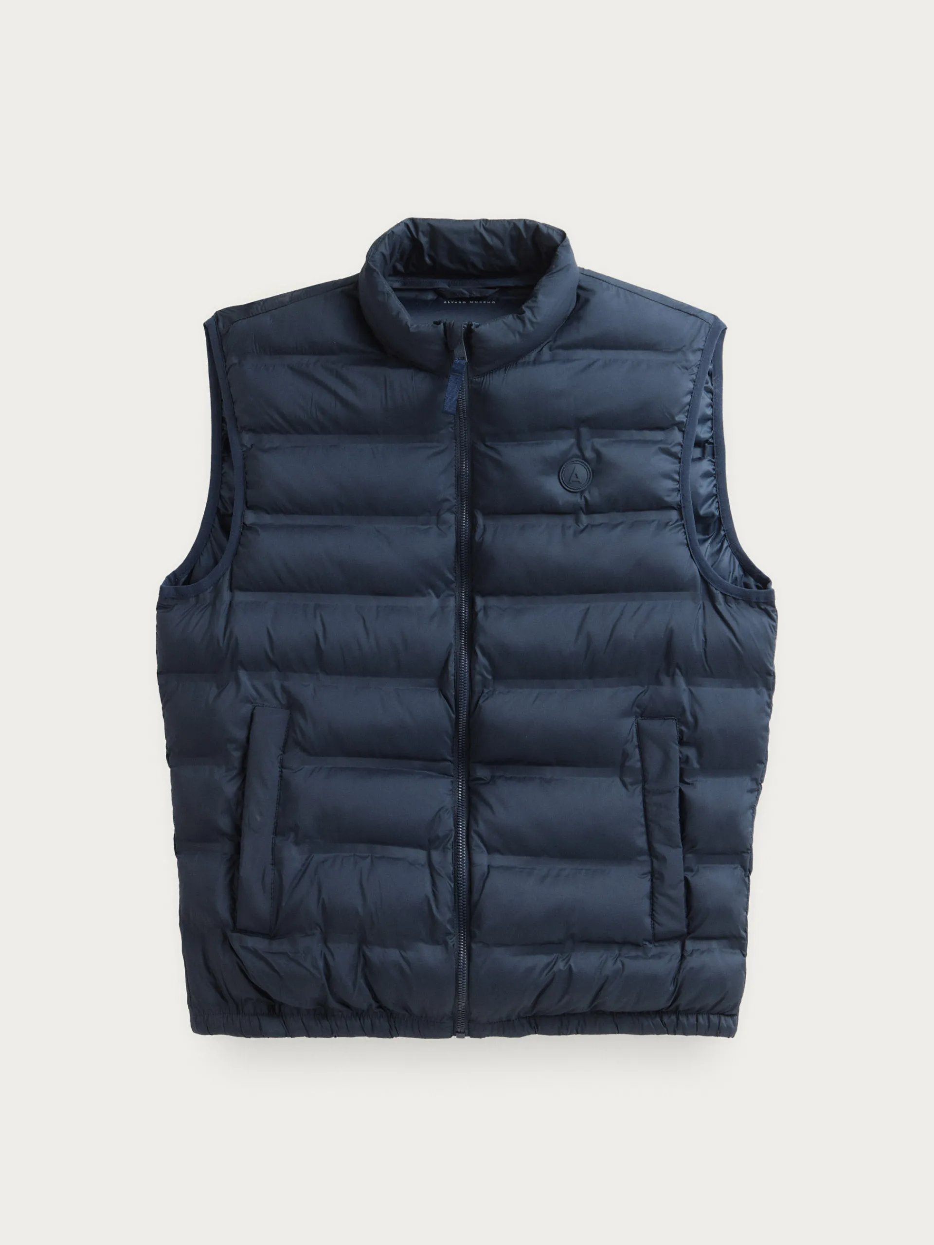 Chaleco acolchado con cuello subido y cierre central mediante cremallera, dos bolsillos a la altura de la cintura y logo de la marca grabado en el pecho al tono. Elástico en la sisa y cintura. Forro interior a contraste con bolsillos.