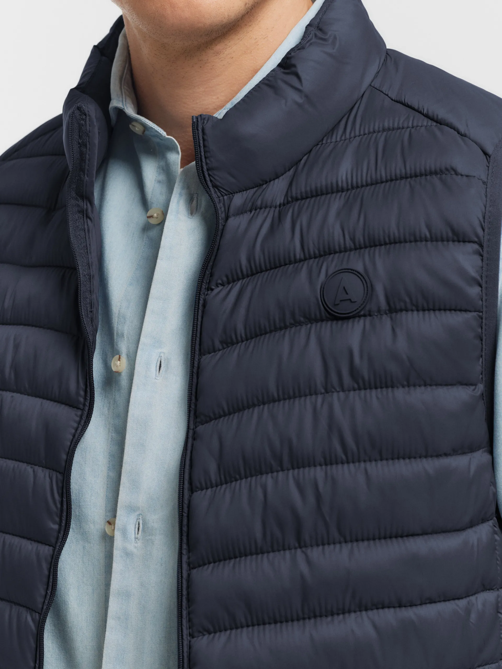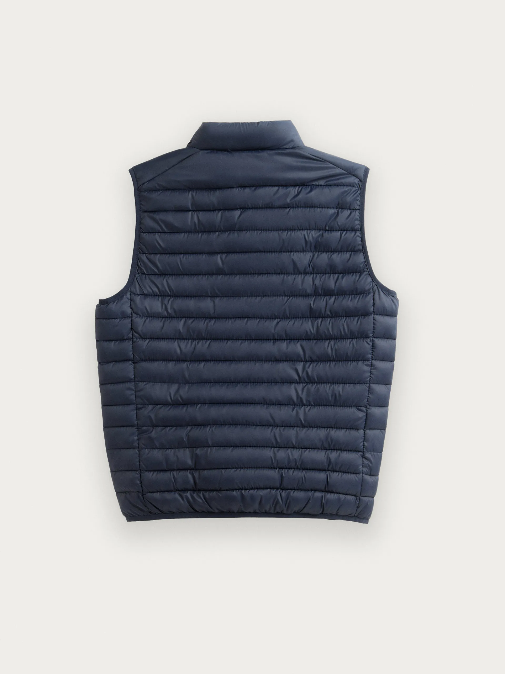 Chaleco acolchado con cuello subido y cierre central mediante cremallera, dos bolsillos a la altura de la cintura y logo de la marca grabado en el pecho. Elástico en la sisa y cintura. Forro interior a contraste con bolsillos.