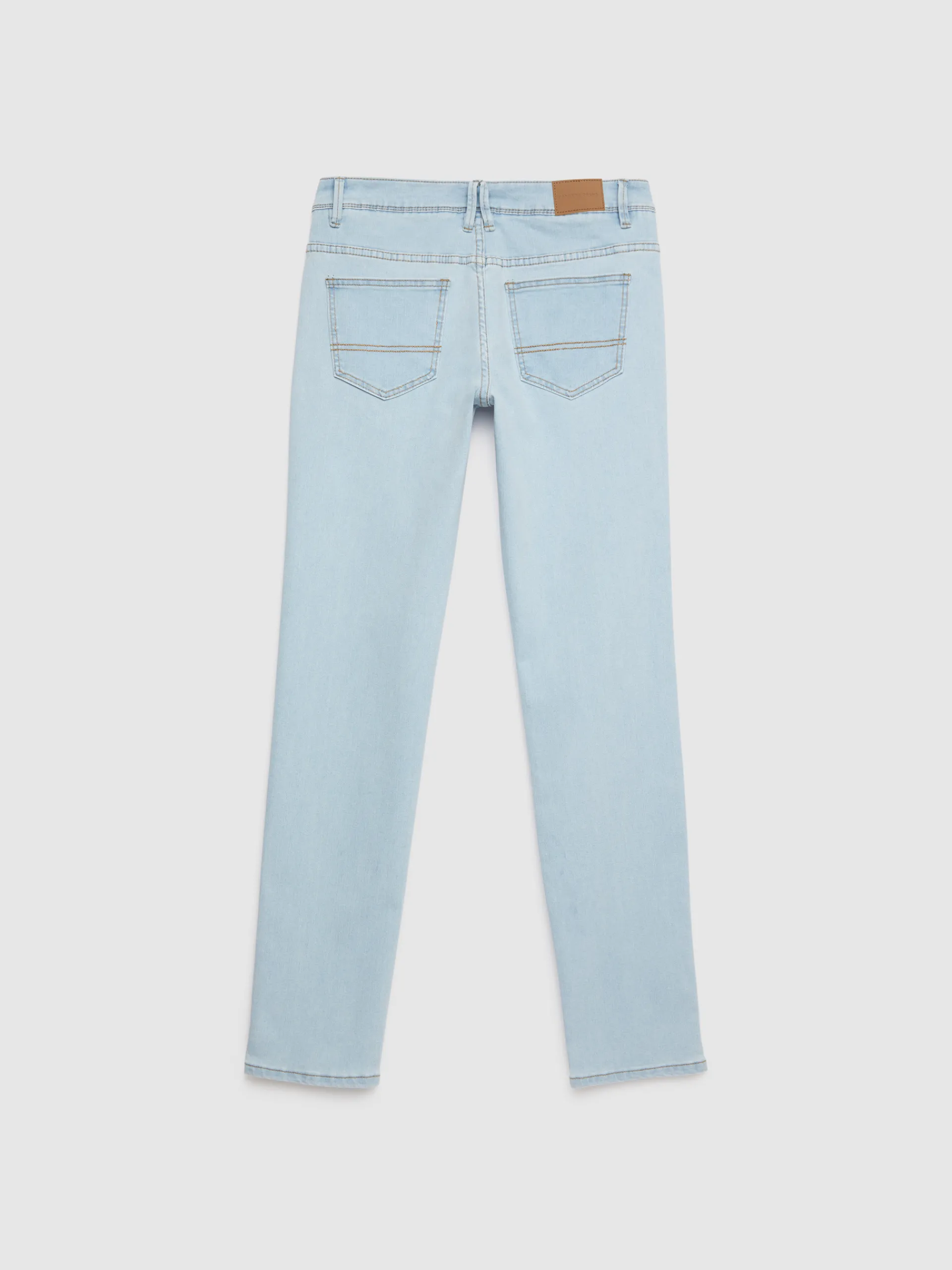 Pantalón denim de corte regular fit con cinco bolsillos y cierre central mediante botón y cremallera, pespuntes en color camel, fornituras personalizadas y etiqueta en efecto piel en la cinturilla.