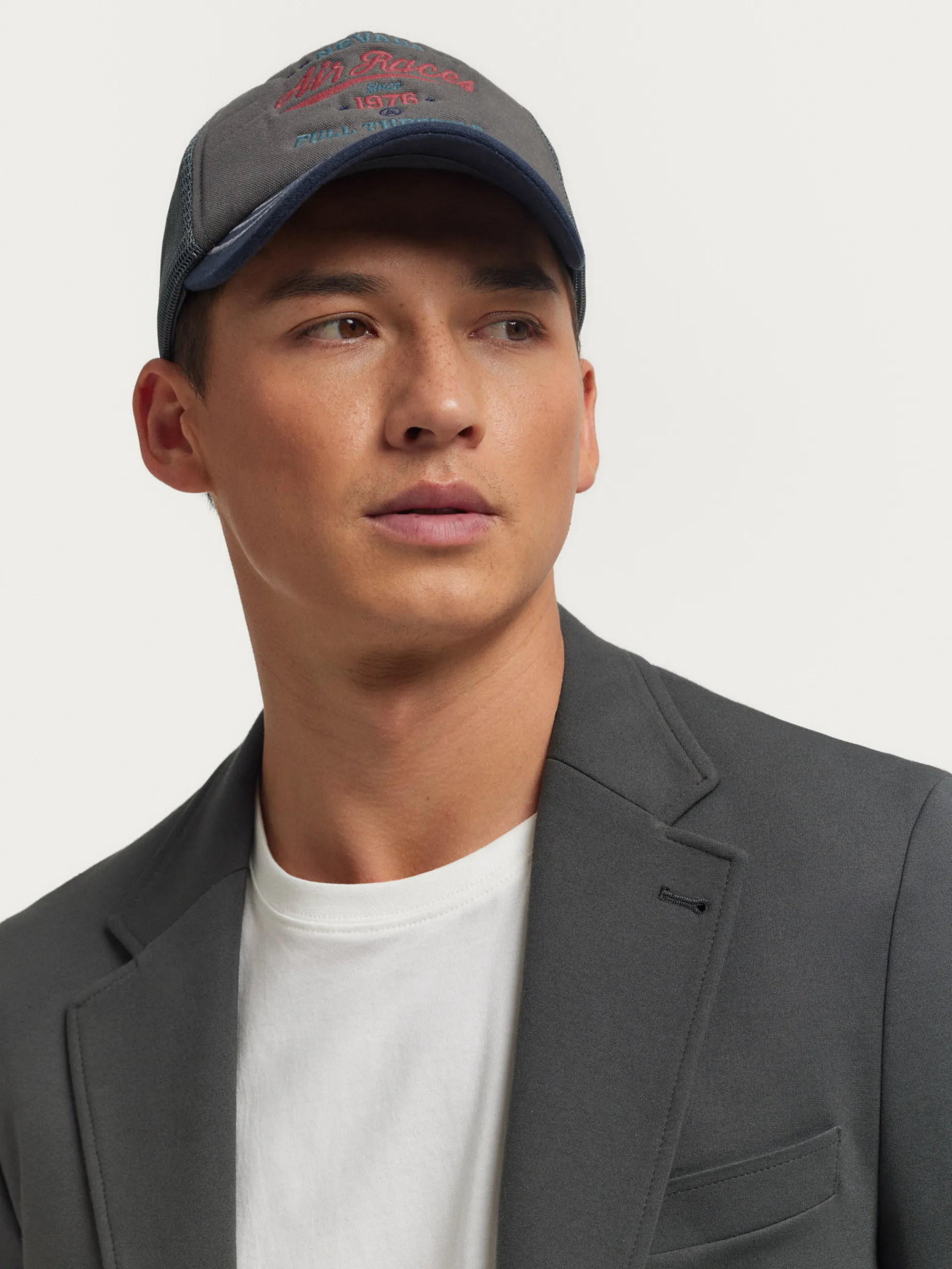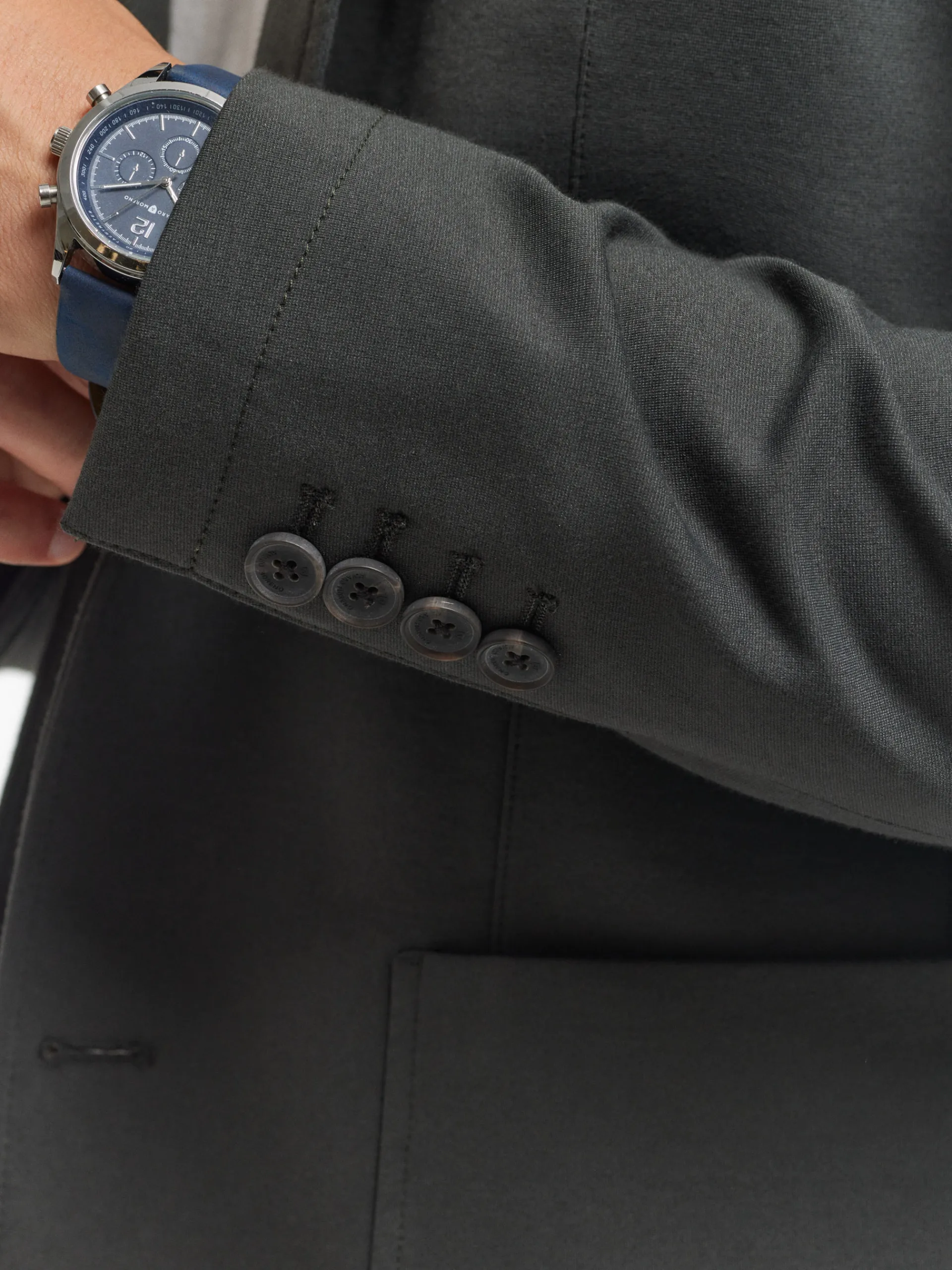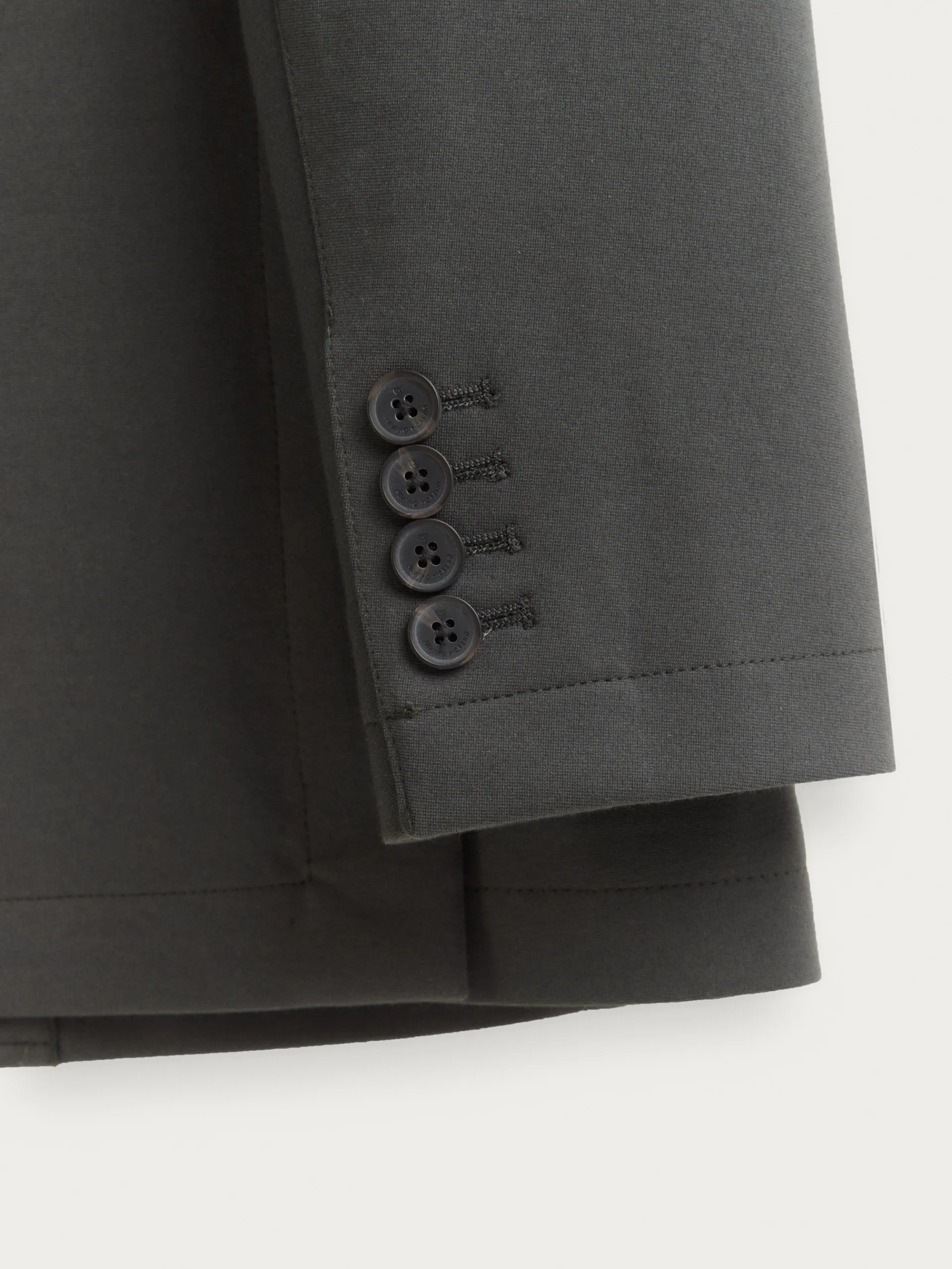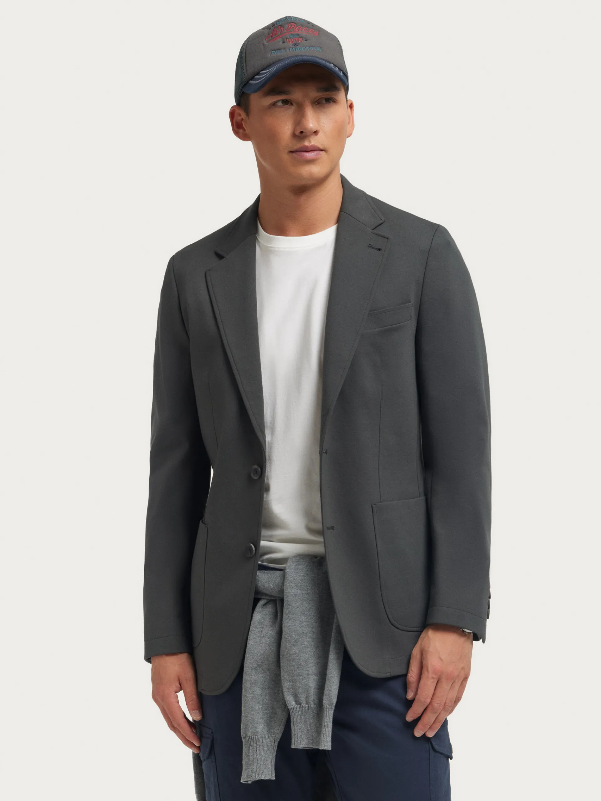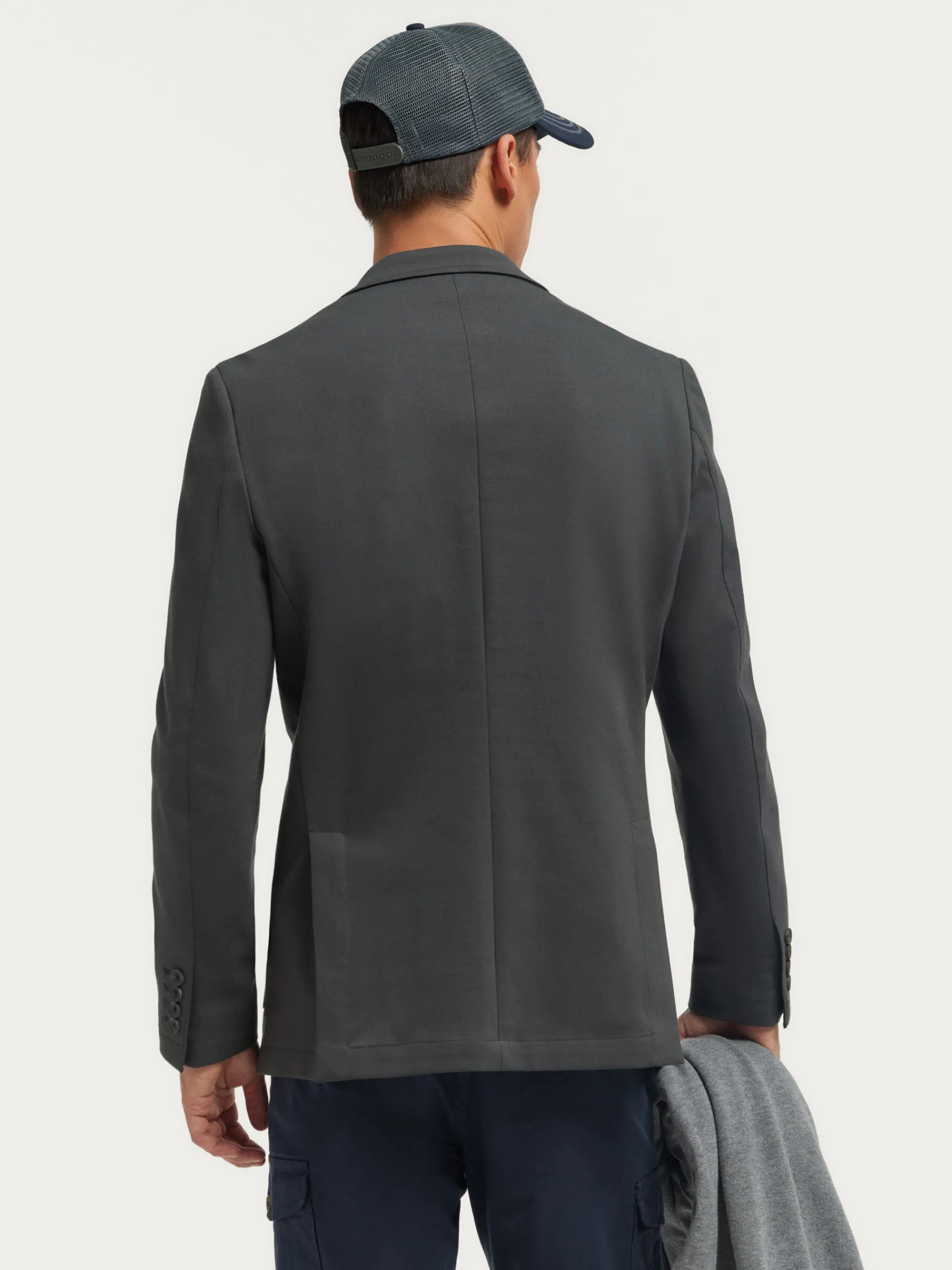 Americana confeccionada en tejido de punto de corte slim fit. Cuenta con cuello y solapa, cierre central simple mediante dos botones y puños con botones decorativos. Pinzas en el frontal, dos bolsillos de parche en la cintura y un bolsillo a la altura del pecho. Dos bolsillos en su interior.