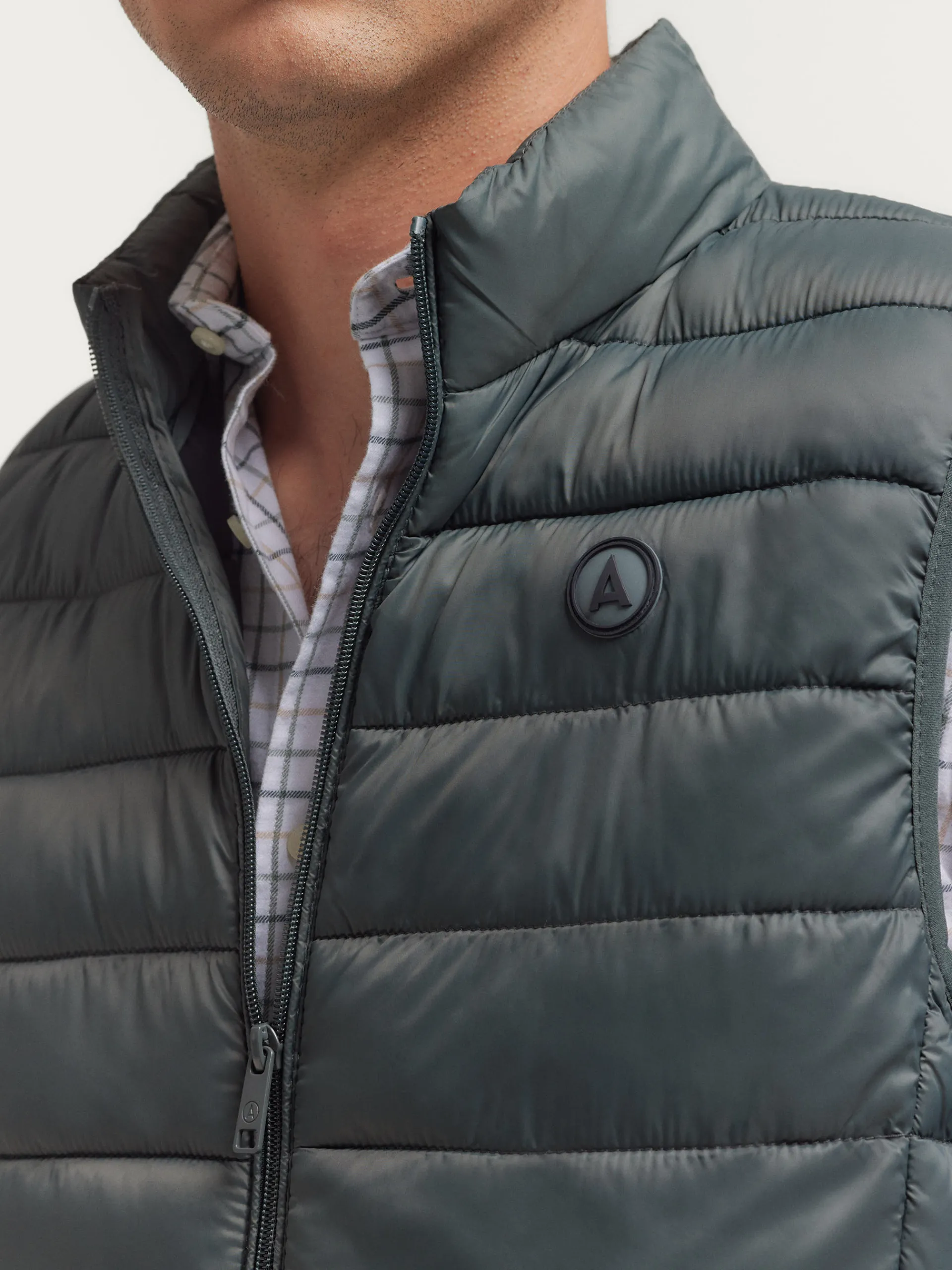 Chaleco acolchado con cuello subido. Dos bolsillo a la altura de la cintura, logo grabado en el frontal y sisa y cintura en punto elástico. Forro interior a contraste con bolsillos.