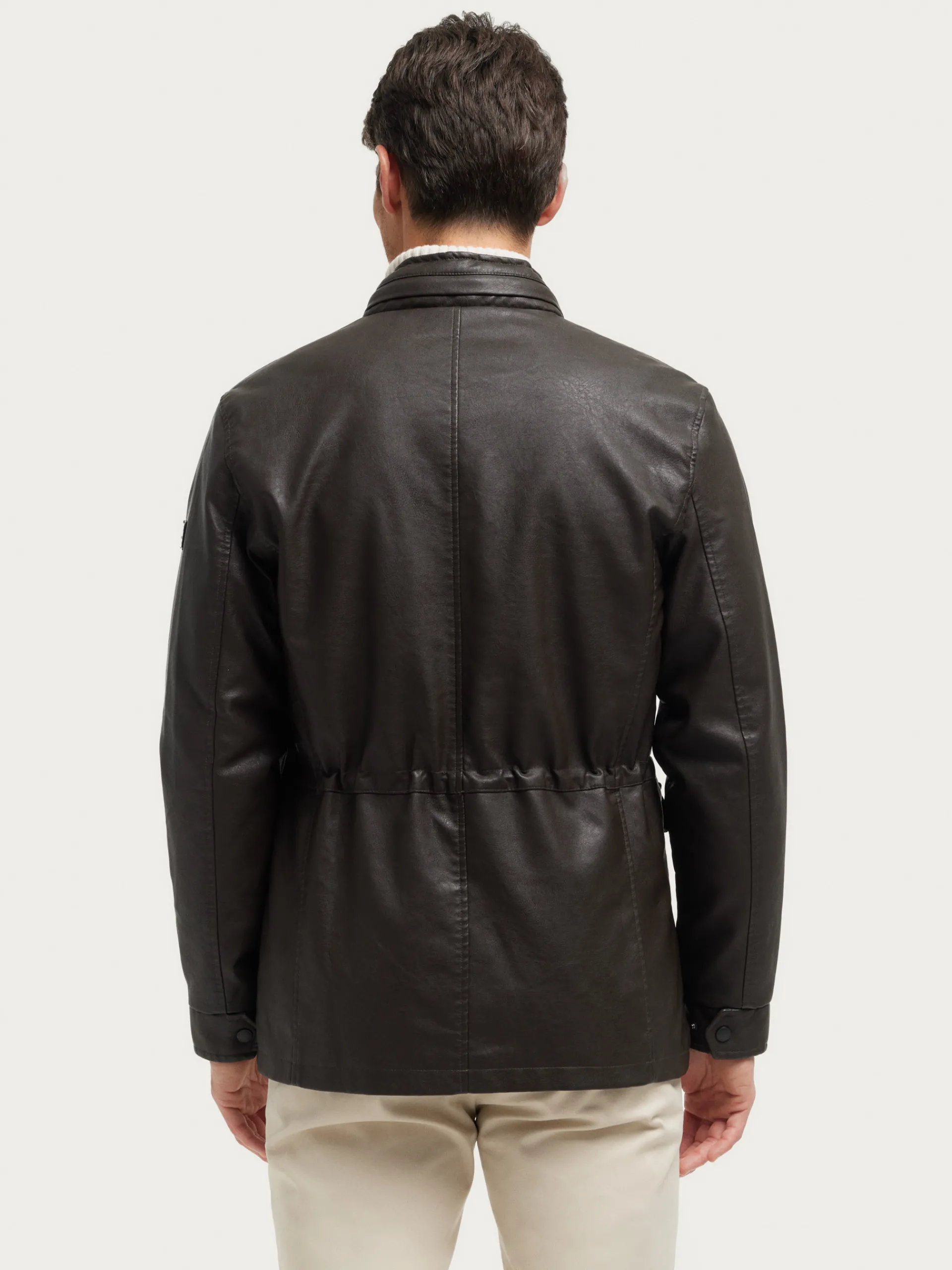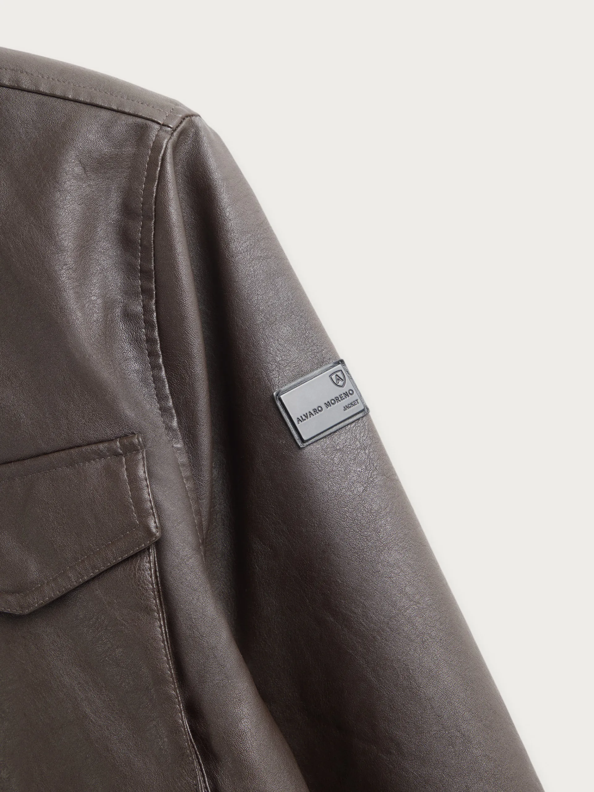 Cazadora confeccionada en símil piel con cuello subido y cuatro bolsillos de solapa en el frontal. Cierre central mediante cremallera oculta por tapeta de botones a presión, manga larga con puños ajustables y detalle personalizado en una de las mangas. Bolsillo en el interior.