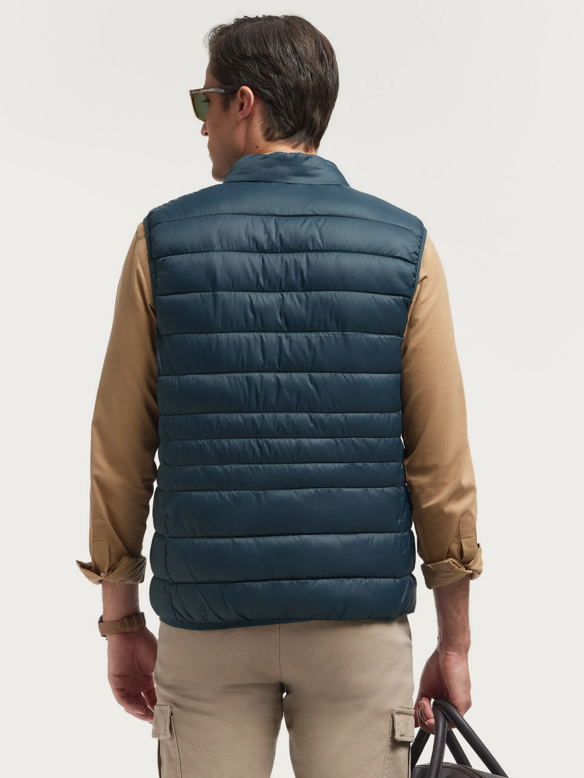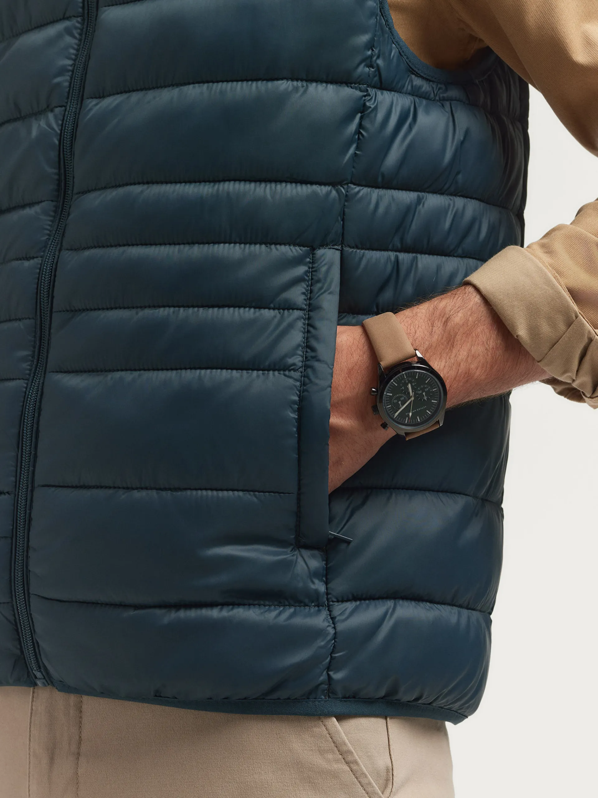 Chaleco acolchado con cuello subido. Dos bolsillo a la altura de la cintura, logo grabado en el frontal y sisa y cintura en punto elástico. Forro interior a contraste con bolsillos.