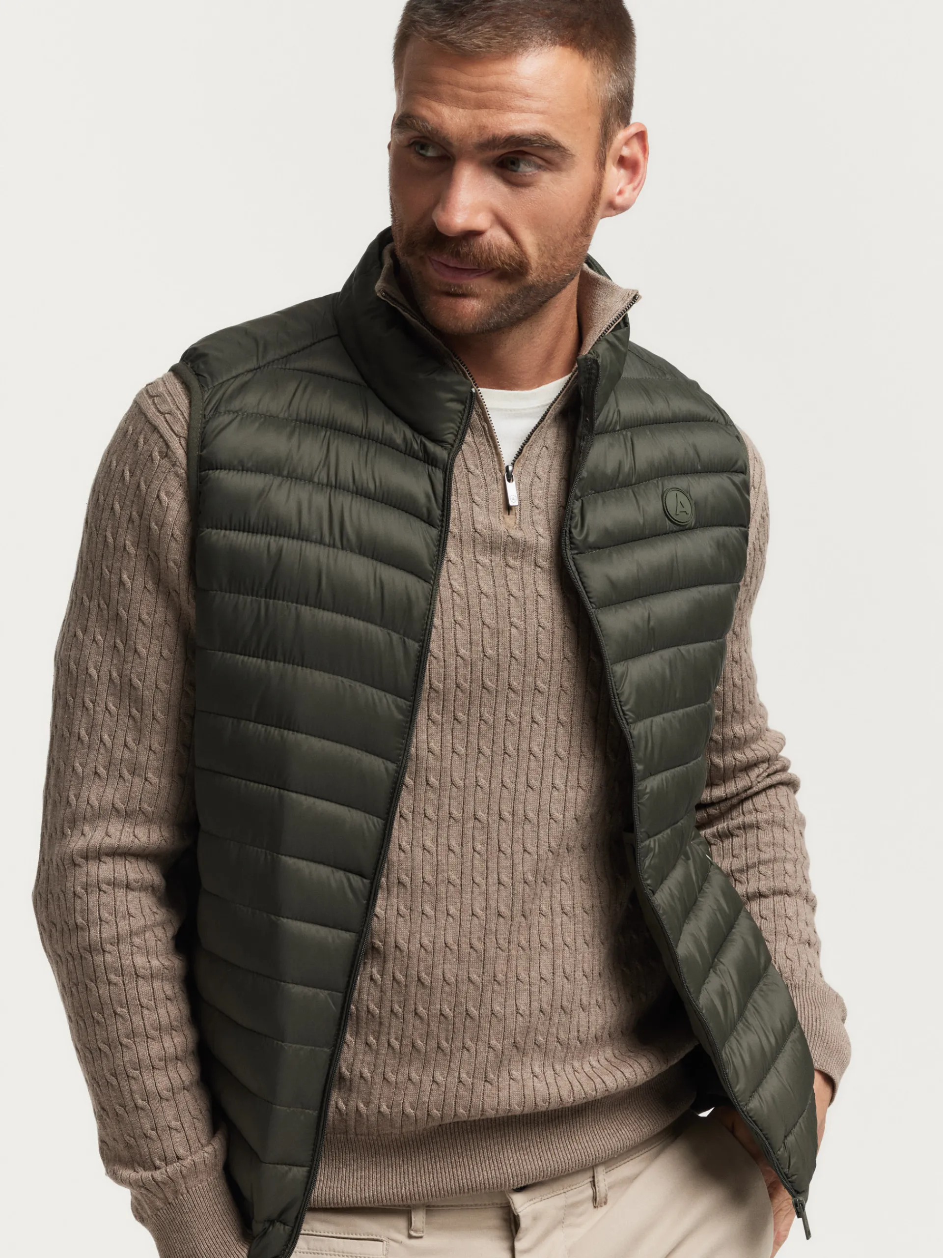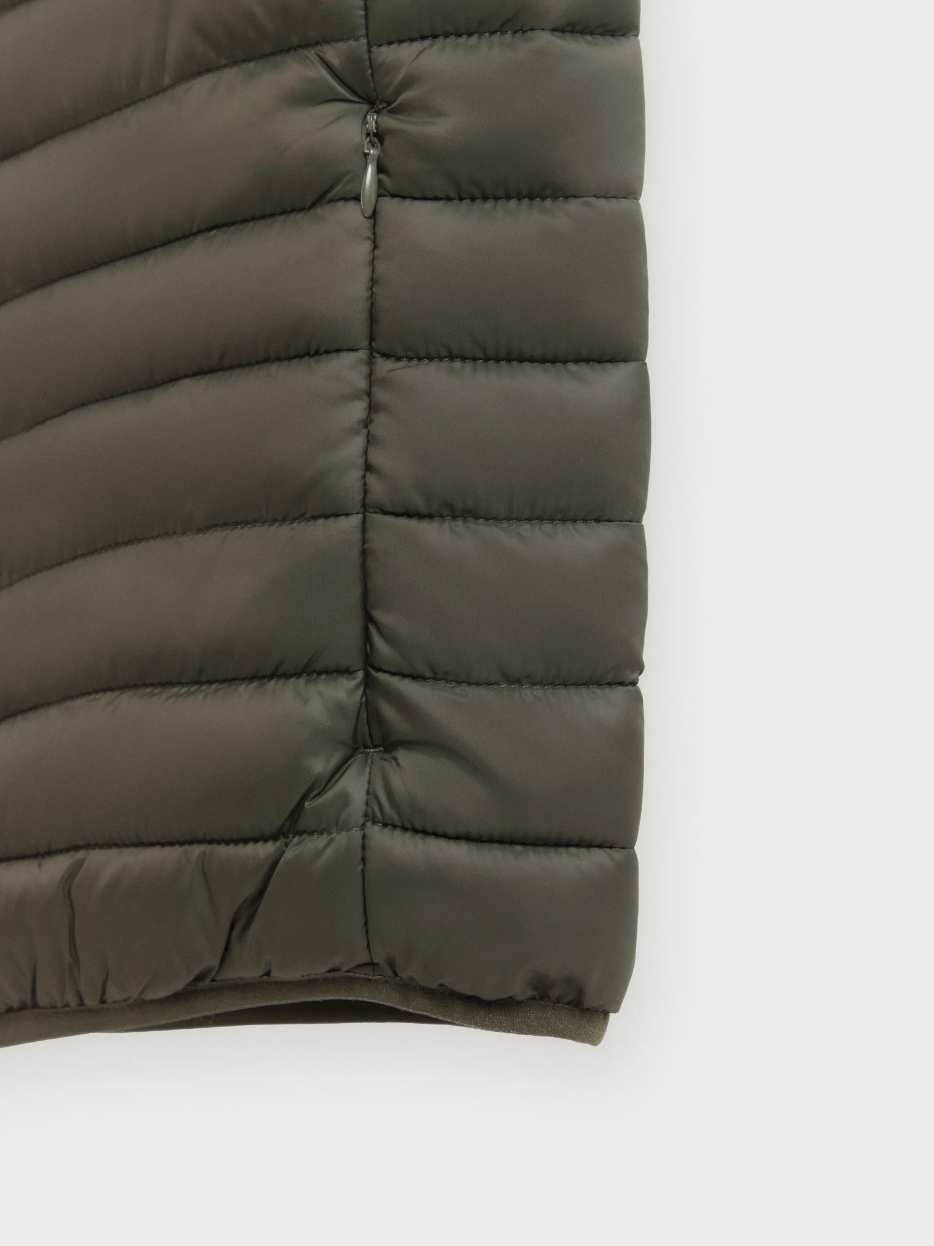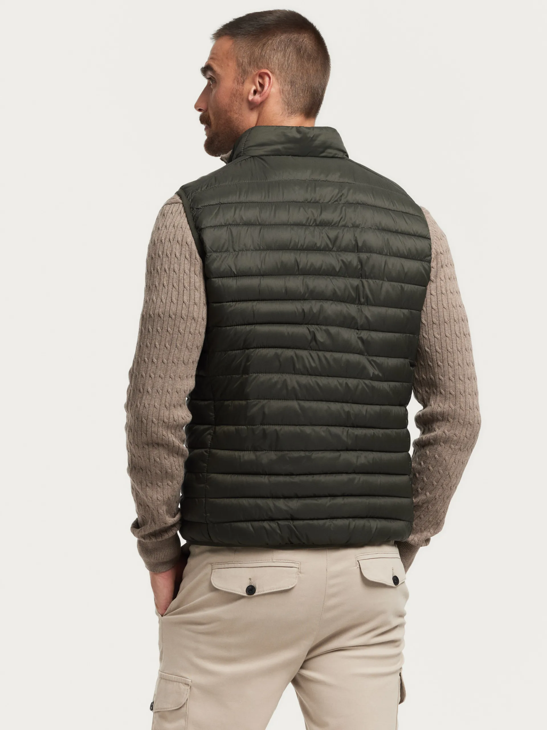 Chaleco acolchado con cuello subido y cierre central mediante cremallera, dos bolsillos a la altura de la cintura y logo de la marca grabado en el pecho. Elástico en la sisa y cintura. Forro interior a contraste con bolsillos.