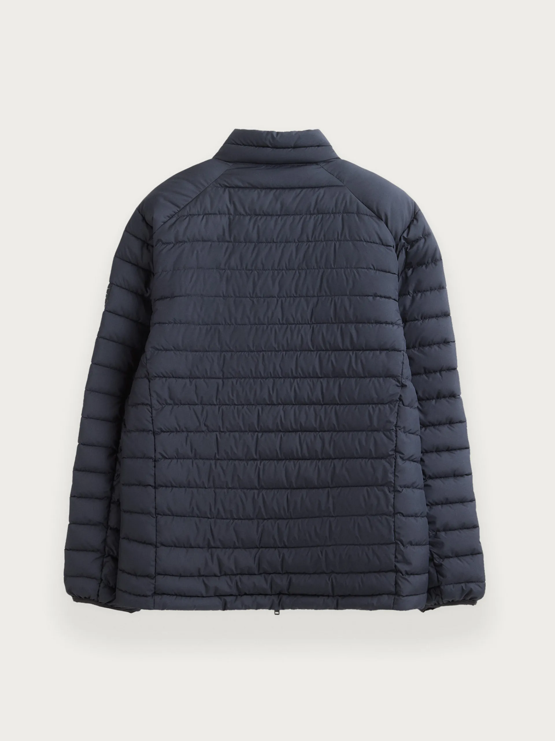 Cazadora acolchada con cuello subido, cierre central mediante doble cremallera, manga larga con puños elásticos y dos bolsillos en la cintura con cierre mediante cremallera. Detalle personalizado en una de sus mangas.