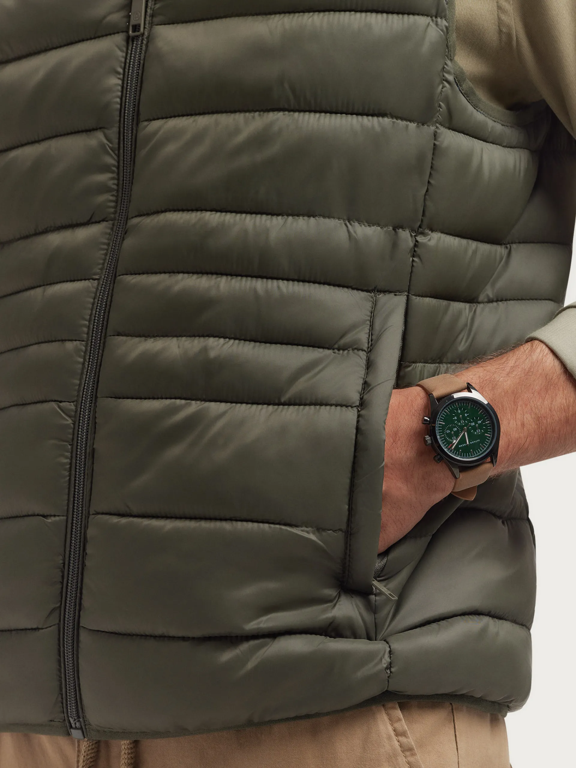 Chaleco acolchado con cuello subido. Dos bolsillo a la altura de la cintura, logo grabado en el frontal y sisa y cintura en punto elástico. Forro interior a contraste con bolsillos.