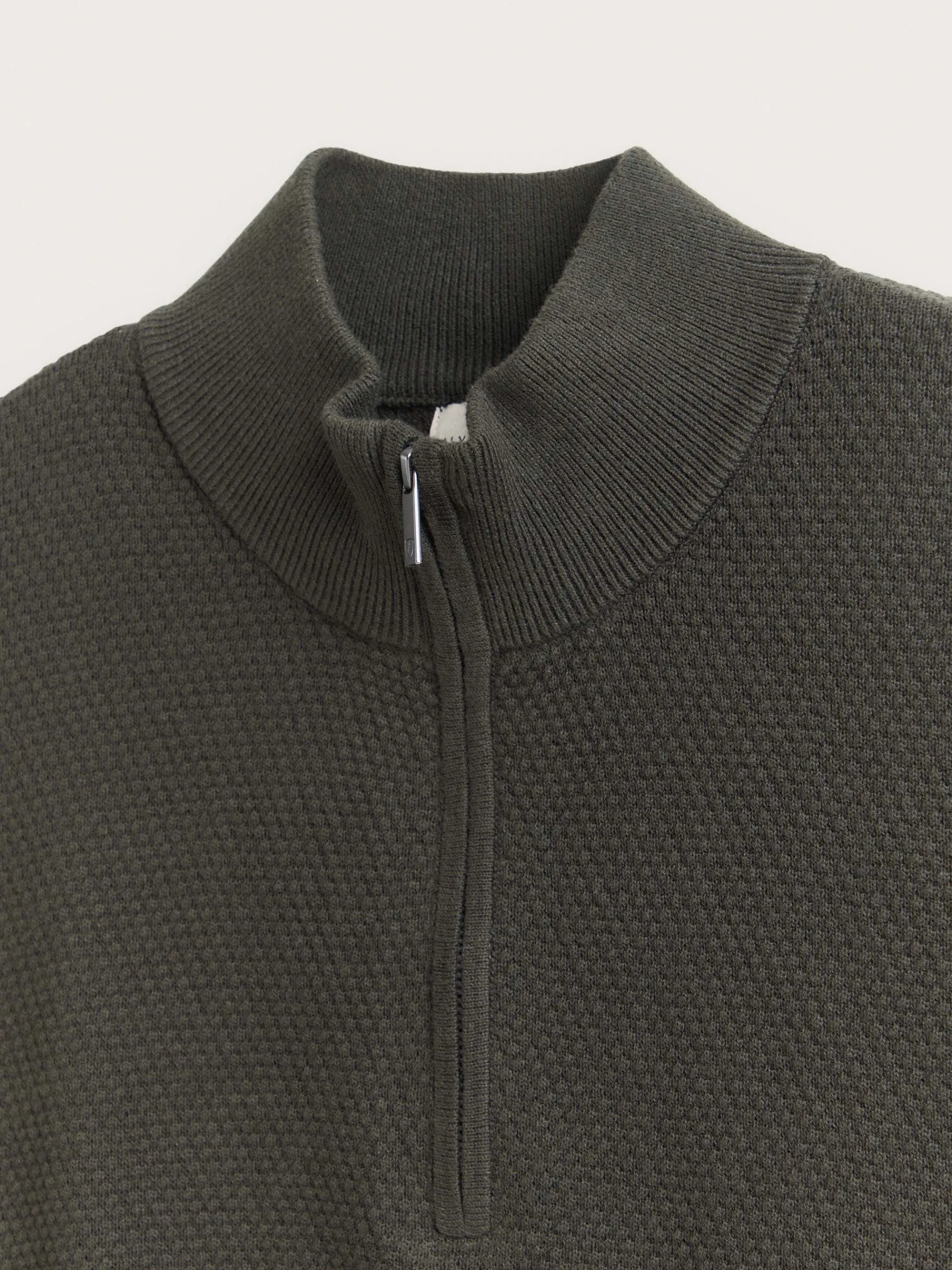 Jersey confeccionado en algodón con estructura en su tejido. Cuenta con cuello alto con medio cierre de cremallera y cuello, puños y bajo en acabado elástico. Corte regular fit.