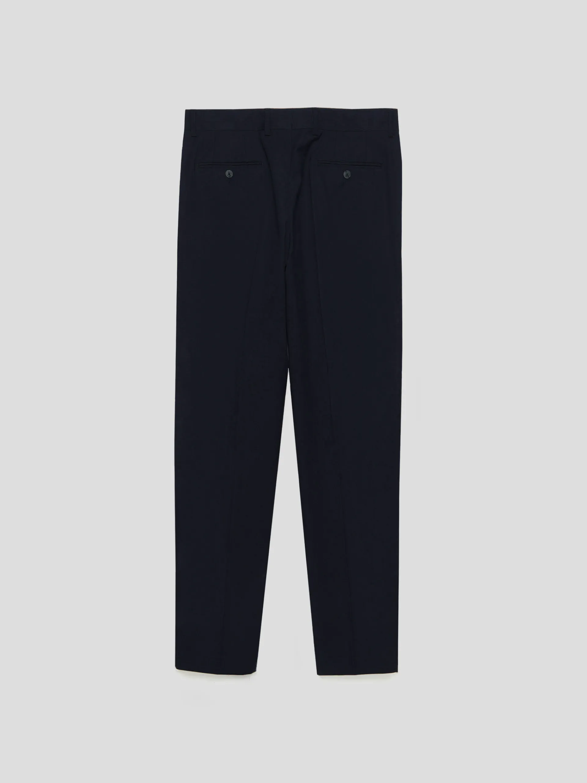 Pantalón de traje que cuenta con cierre frontal de cremallera y botones, dos bolsillos abiertos en la parte delantera y dos bolsillos traseros con cierre mediante botón. Forrado en su interior.