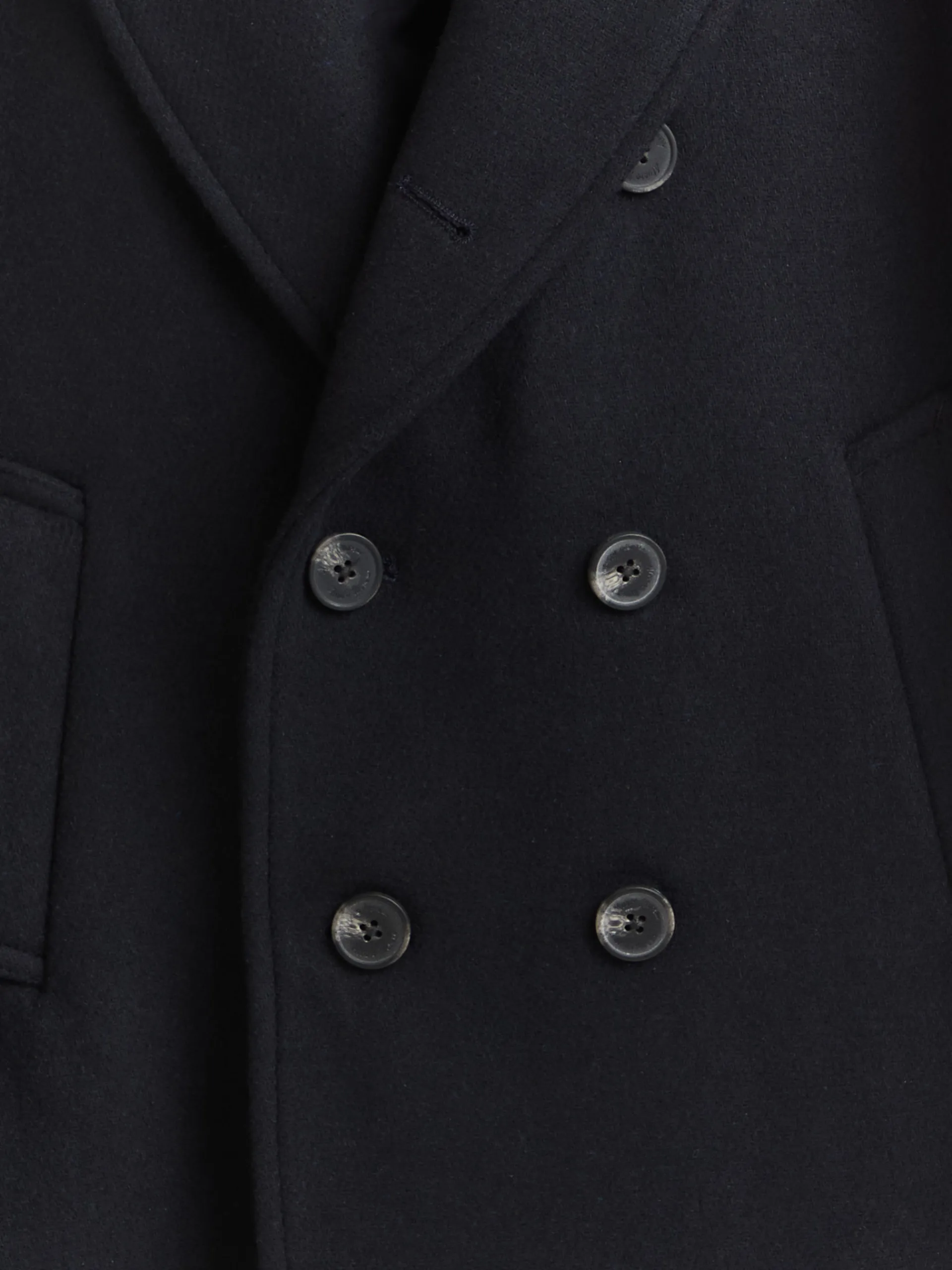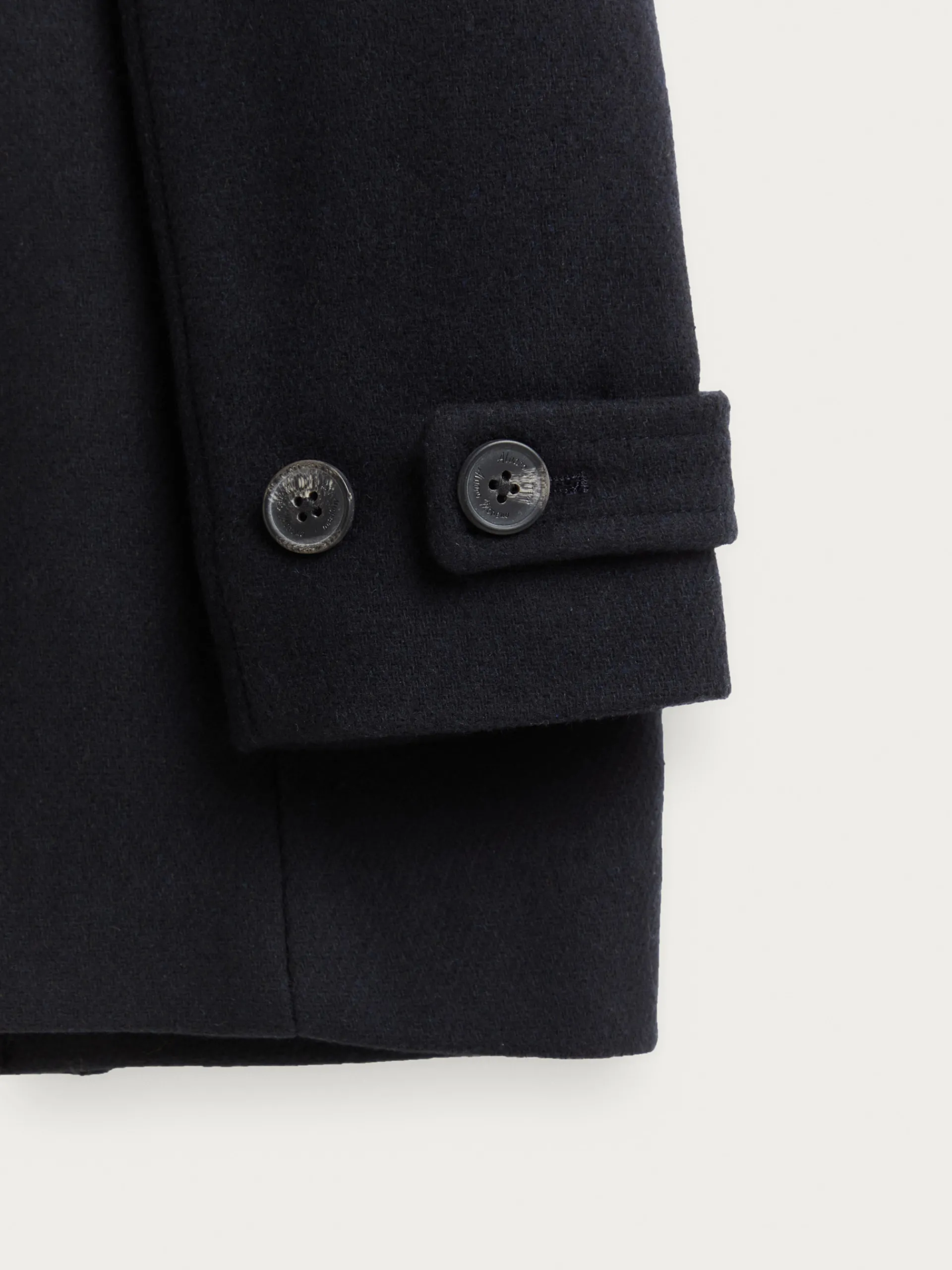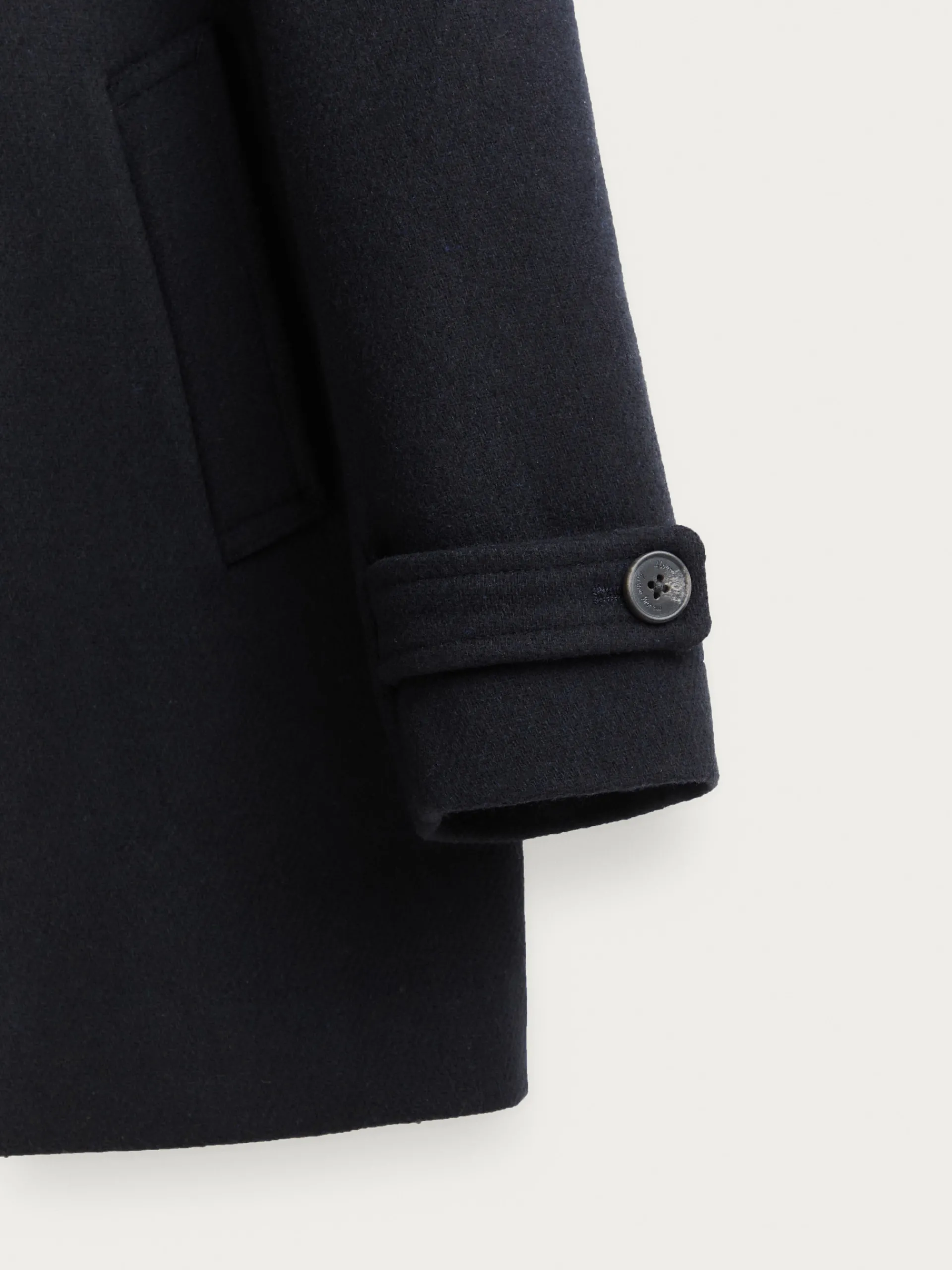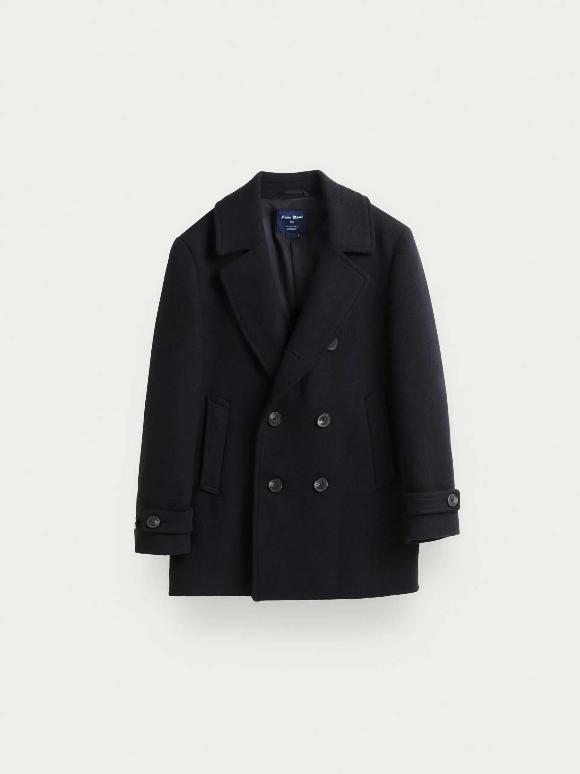 Abrigo de corte regular fit confeccionado en diferentes materiales de los cuales destaca la lana. Cuenta con cuello y solapa, cierre central cruzado, dos bolsillos en la cintura, abertura en el bajo de la espalda y detalle con dos botones en el puño de las mangas. Forrado en su interior con dos bolsillos.