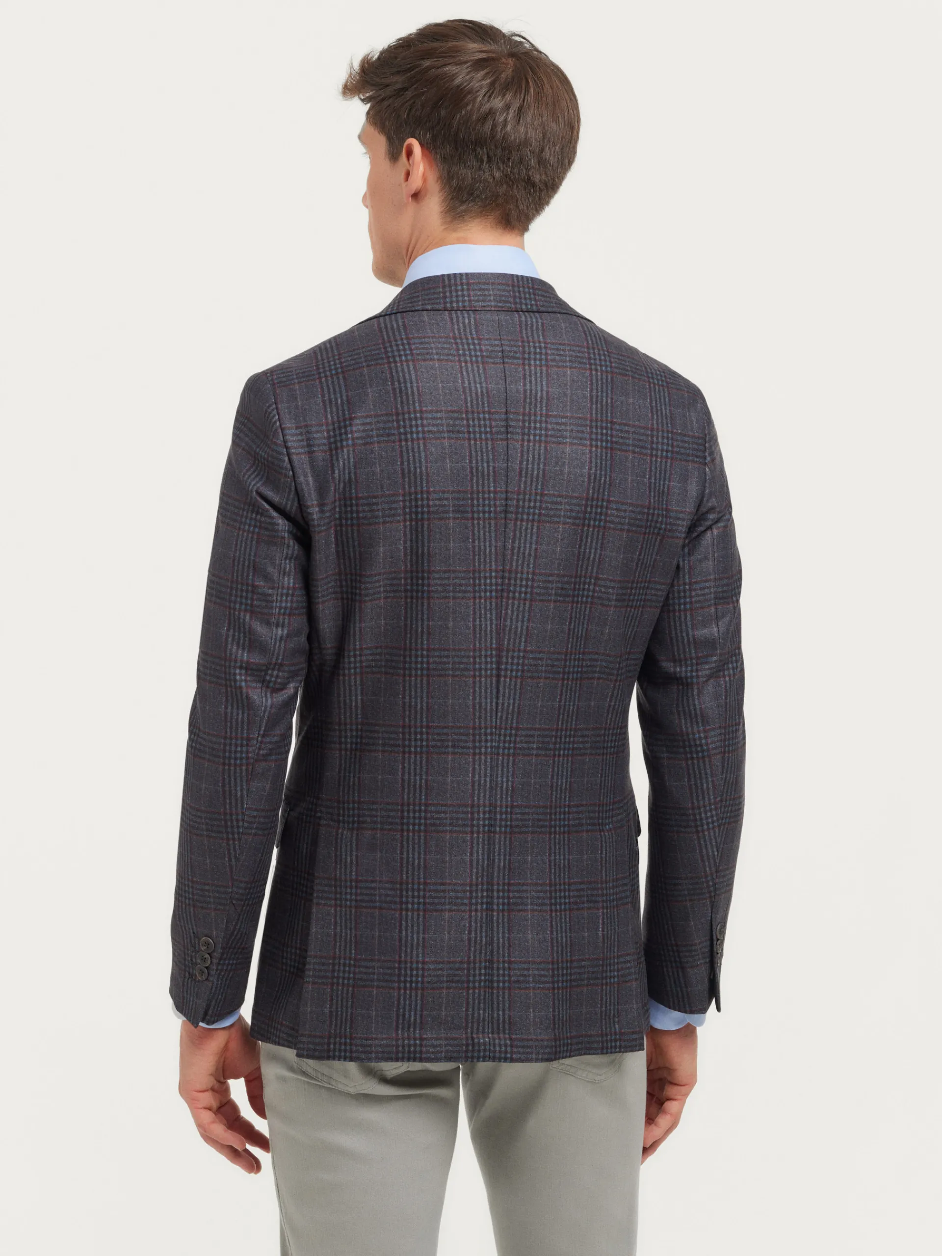 Americana confeccionada en tejido a cuadros de corte slim fit. Cuenta con cuello y solapa, cierre central simple mediante dos botones y puños con botones decorativos. Pinzas en el frontal, tres bolsillos de solapa en la cintura y un bolsillo a la altura del pecho. Dos bolsillos en el interior.