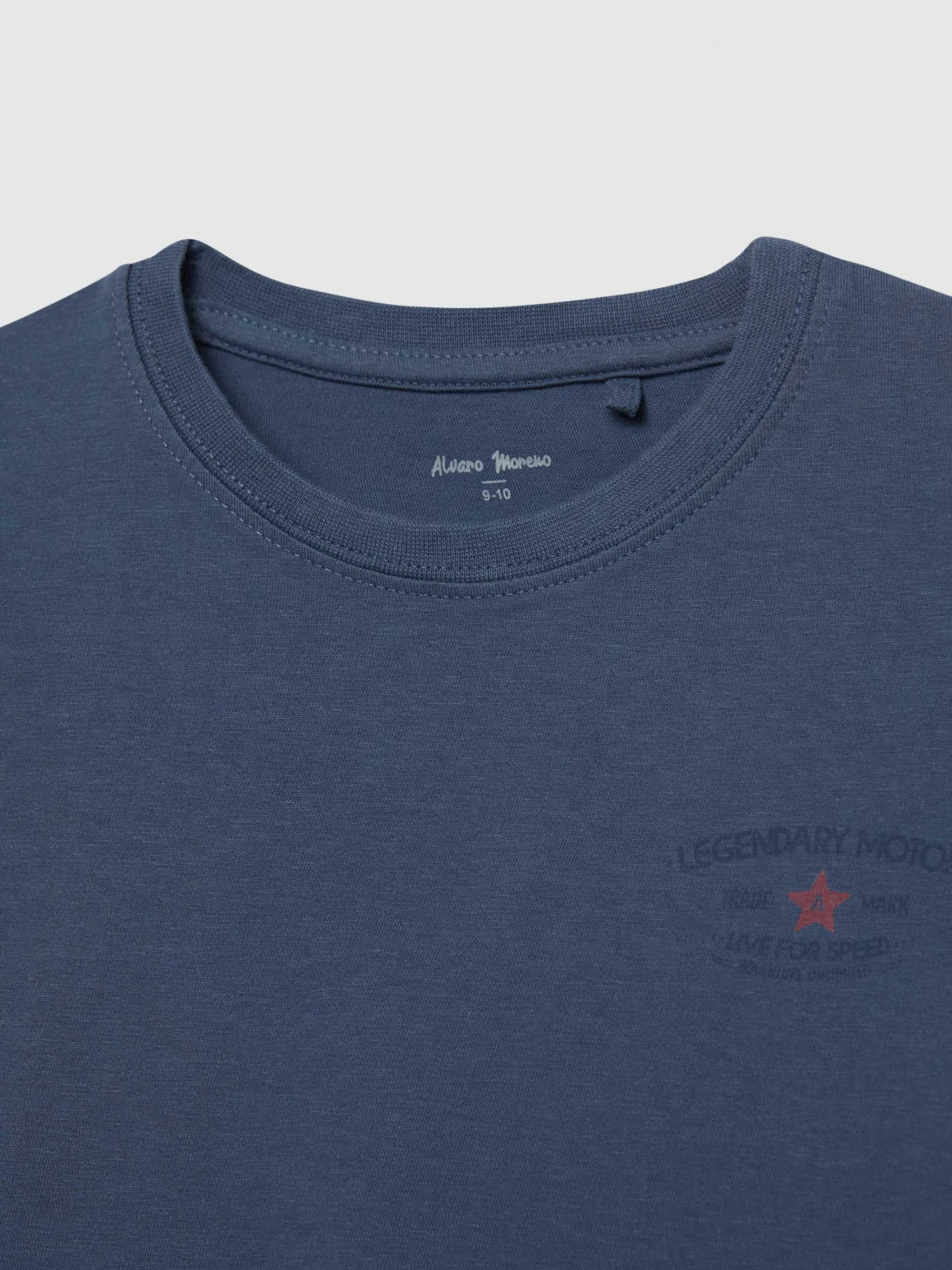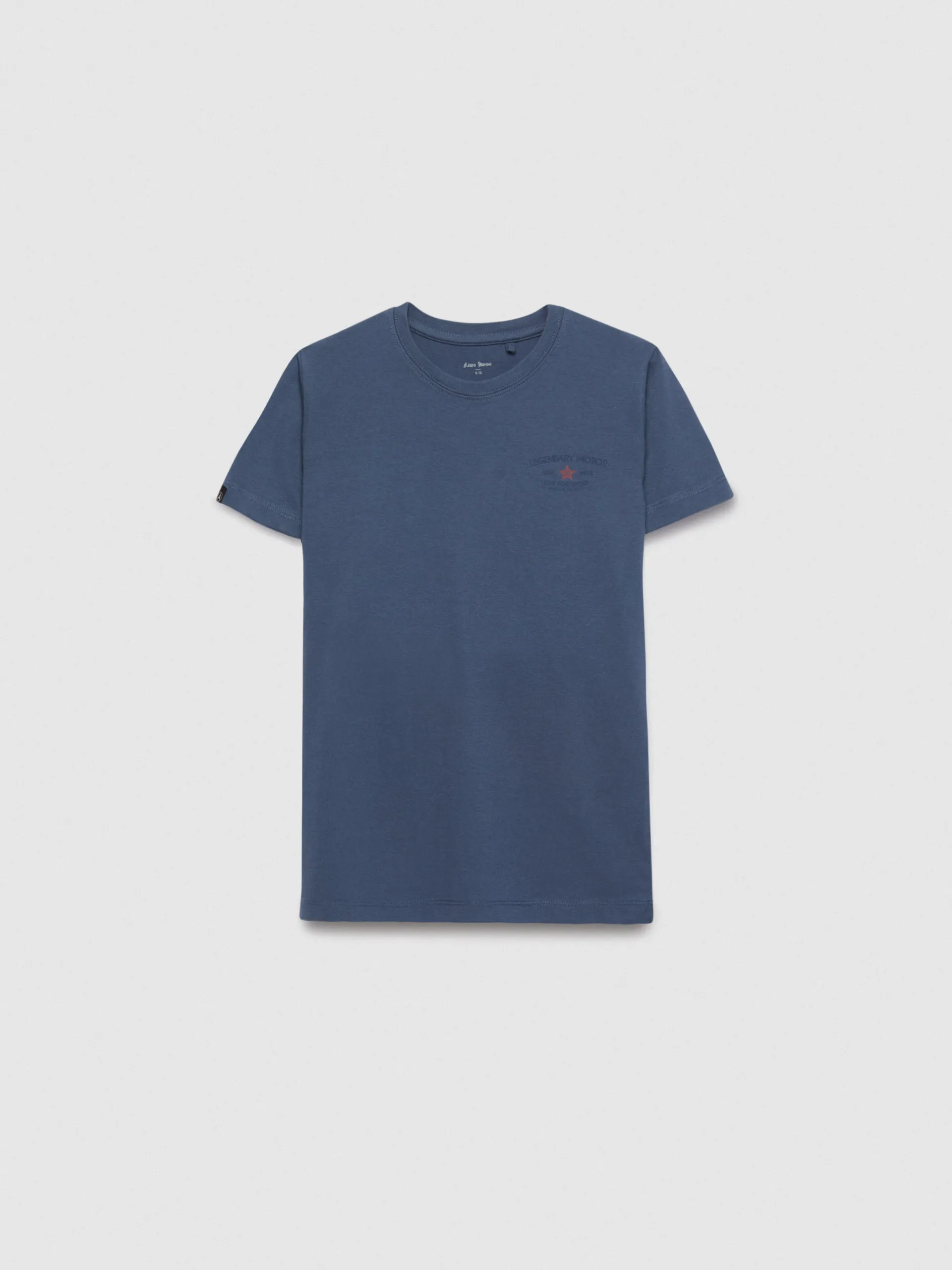 Camiseta con estampado personalizado en la parte trasera y en el frontal a la altura del pecho. Cuenta con cuello redondo y manga corta. Corte regular fit.