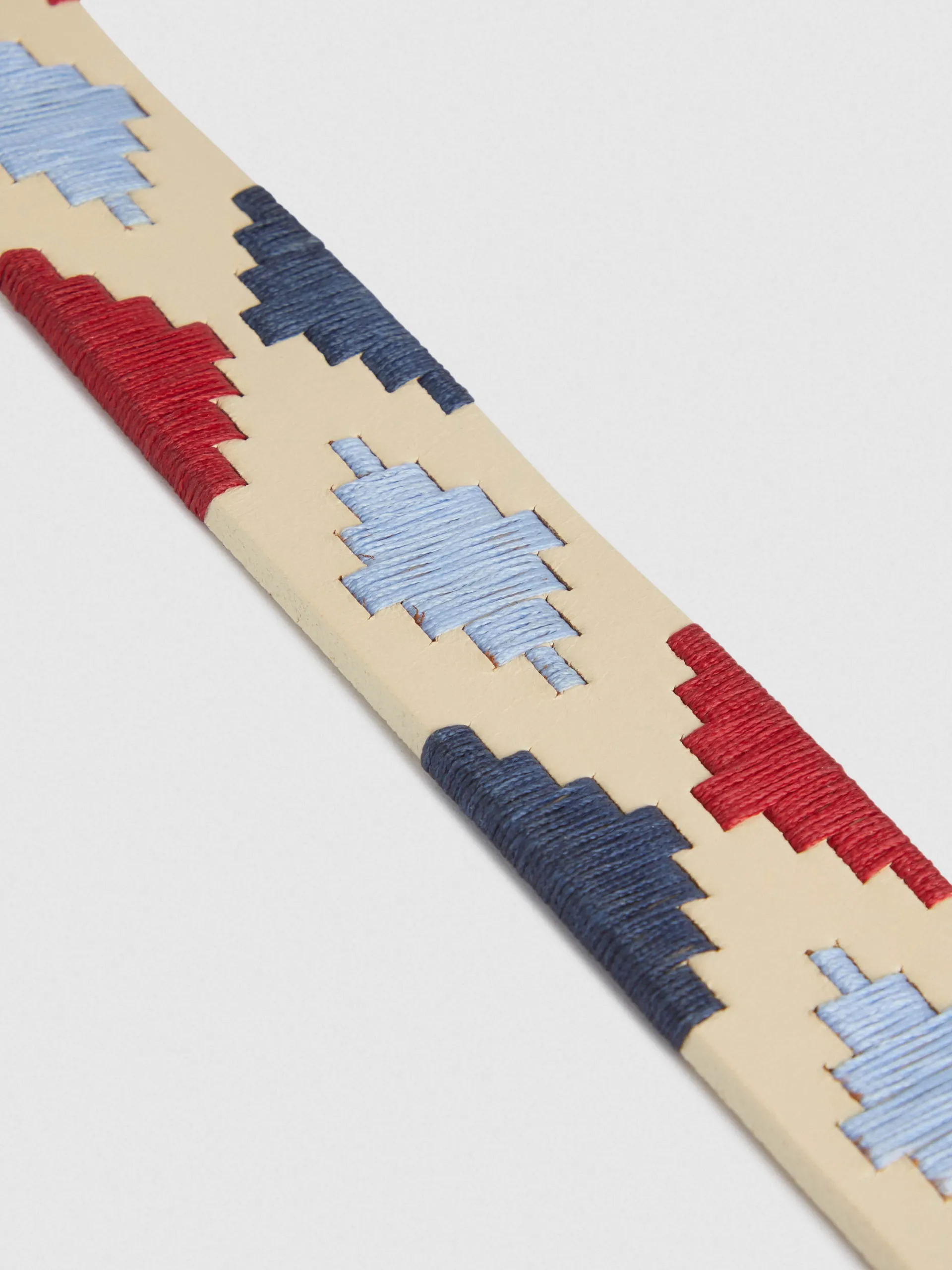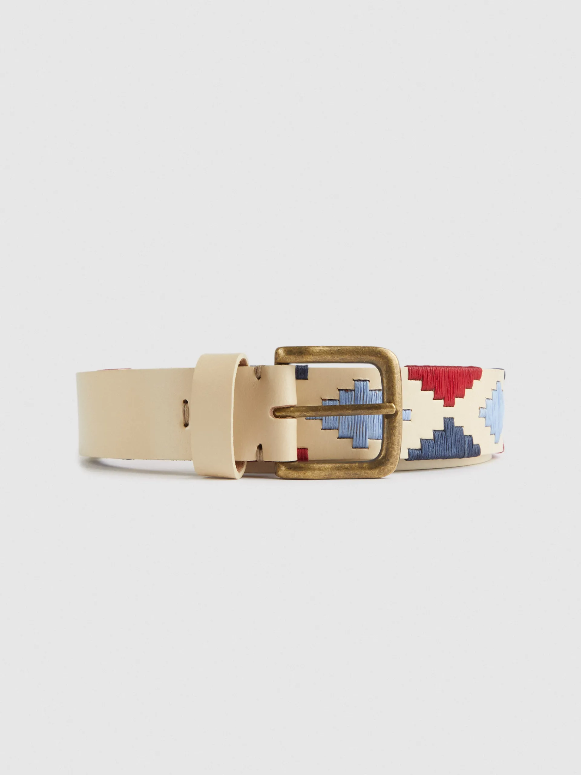 Cinturón con detalles personalizados y cierre central mediante hebilla metálica y pasador.