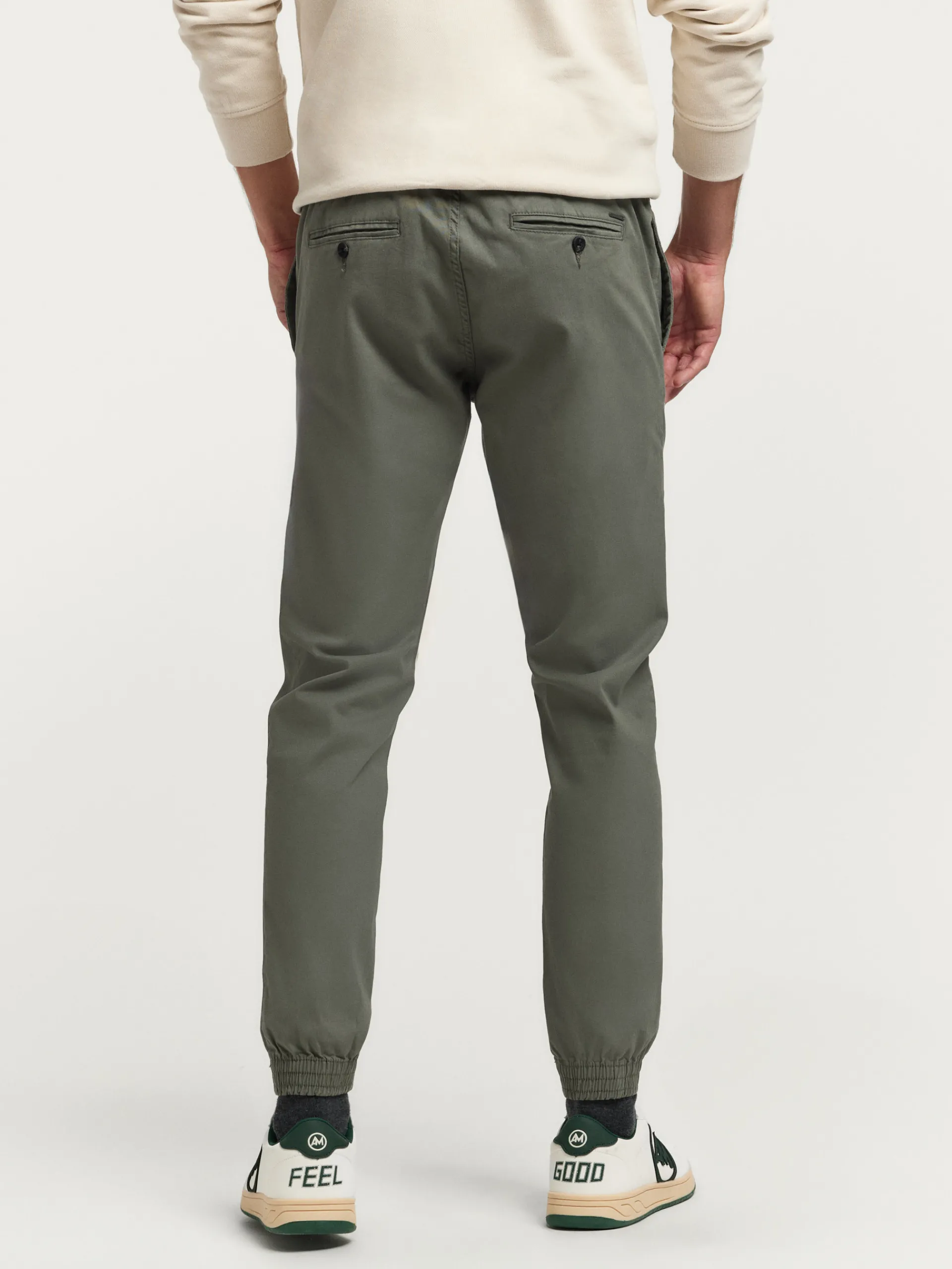 Pantalón con cinturilla elástica ajustable por cordones al tono y bajo con terminación de puño elástico. Cierre central mediante botón y cremallera, dos bolsillos en la parte delantera y dos en la parte trasera con detalle personalizado sobre uno de ellos.