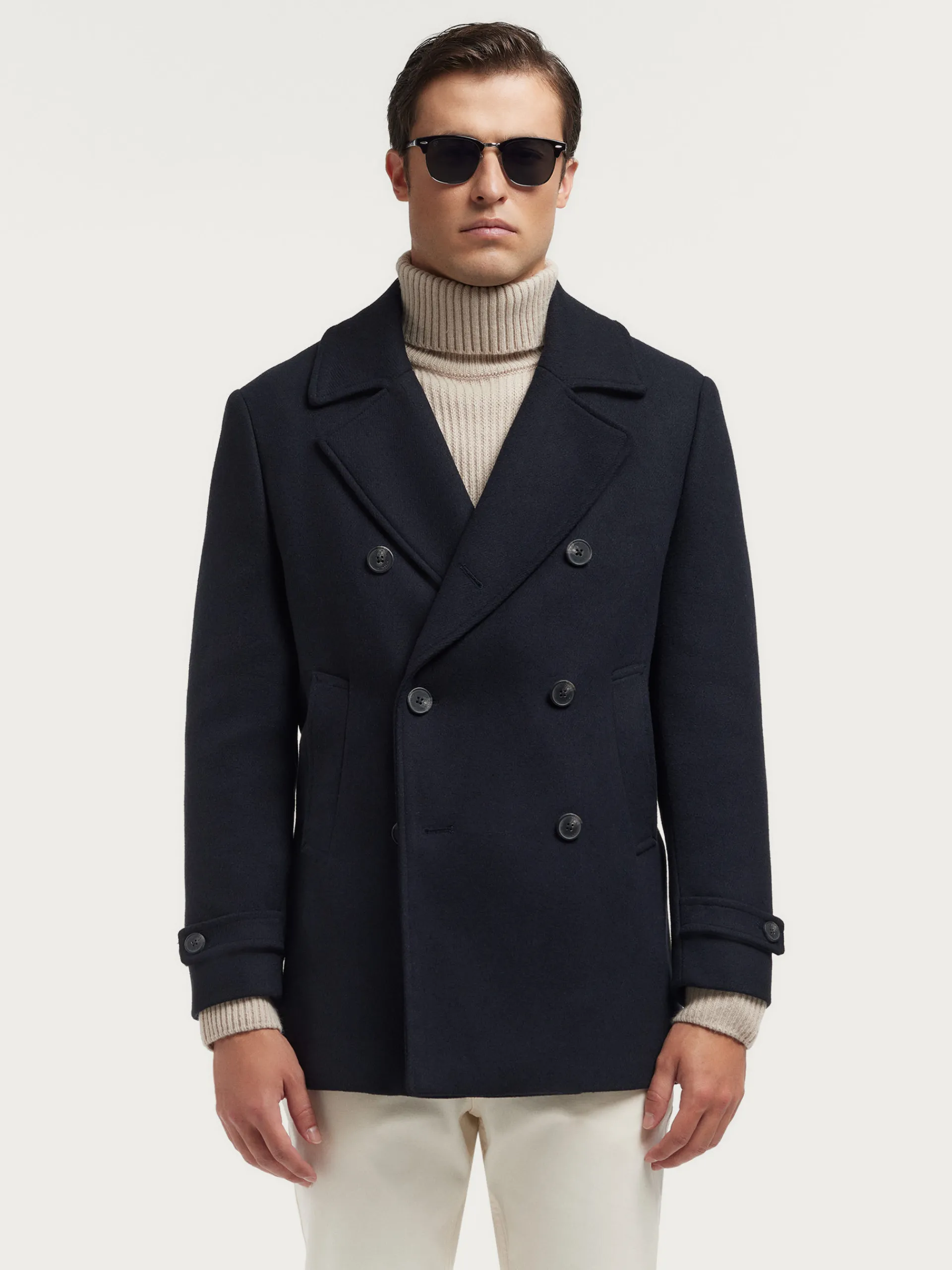 Abrigo de corte regular fit confeccionado en diferentes materiales de los cuales destaca la lana. Cuenta con cuello y solapa, cierre central cruzado, dos bolsillos en la cintura, abertura en el bajo de la espalda y detalle con dos botones en el puño de las mangas. Forrado en su interior con dos bolsillos.