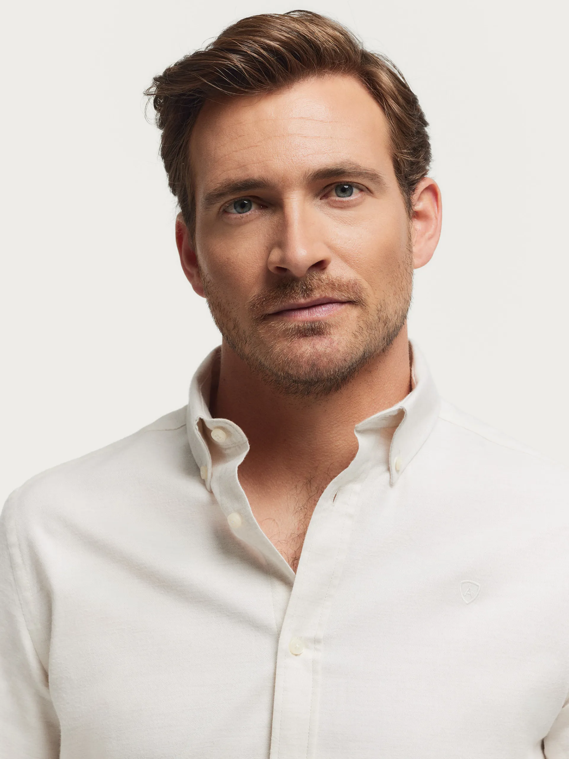 Camisa confeccionada en tejido de franela con cuello clásico de botón, manga larga con puños simples y logo de marca grabado en el frontal. Corte regular fit.