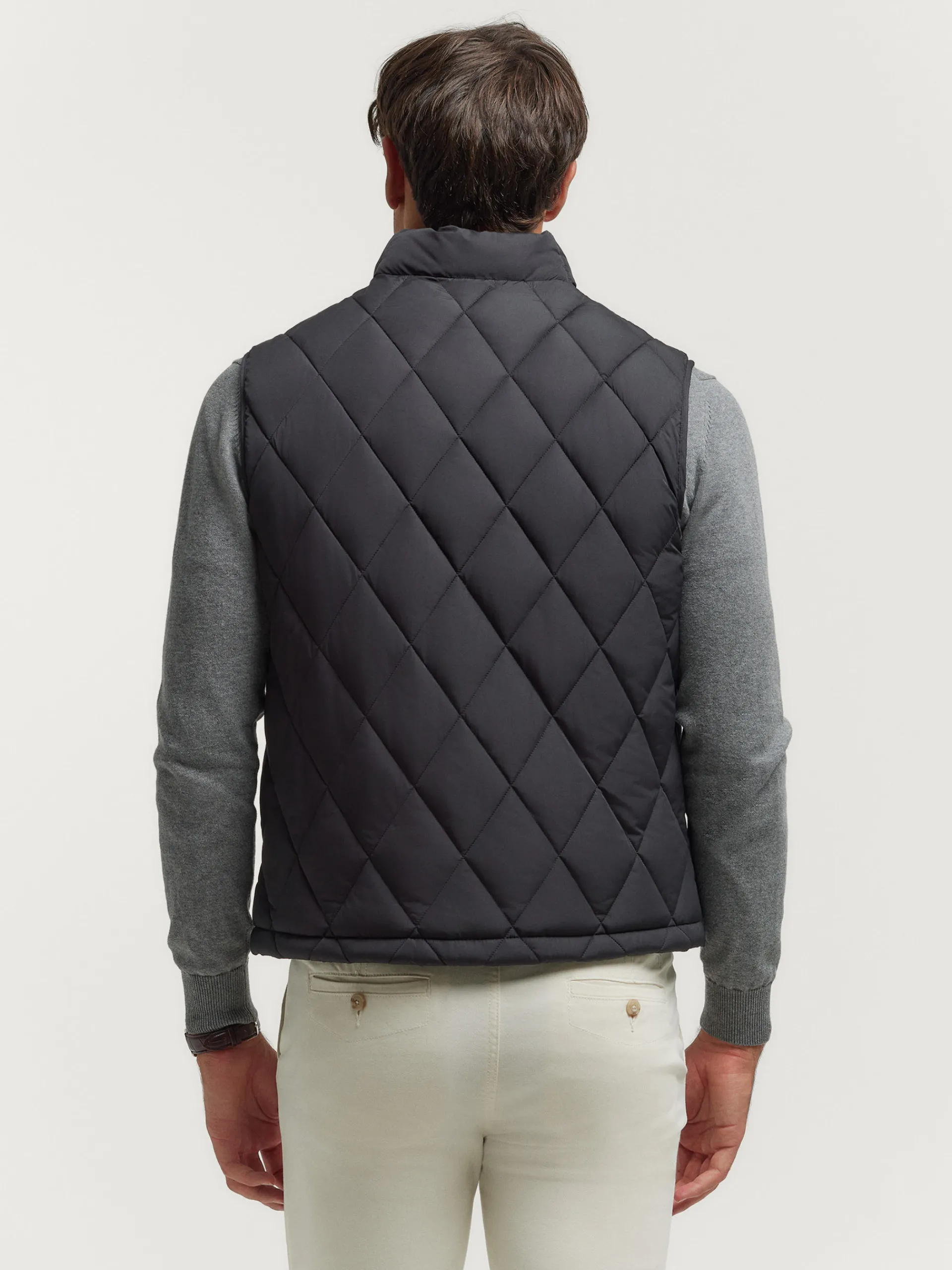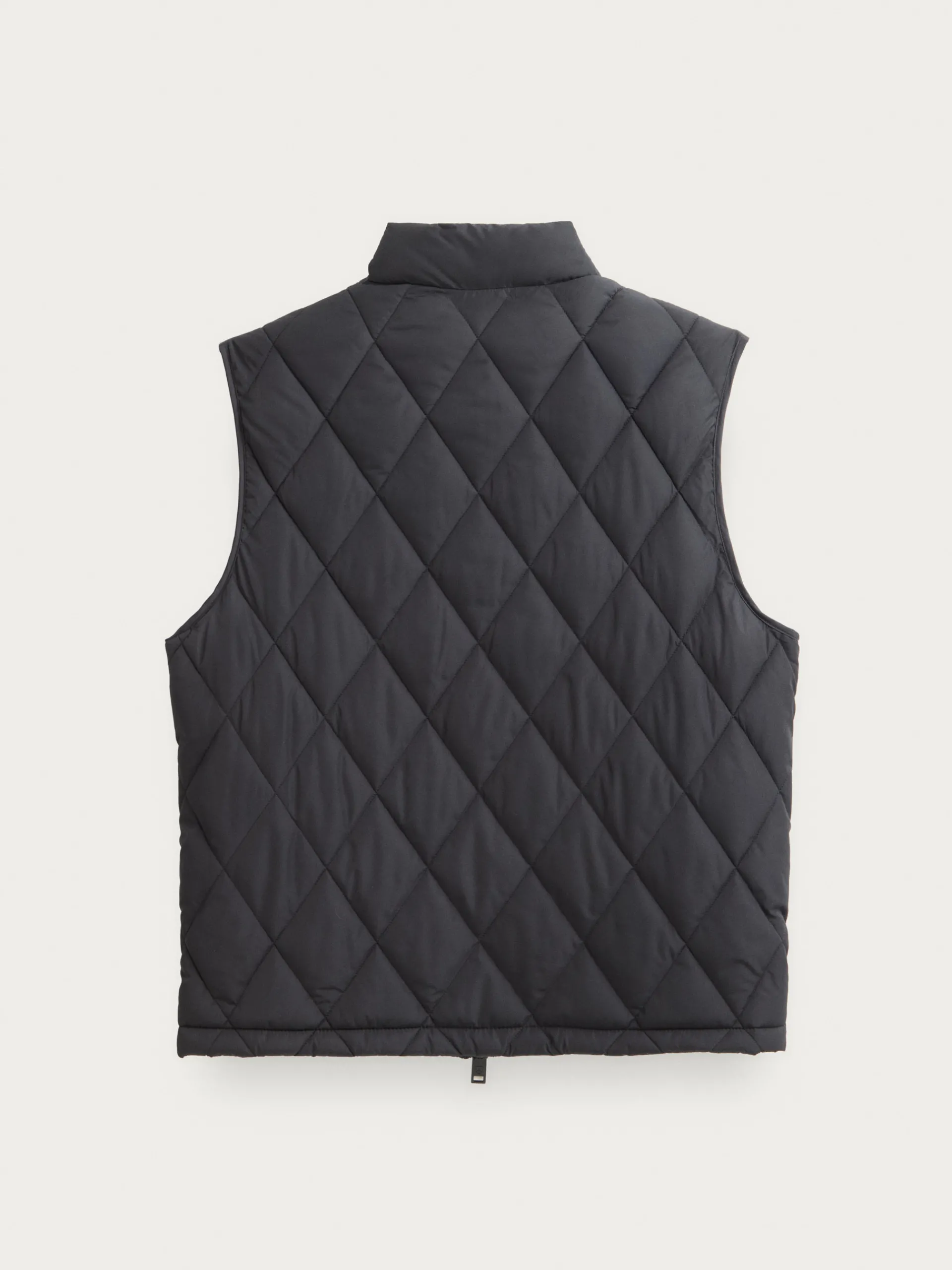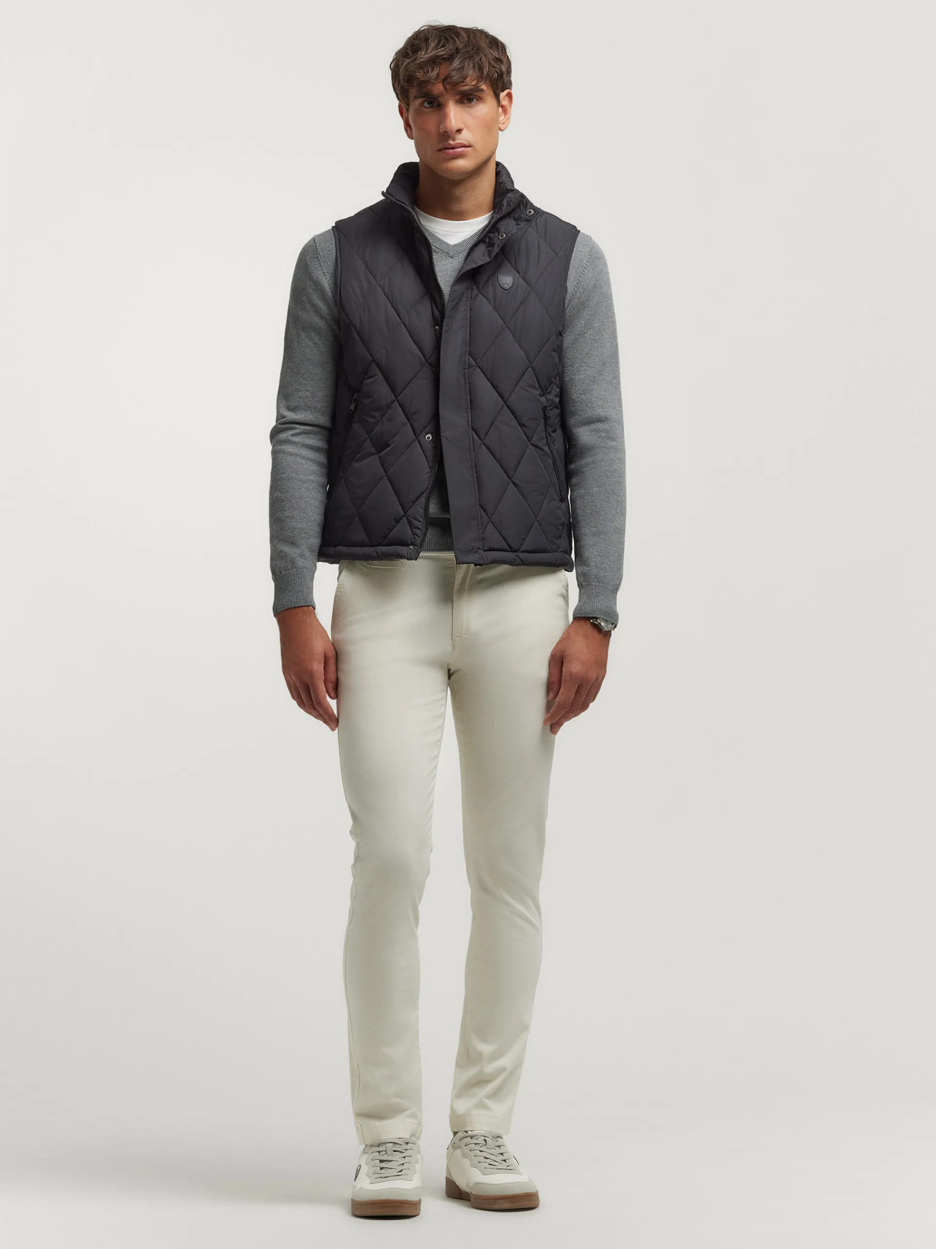 Chaleco con cuello alto y tejido en forma de rombos. Cuenta con cierre central mediante doble cremallera oculta por tapeta de botones a presión, logo de la marca grabado al tono en el frontal y dos bolsillos a la altura de la cintura. Corte regular fit.