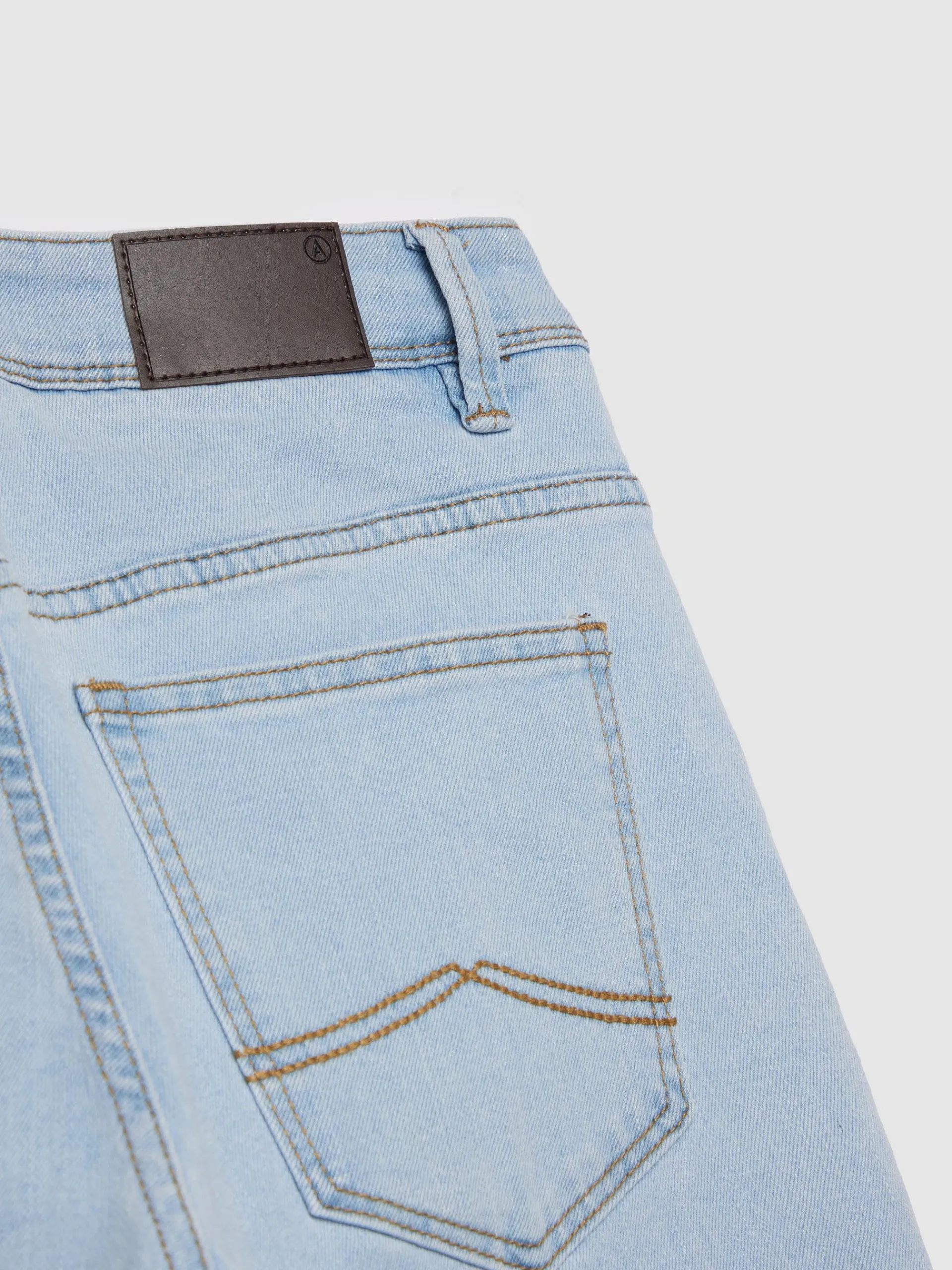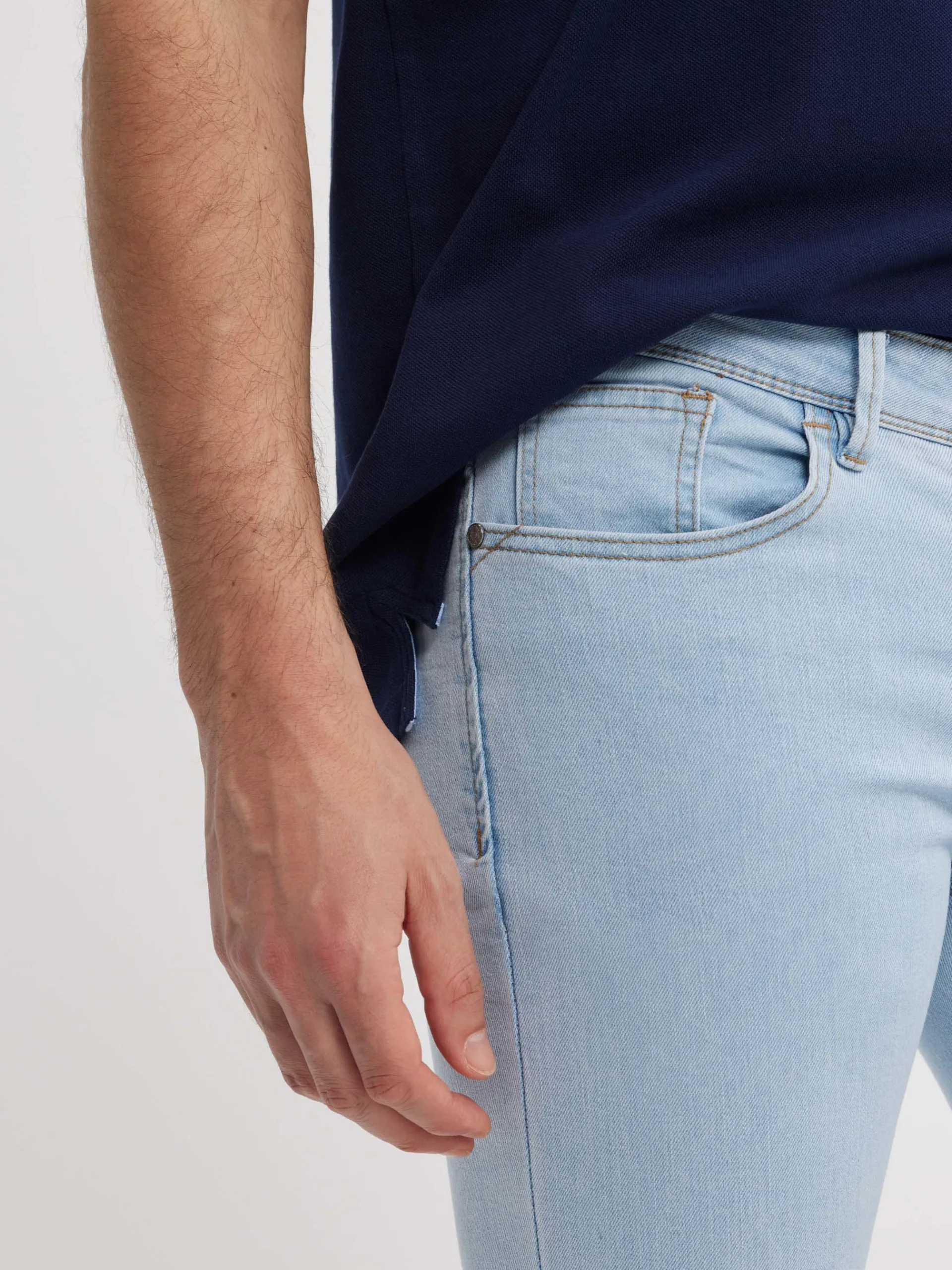 Pantalón denim de corte slim fit con cinco bolsillos y cierre central mediante botón y cremallera, pespuntes en color camel, fornituras personalizadas y etiqueta en efecto piel en la cinturilla.