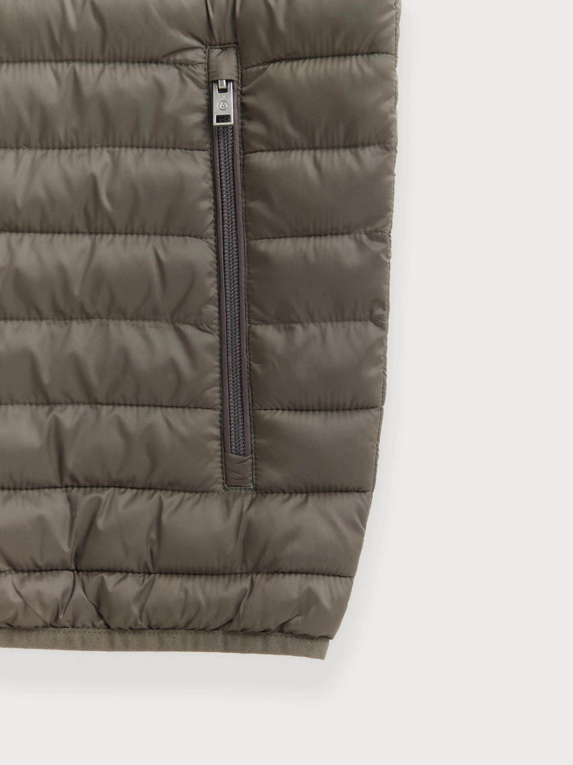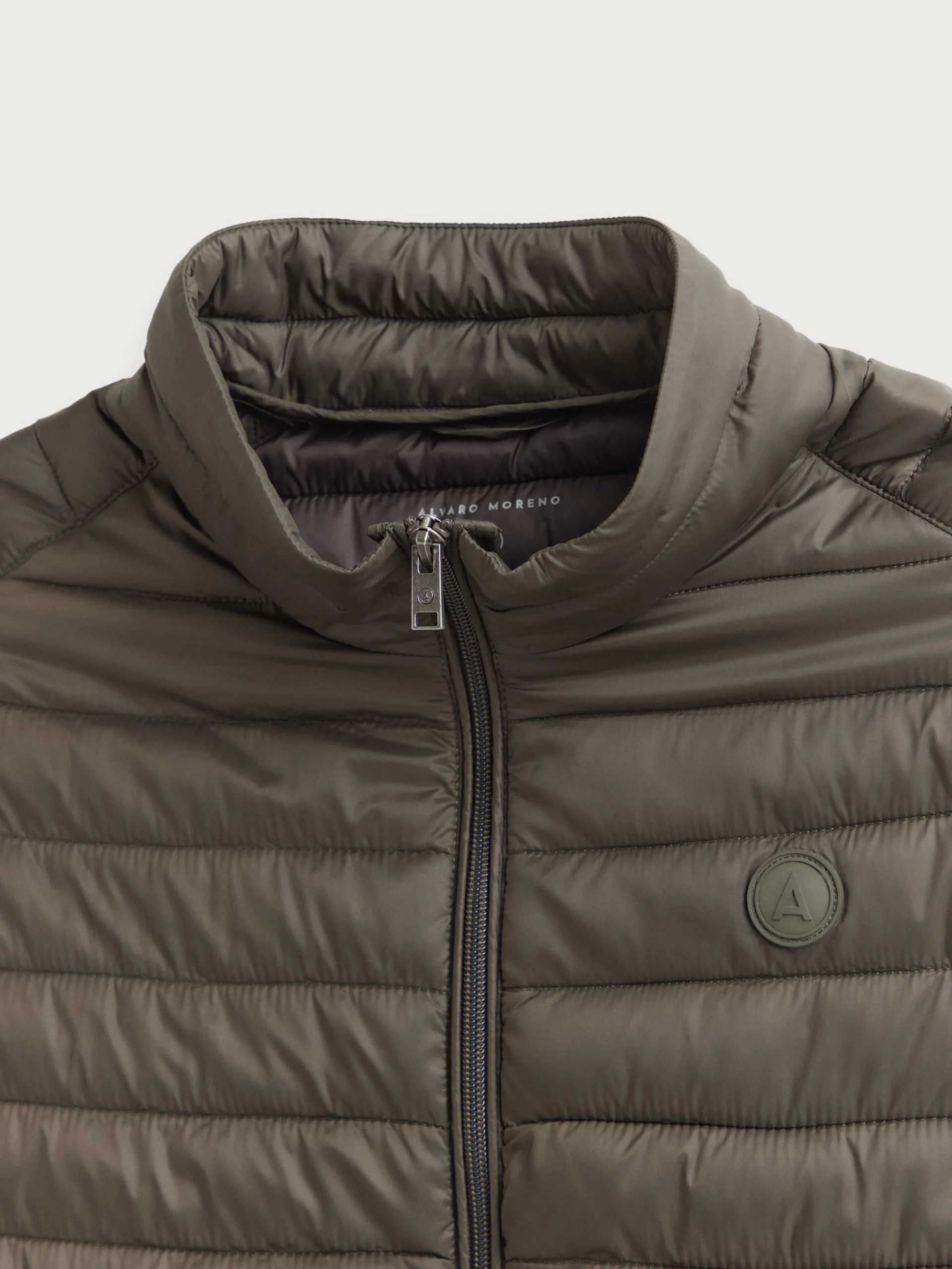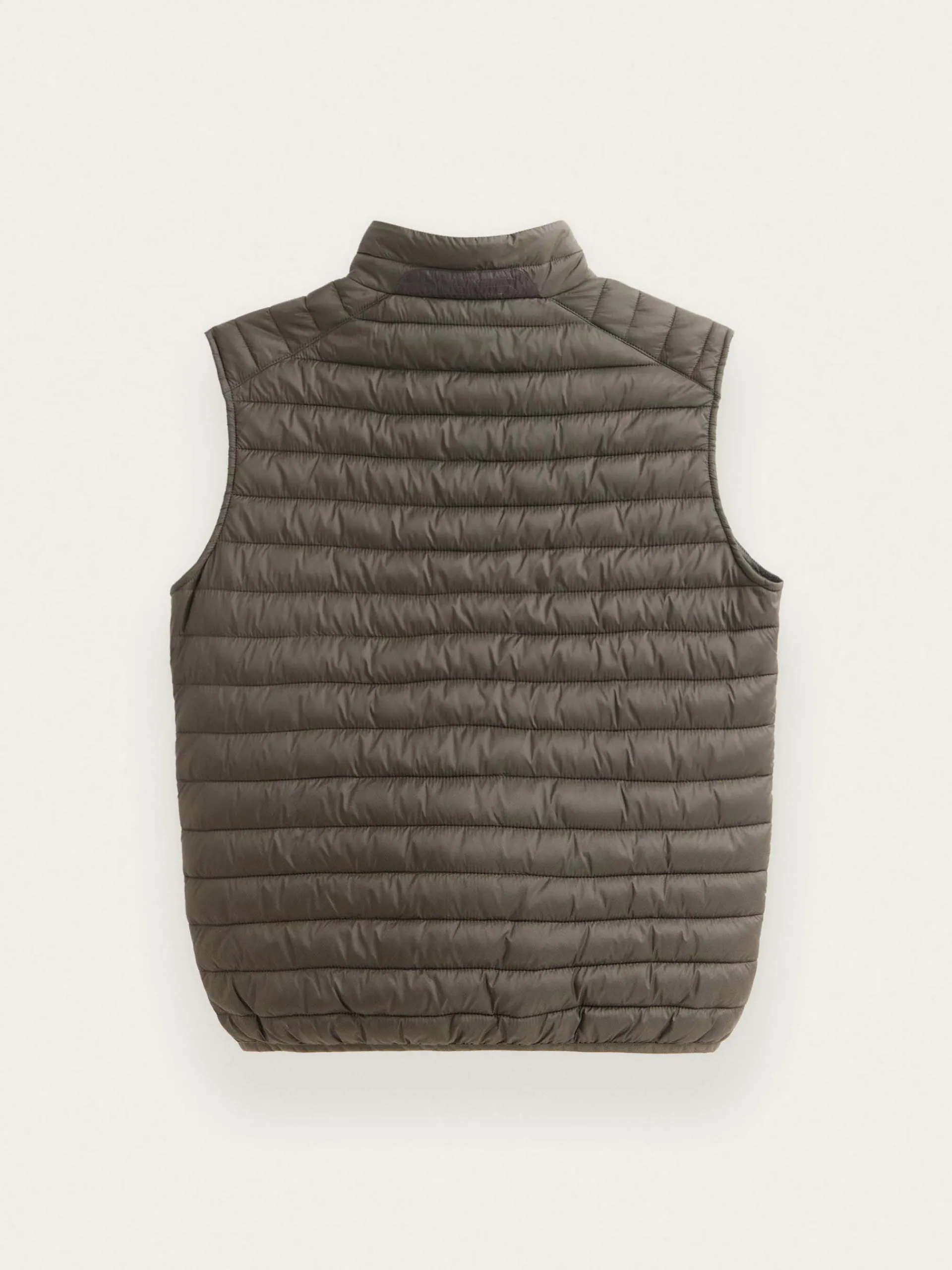 Chaleco acolchado con cuello subido. Cierre central mediante doble cremallera, dos bolsillo a la altura de la cintura y logo de la marca grabado en el pecho. Elástico en la sisa y cintura. Detalle a contraste en la parte trasera del cuello.