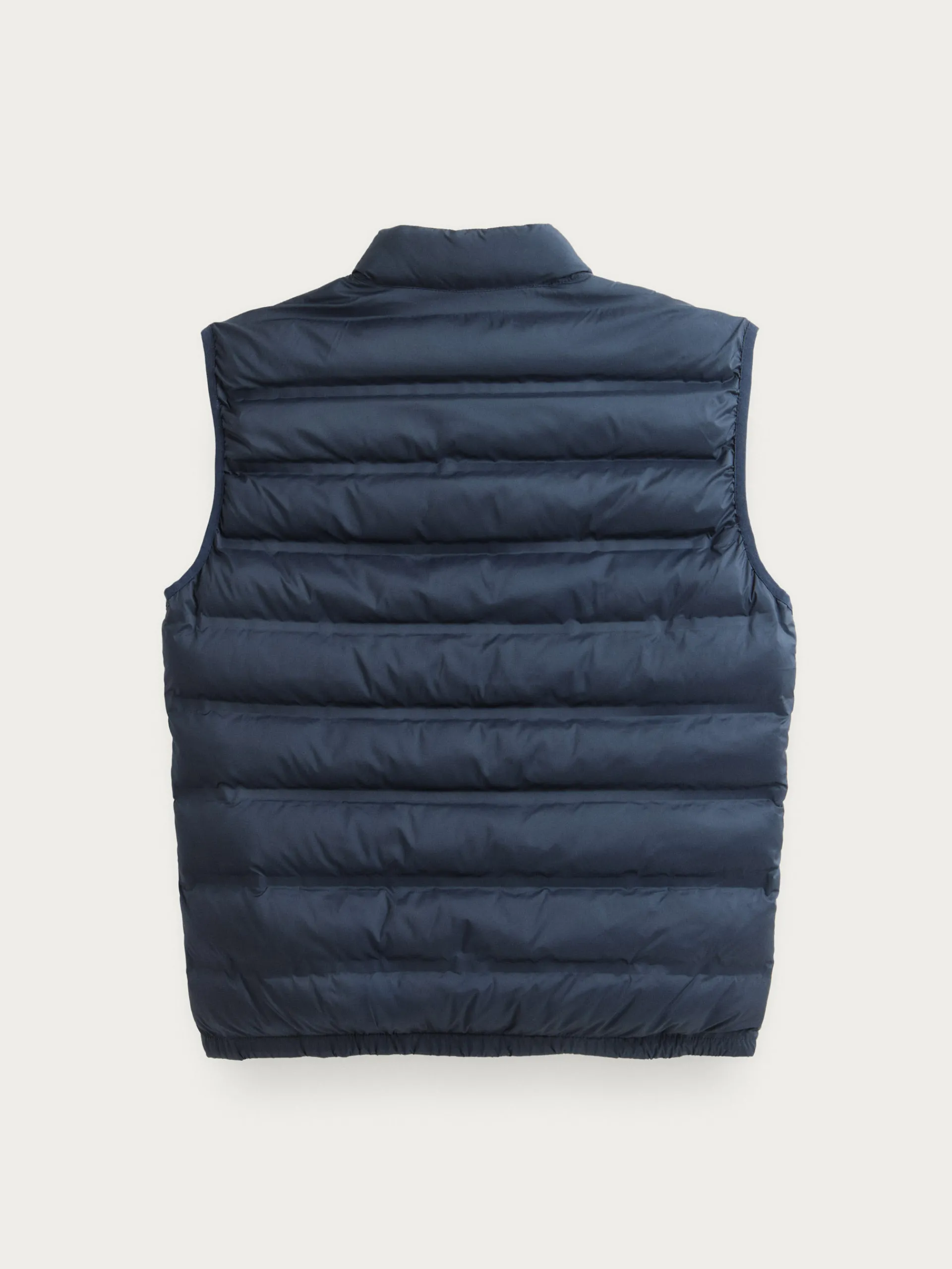 Chaleco acolchado con cuello subido y cierre central mediante cremallera, dos bolsillos a la altura de la cintura y logo de la marca grabado en el pecho al tono. Elástico en la sisa y cintura. Forro interior a contraste con bolsillos.