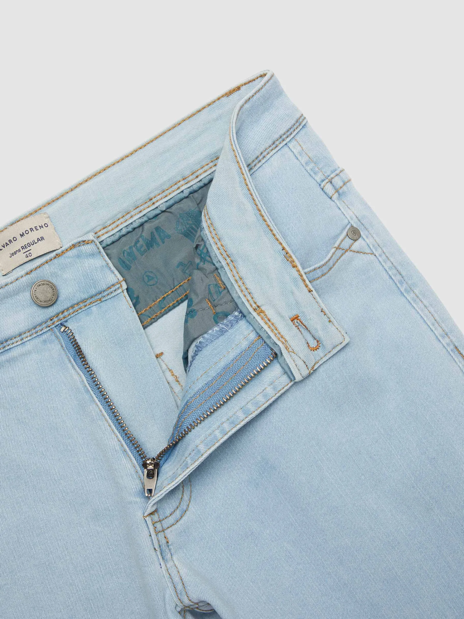 Pantalón denim de corte regular fit con cinco bolsillos y cierre central mediante botón y cremallera, pespuntes en color camel, fornituras personalizadas y etiqueta en efecto piel en la cinturilla.