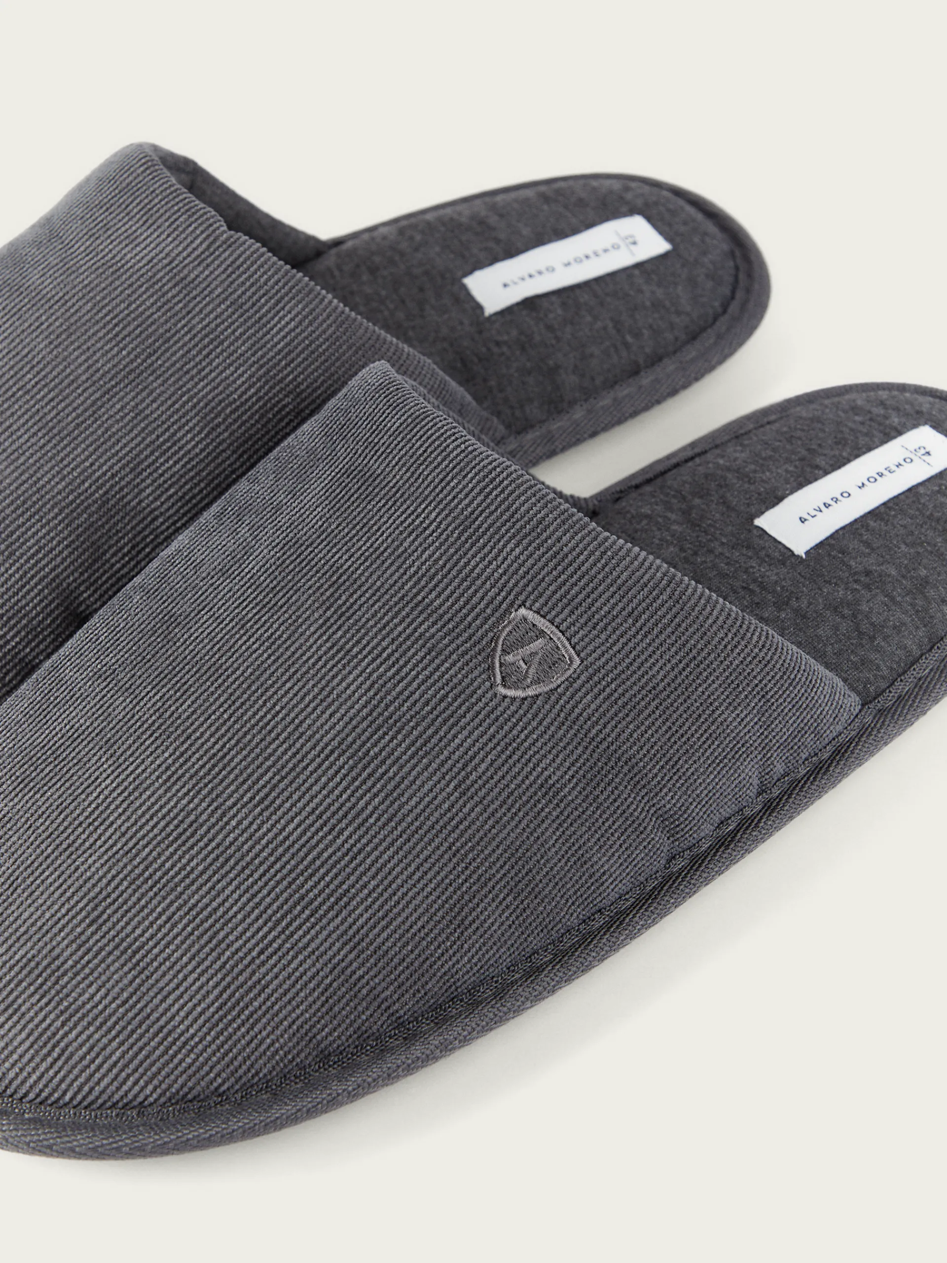 Zapatillas de estar por casa con diseño de pana en su exterior. Interior forrado en algodón aportando calidez y suela de goma.